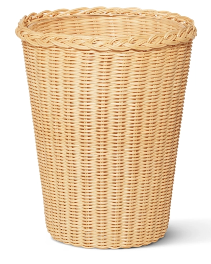 This large rattan vase was inspired by a vintage basket and is crafted using a traditional artisanal close-weave technique. Its natural hue is truly versatile, adding warmth and an organic touch wherever it is placed. It contains a glass vessel within the woven frame to allow for an arrangement of fresh flowers.
