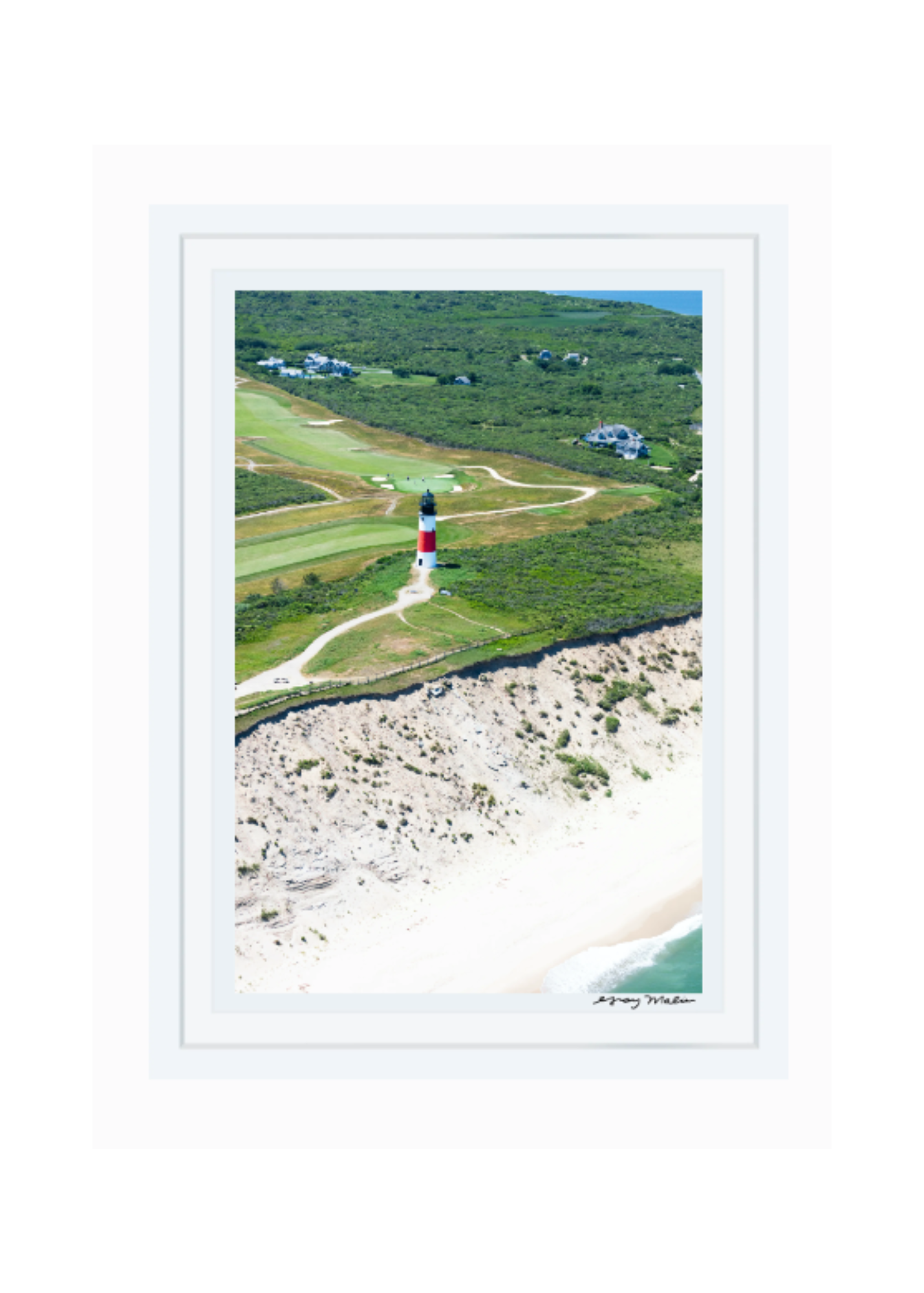 Take in the captivating aerial view of the historic SANKATY HEAD LIGHTHOUSE, NANTUCKET with a stunning view of the golf course and Sconset Bluff from Gray’s popular Å la Plage series.