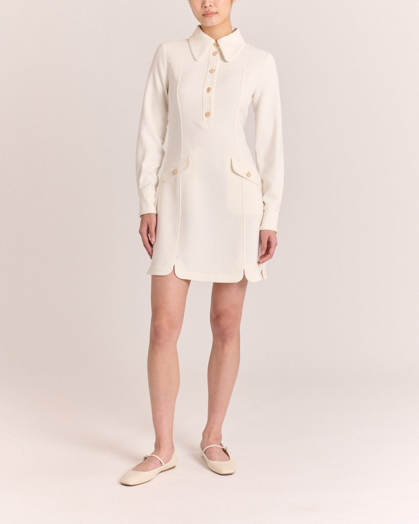 A shirtdress that nods to vintage tailoring, this crepe style is soon to be wardrobe staple. With a rounded collar, enamel buttons, and tall cuffs, it’s a piece made for weekdays that flow seamlessly into evenings.