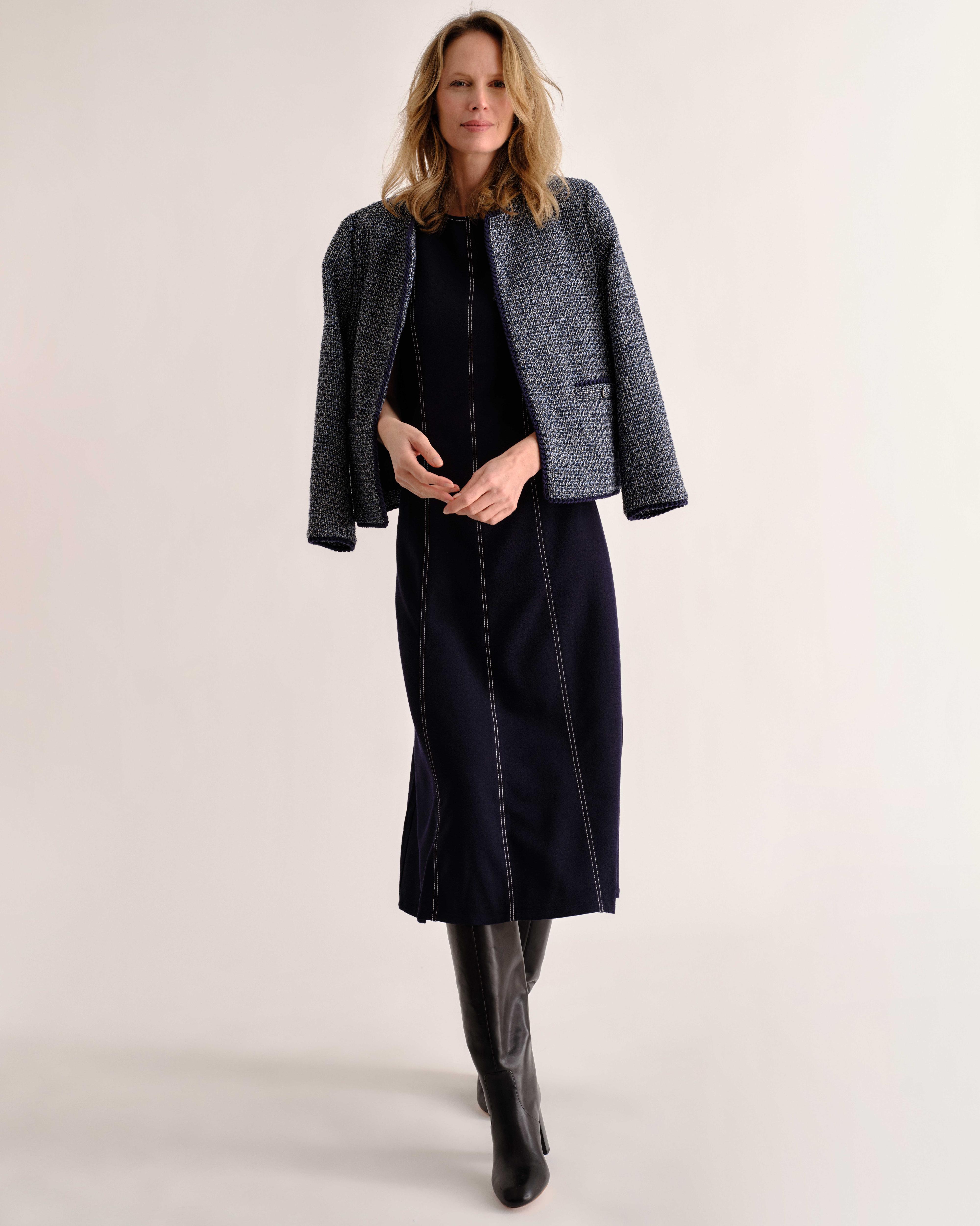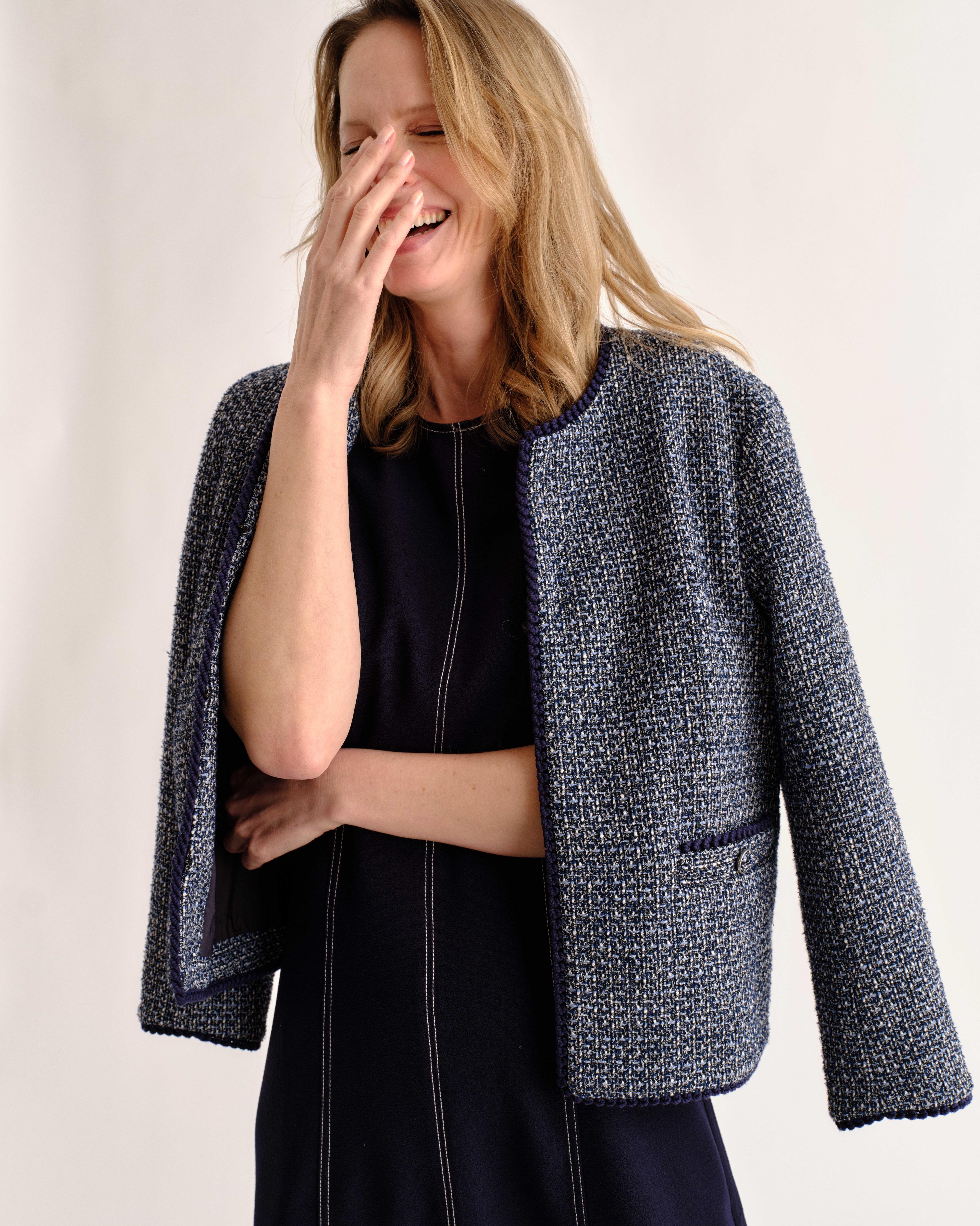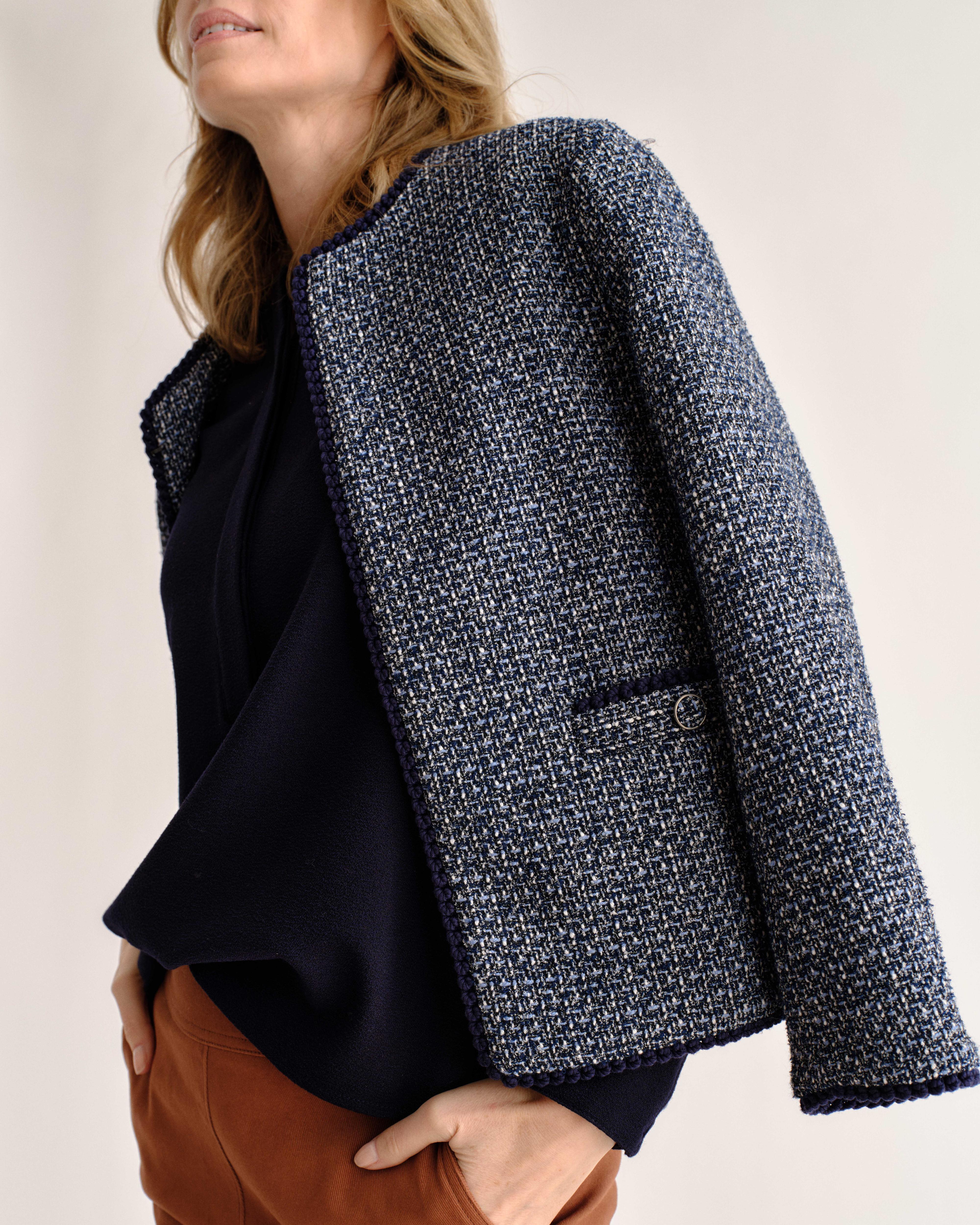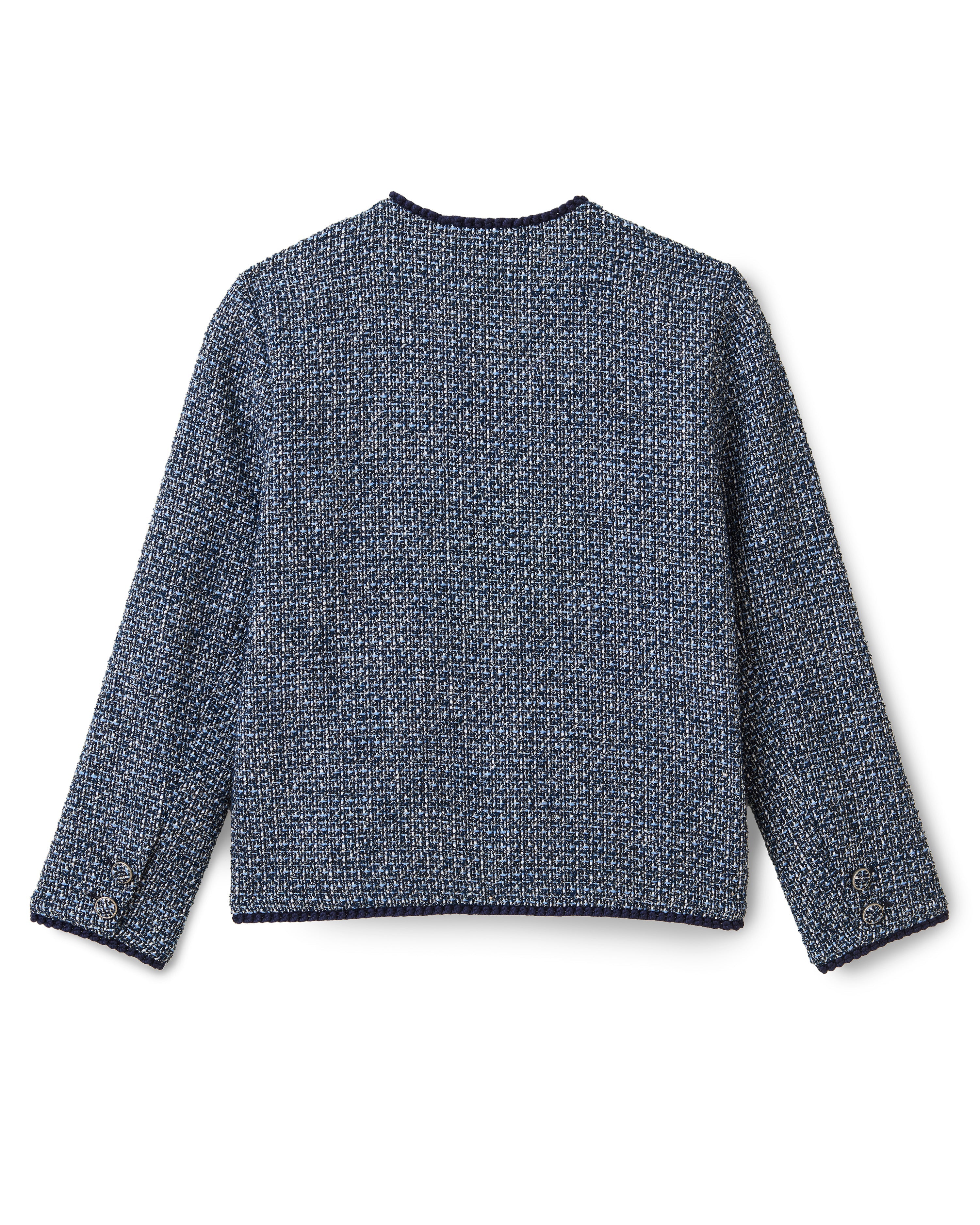 The beloved Louisa jacket returns in Blue Melange tweed. Pair as a matching set with the Lane dress for an elevated lady-like look or dress up jeans and a tee for an elevated casual pairing.