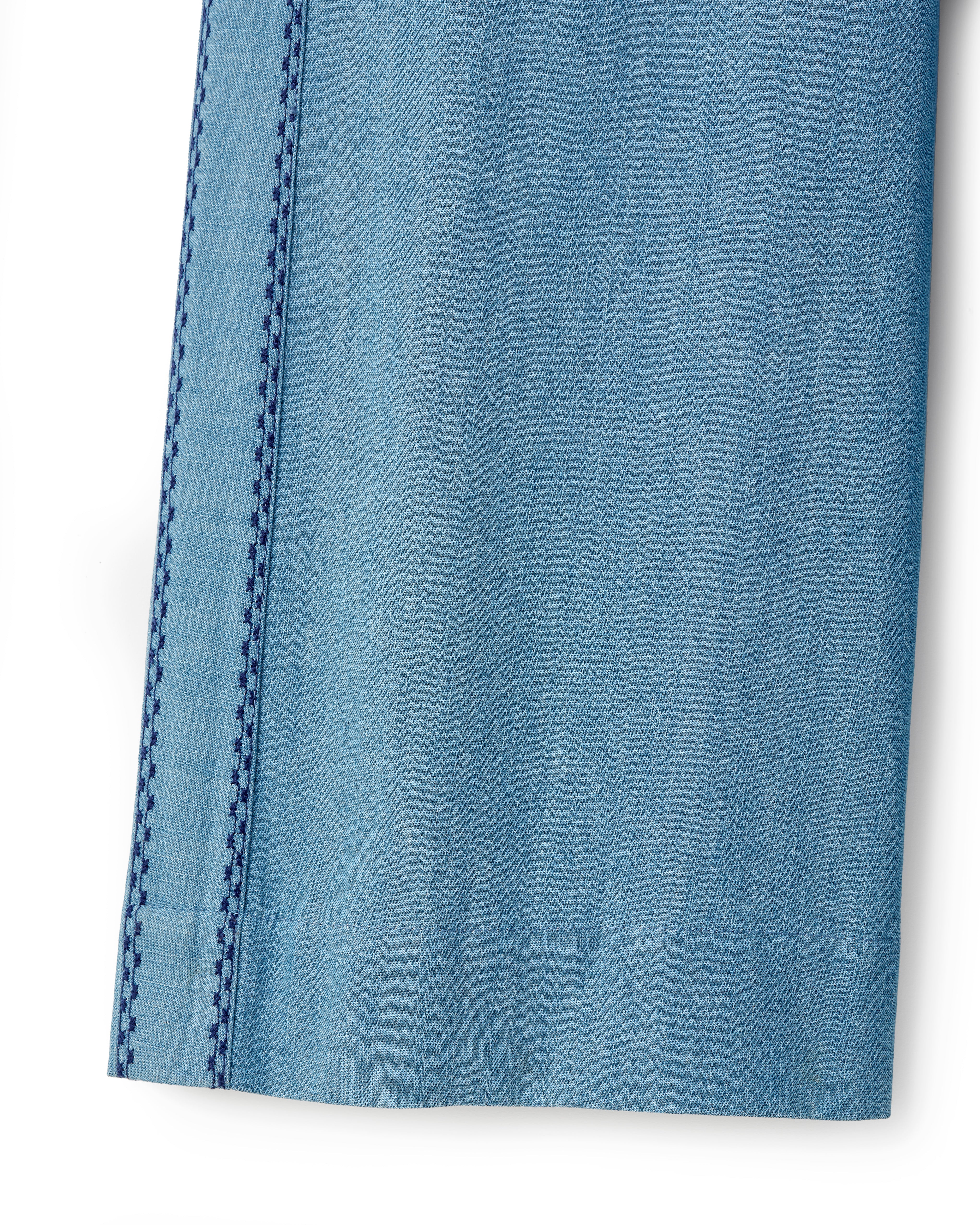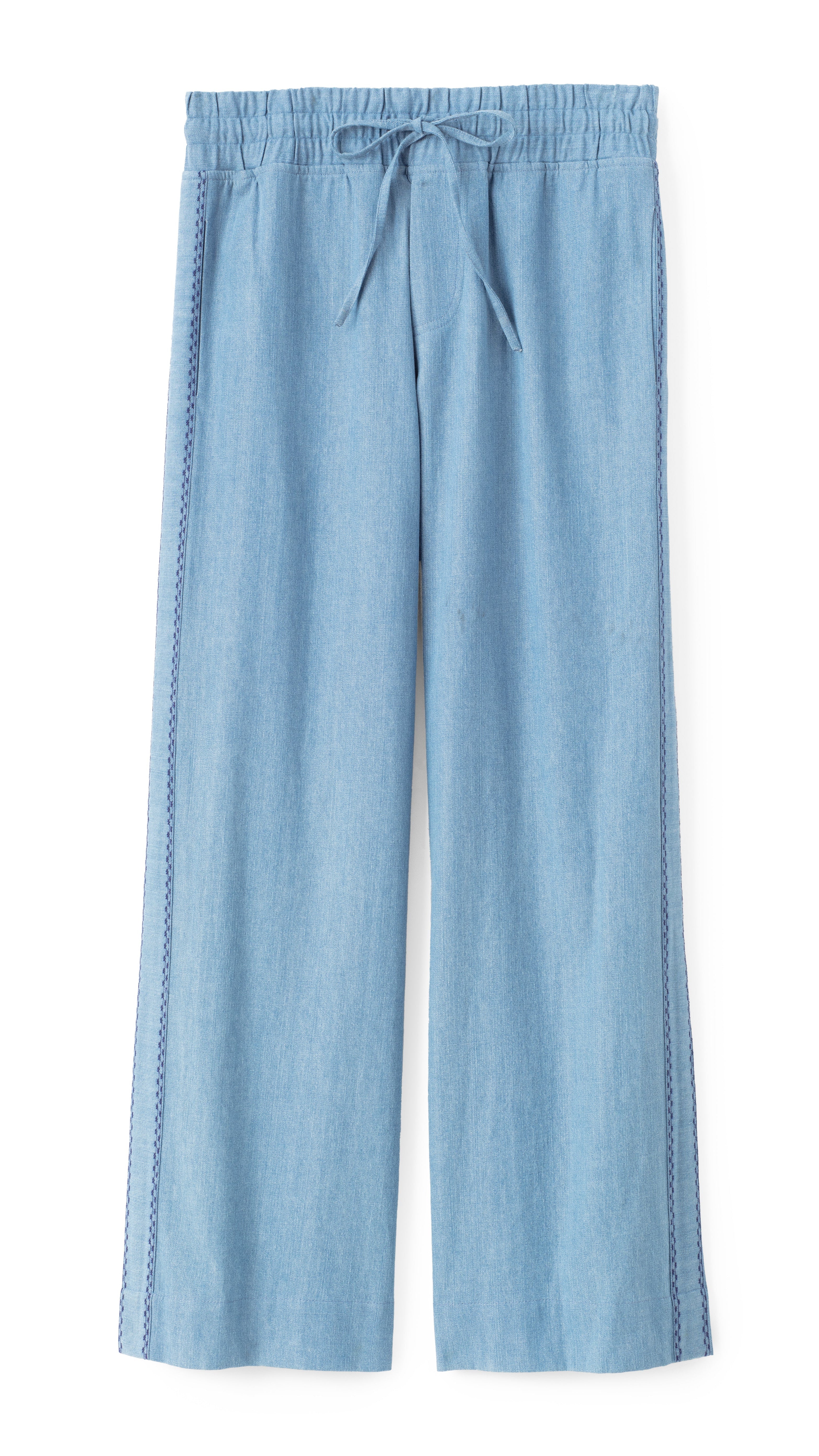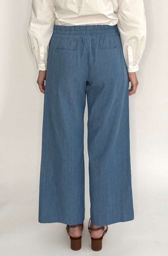 The Isla Pant in Washed Blue Chambray evokes the ease of a coastal getaway—lightly