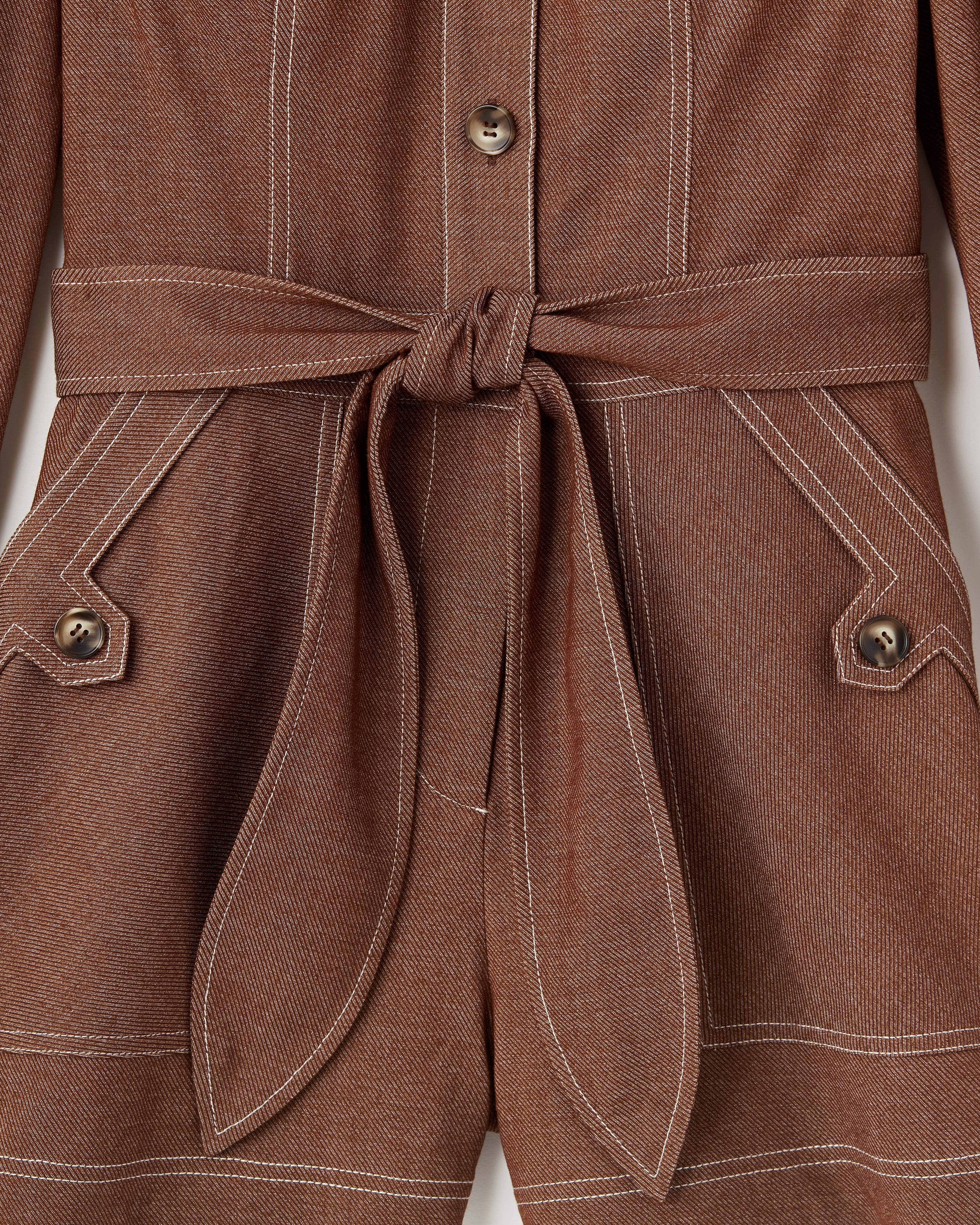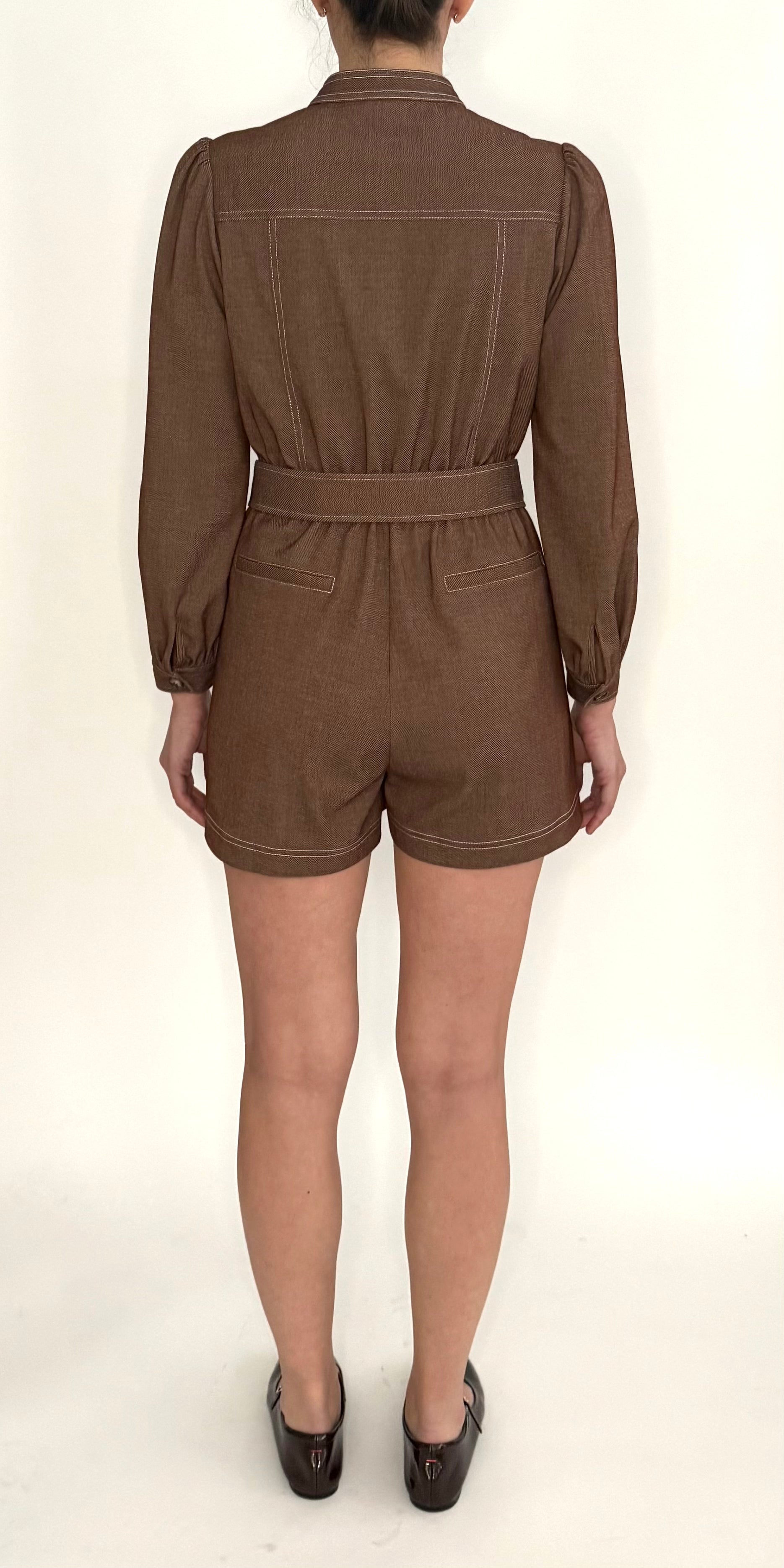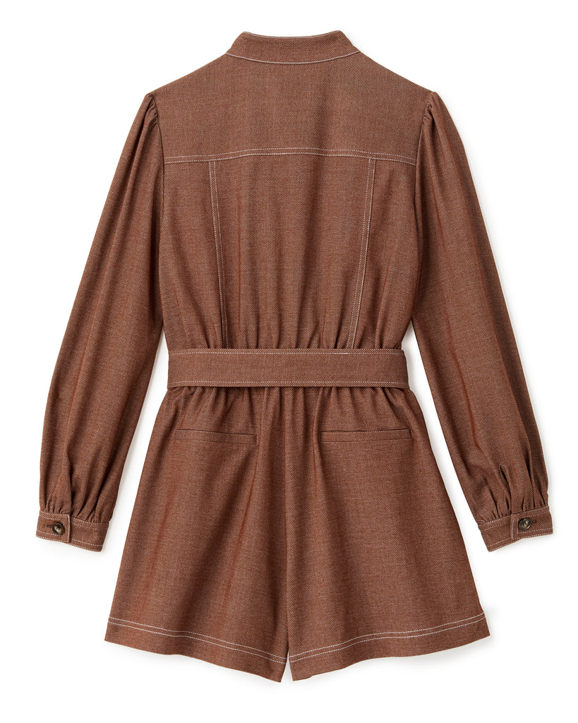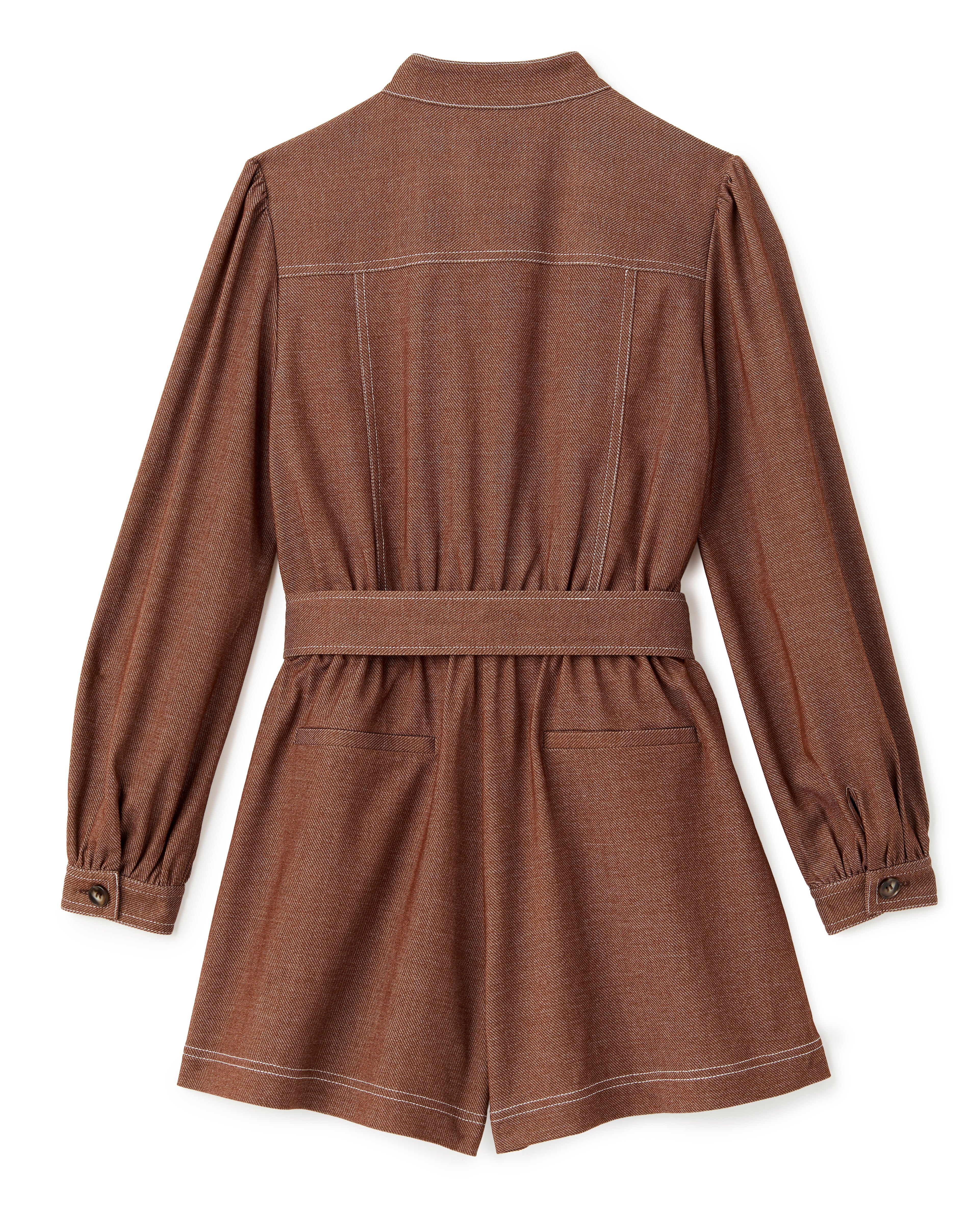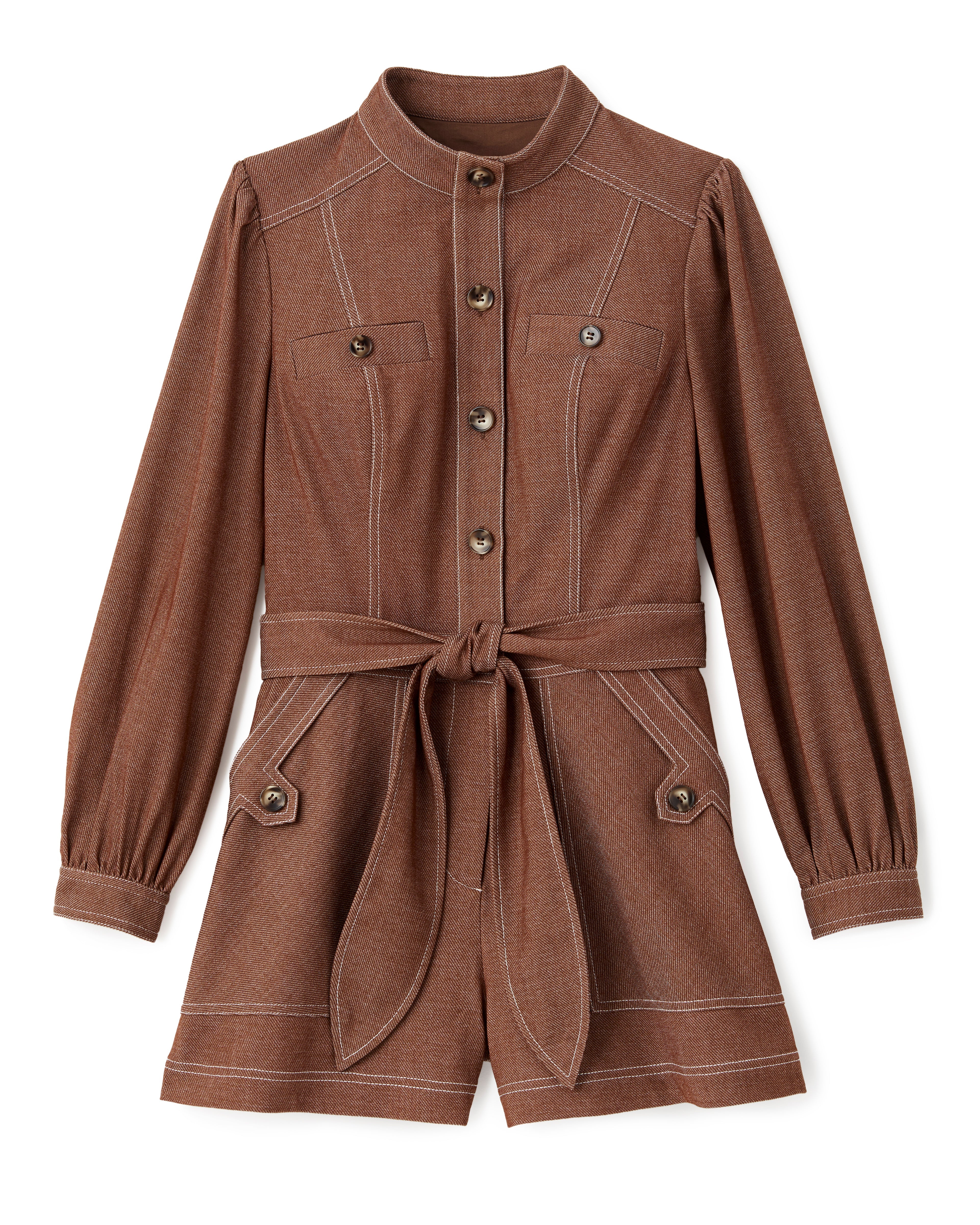 The Rachel Romper in Mocha evokes an effortless romance—softly tailored lines, subtle