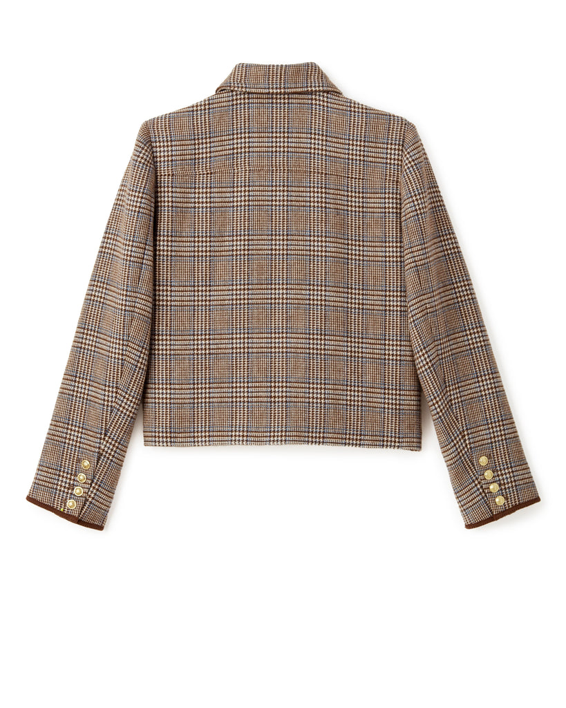 - Textural Depth: Multicolor wool-blend plaid with braided contrast trim
