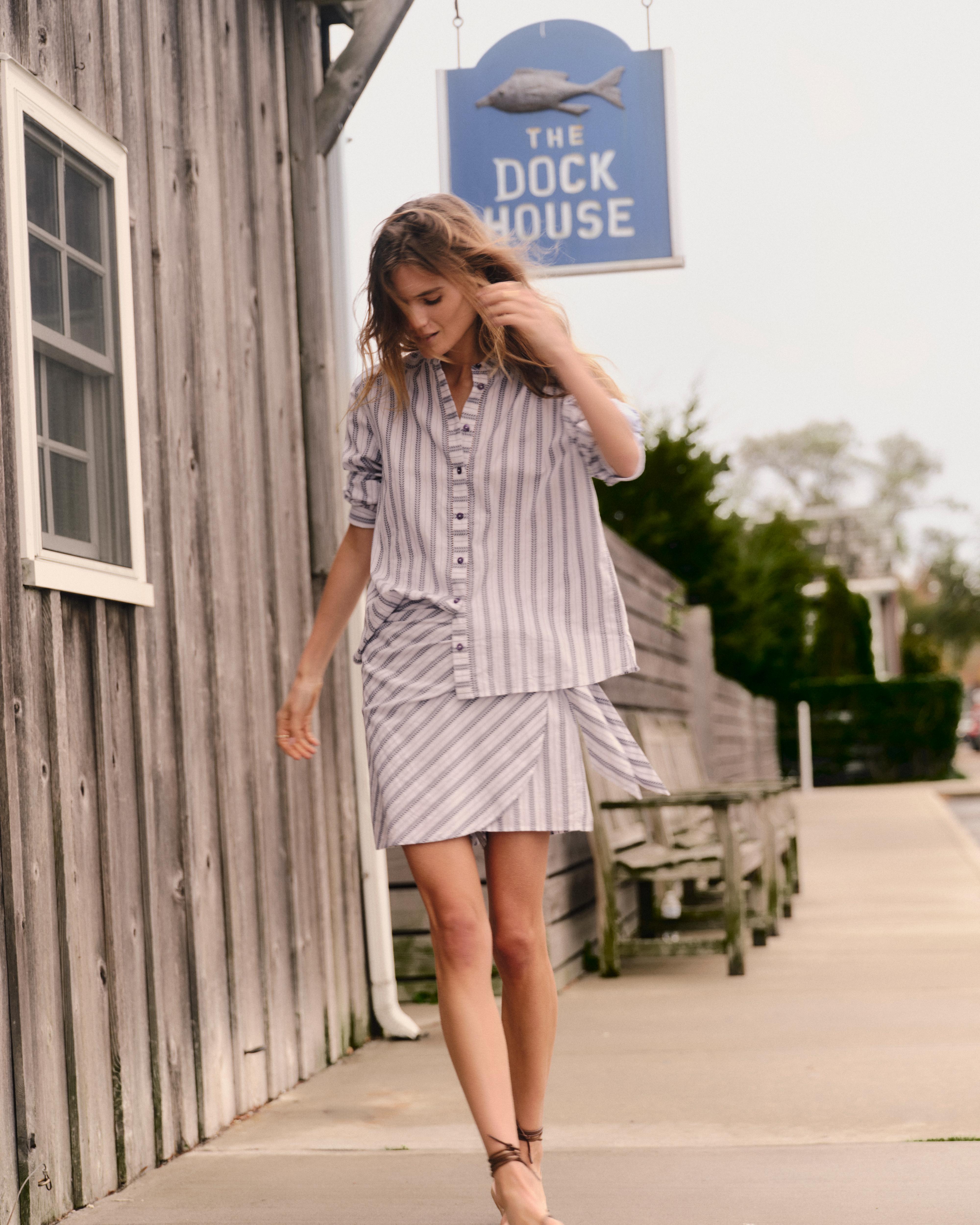 Our new Maris wrap mini with hidden undershort in cotton voile with jacquard vine stripe is sure to please. A perfect matching set with the Rosalie shirt for an elevated weekend look.