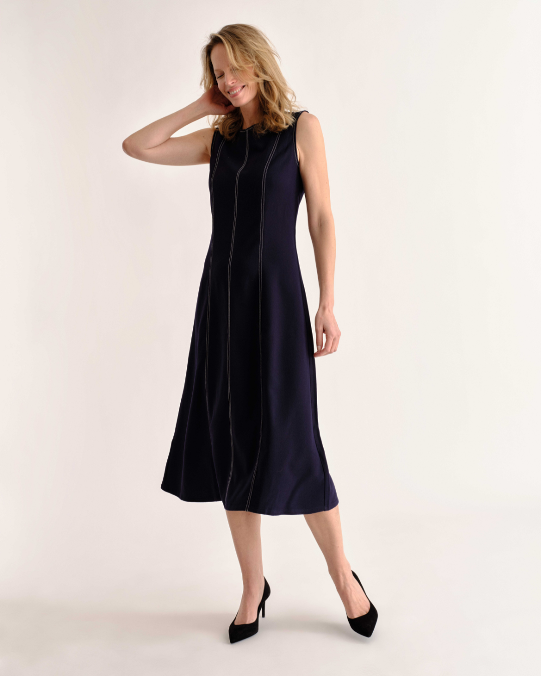 This rayon blend, pebbled texture crepe is our favorite transeasonal fabric and new wardrobe staple. The midi length Rain dress touts contrast vertical seams perfect for work to dinner.