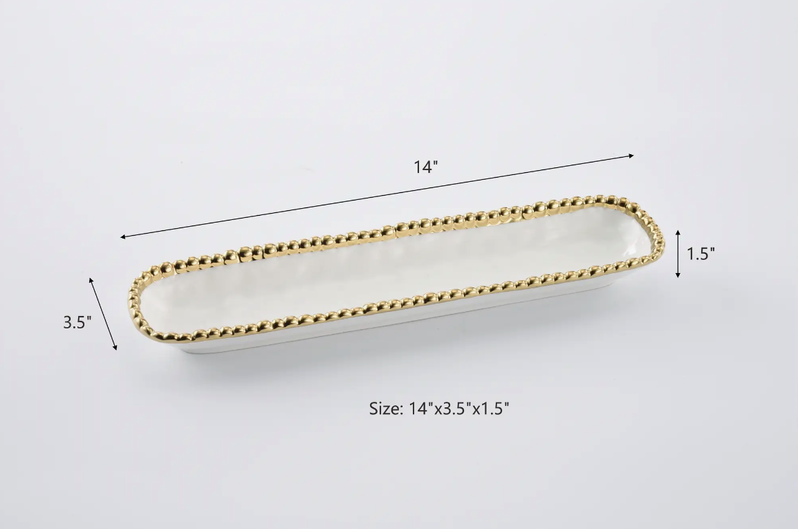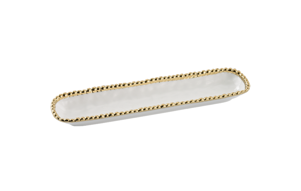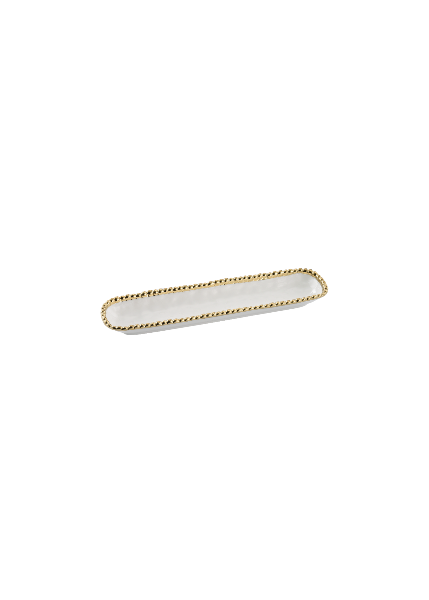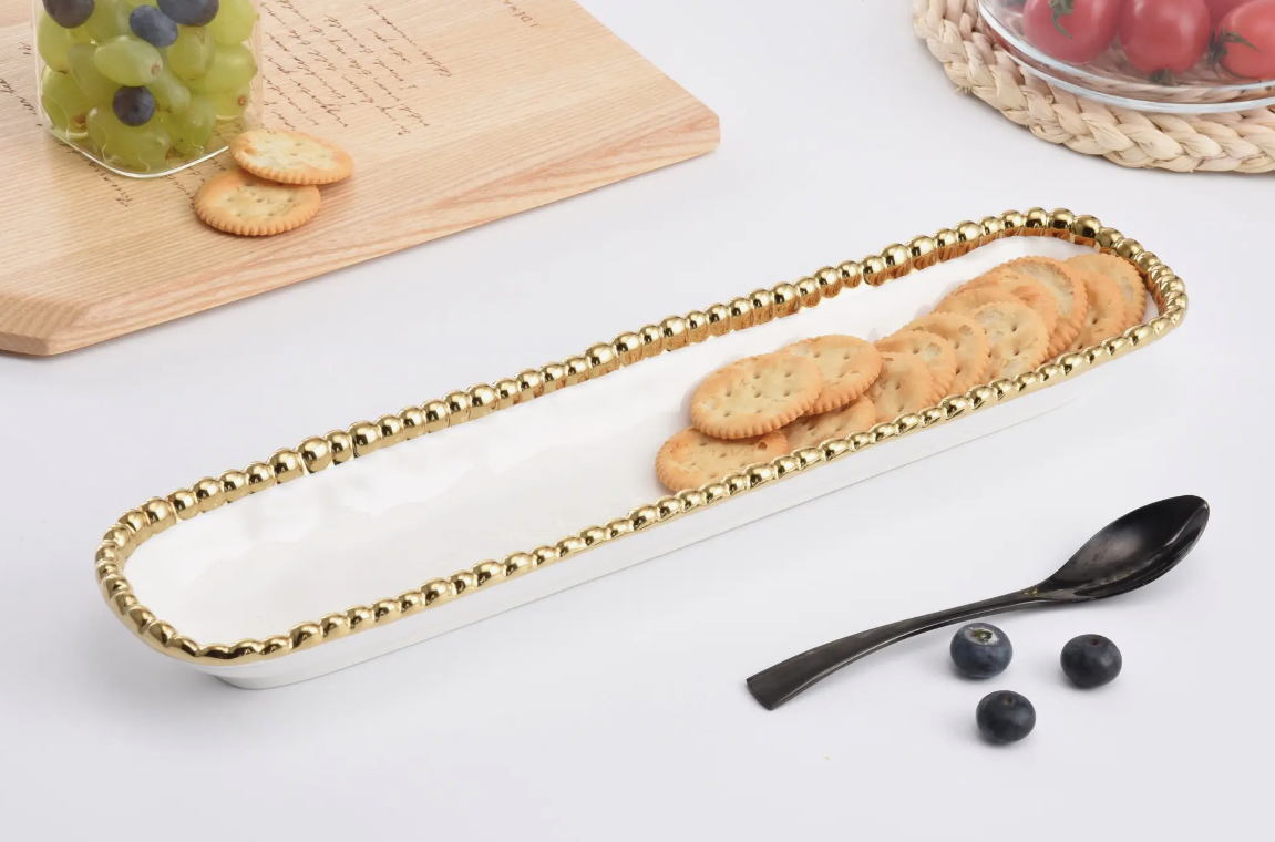 Cracker tray in Golden Salerno. Perfect for crackers, small cookies and other small treats. Gleaming white porcelain with lustrous gold beads in titanium. Food safe. Dishwasher safe. Oven safe to 550°. Easy Care.