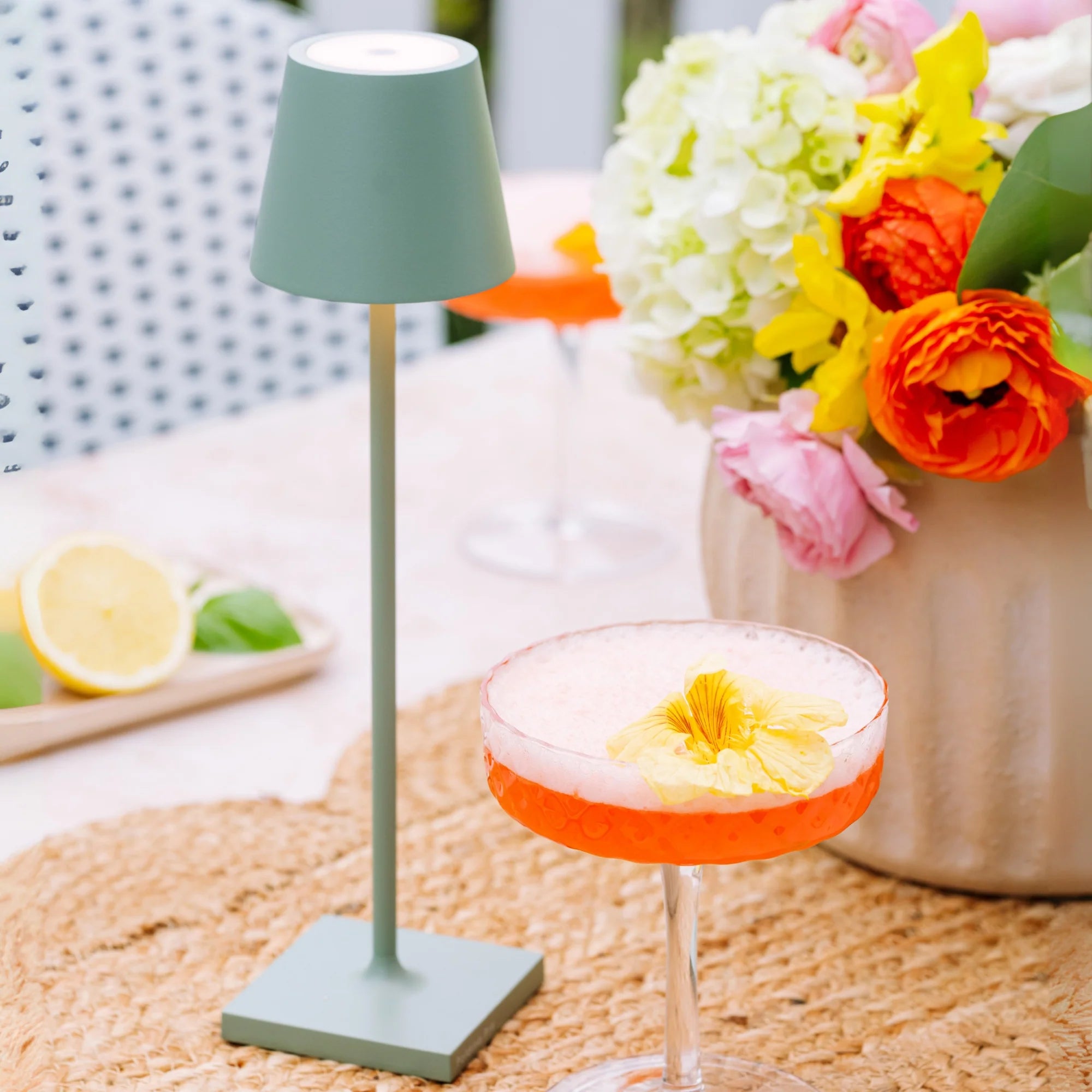 Cordless, rechargeable, battery table lamp. A touch control on the top of the lamp head allows you to switch the light on, adjust its intensity and select its color temperature.