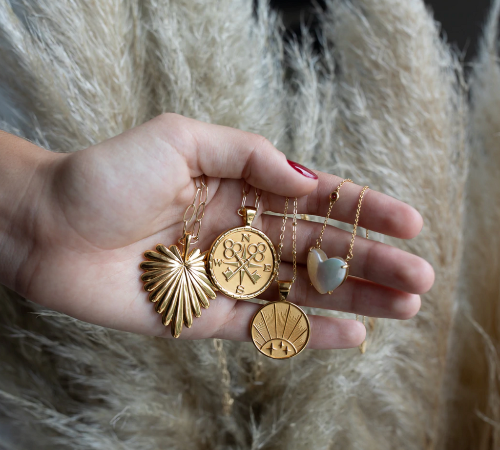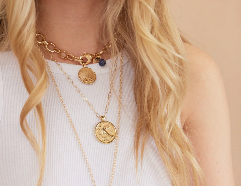 - Coin pendant made of sterling silver dipped in 14k gold, measuring 0.975" in diameter.