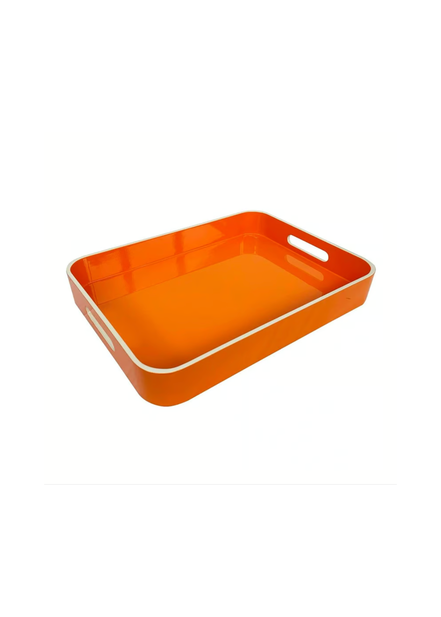 Beautifully crafted and perfect for serving your favorite cocktails, sharing light bites, displaying your beach picnic treats, or enjoying dinner in an unexpected spot. Our sleek lacquer trays offer endless possibilities for use. Crafted in an easy-to-maintain lacquer they are an everyday staple. Tangerine Orange with white highlighted edges.