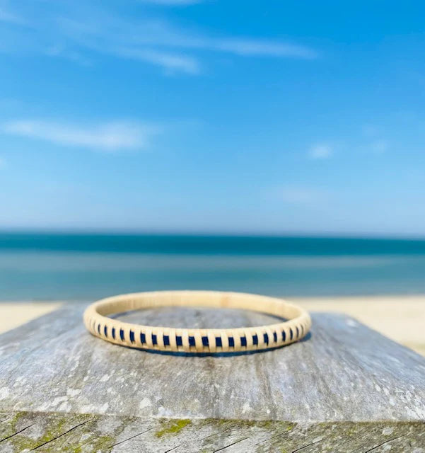 Our classic stacking bangle is woven with natural cane over a colored stave. With a 1/4" width, this bangle is perfect to stack with your favorite jewelry options, or to wear as a solo statement piece.