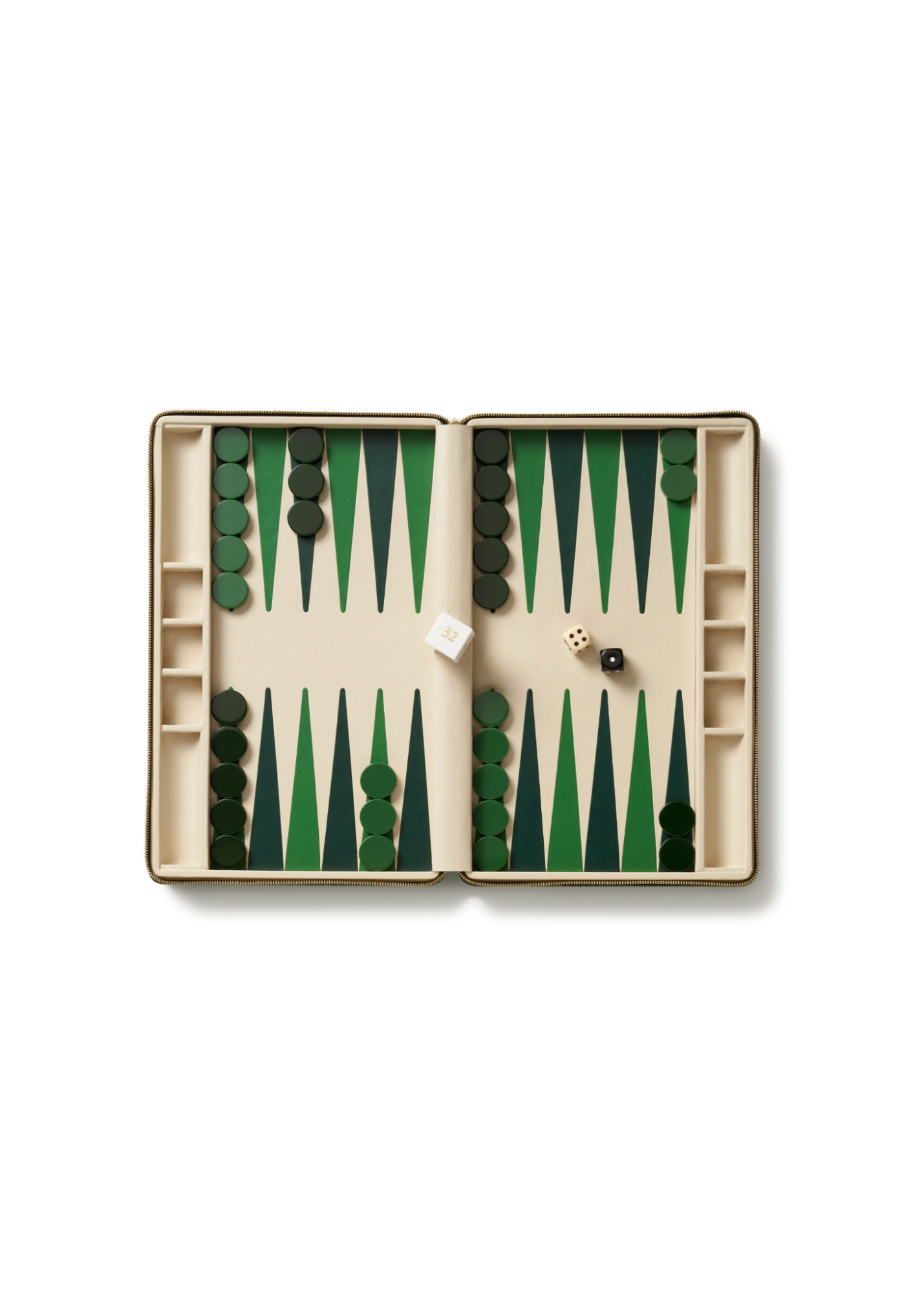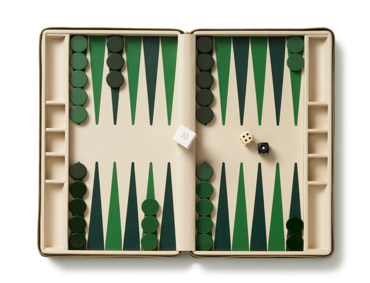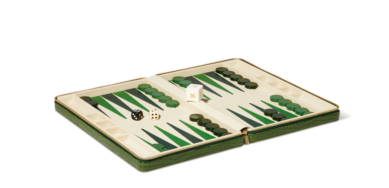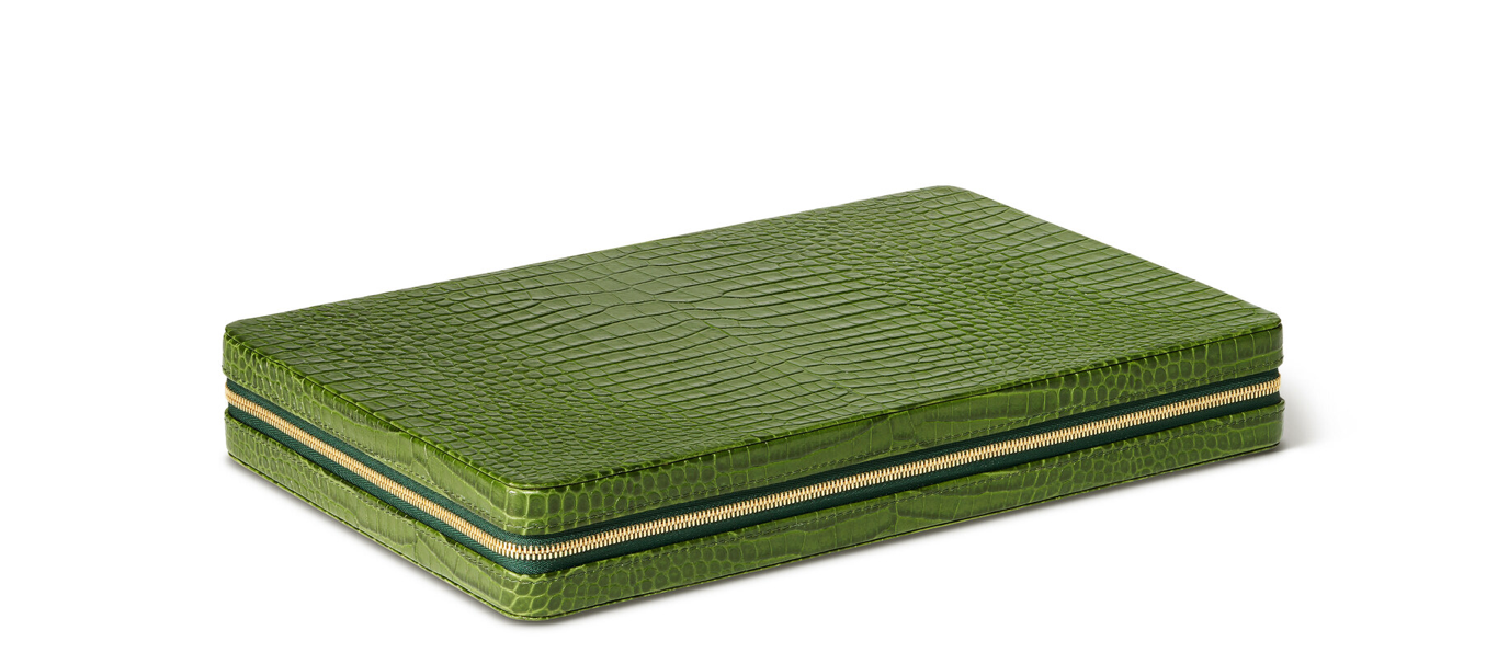 The Enzo Travel Backgammon Set is presented in a compact Italian Croc Embossed Leather case with a gold-finished zipper. Elevated with Napa leather lining and leather marquetry points, the set includes acrylic tiles, dice, and doubling cube. While perfectly sized to include in a carry-on bag while traveling, it is also a stylish addition to a tabletop or bookshelf at home. Available in cream or green.