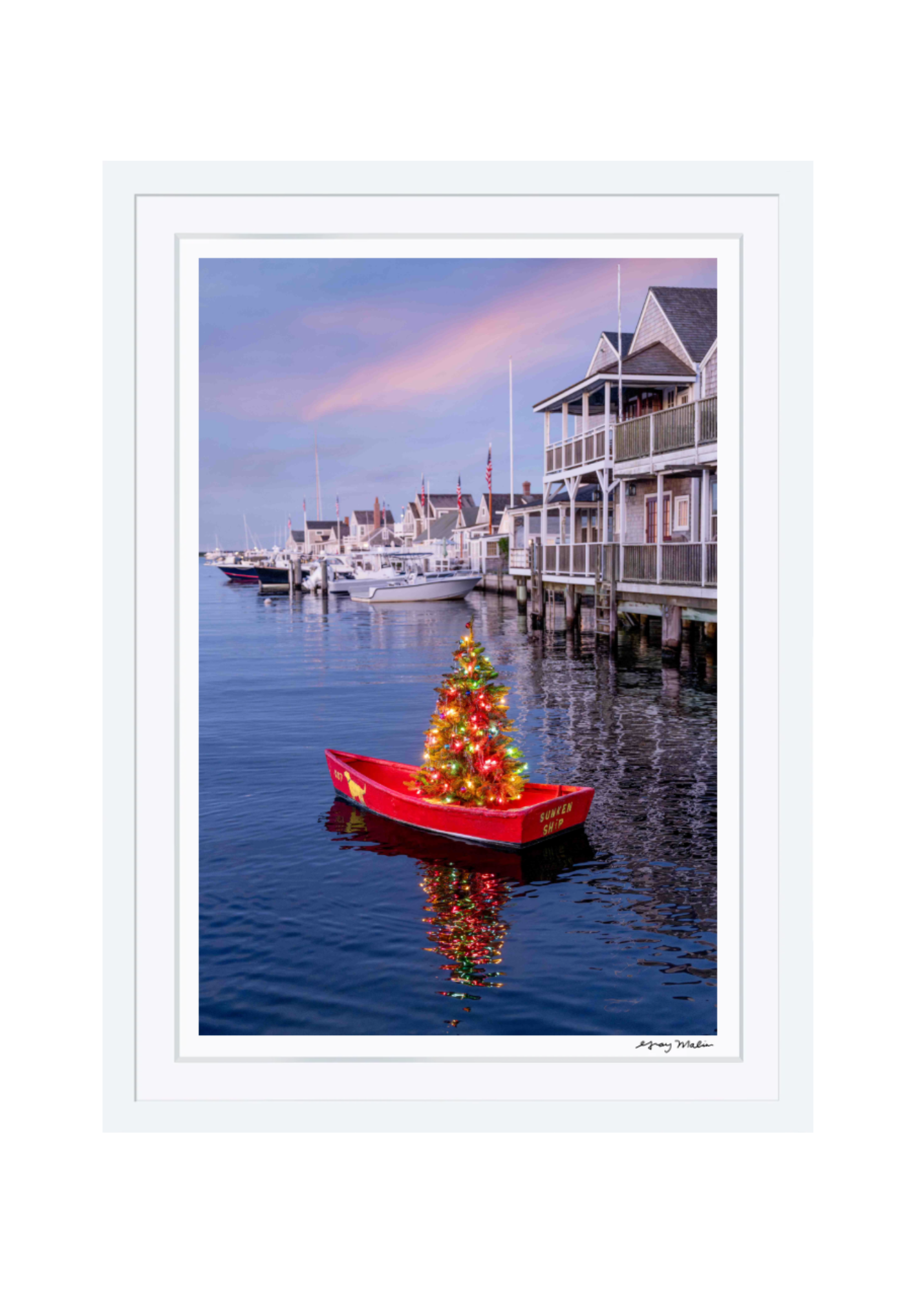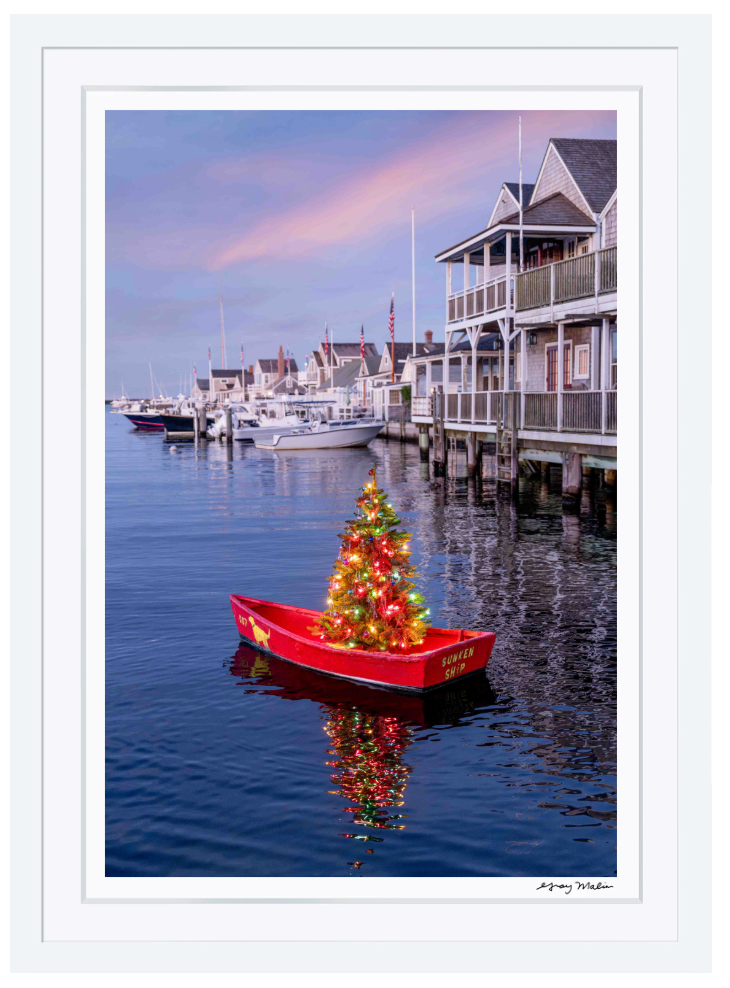 A festive Christmas tree glows in the Sunken Ship rowboat, casting colorful reflections across Nantucket Harbor in Holiday Reflections, from Gray’s Holiday Limited Edition series.
