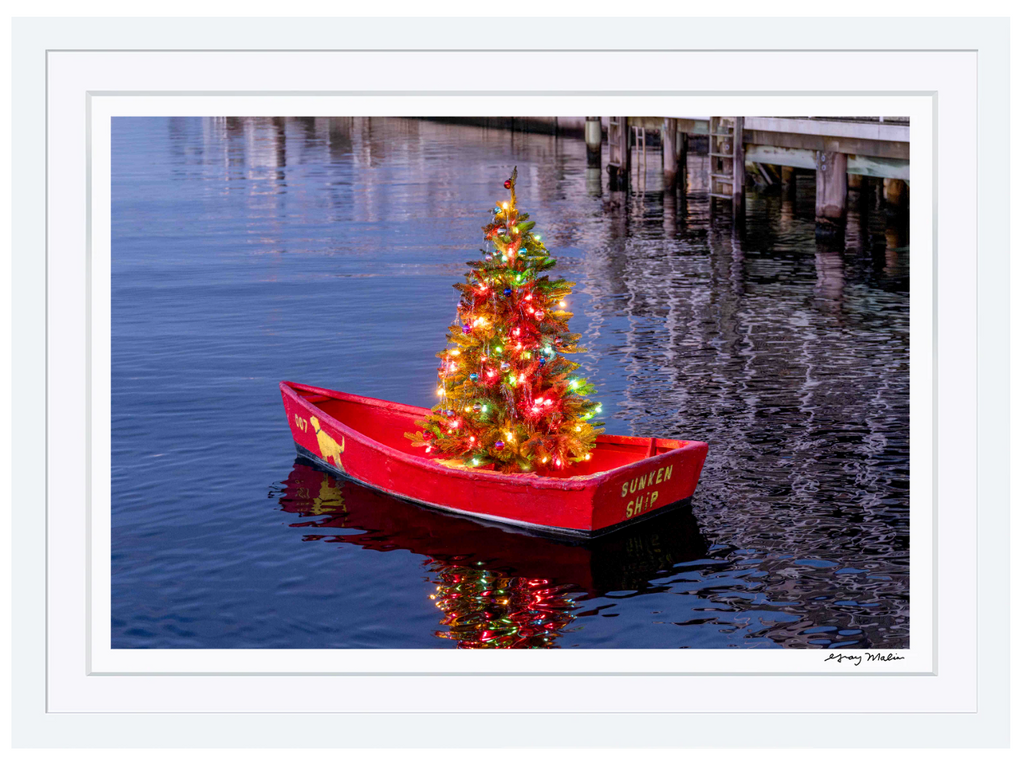 The iconic Sunken Ship boat carries a sparkling Christmas tree that lights up Nantucket Harbor in Harbor Holiday, from Gray’s Holiday Limited Edition series
