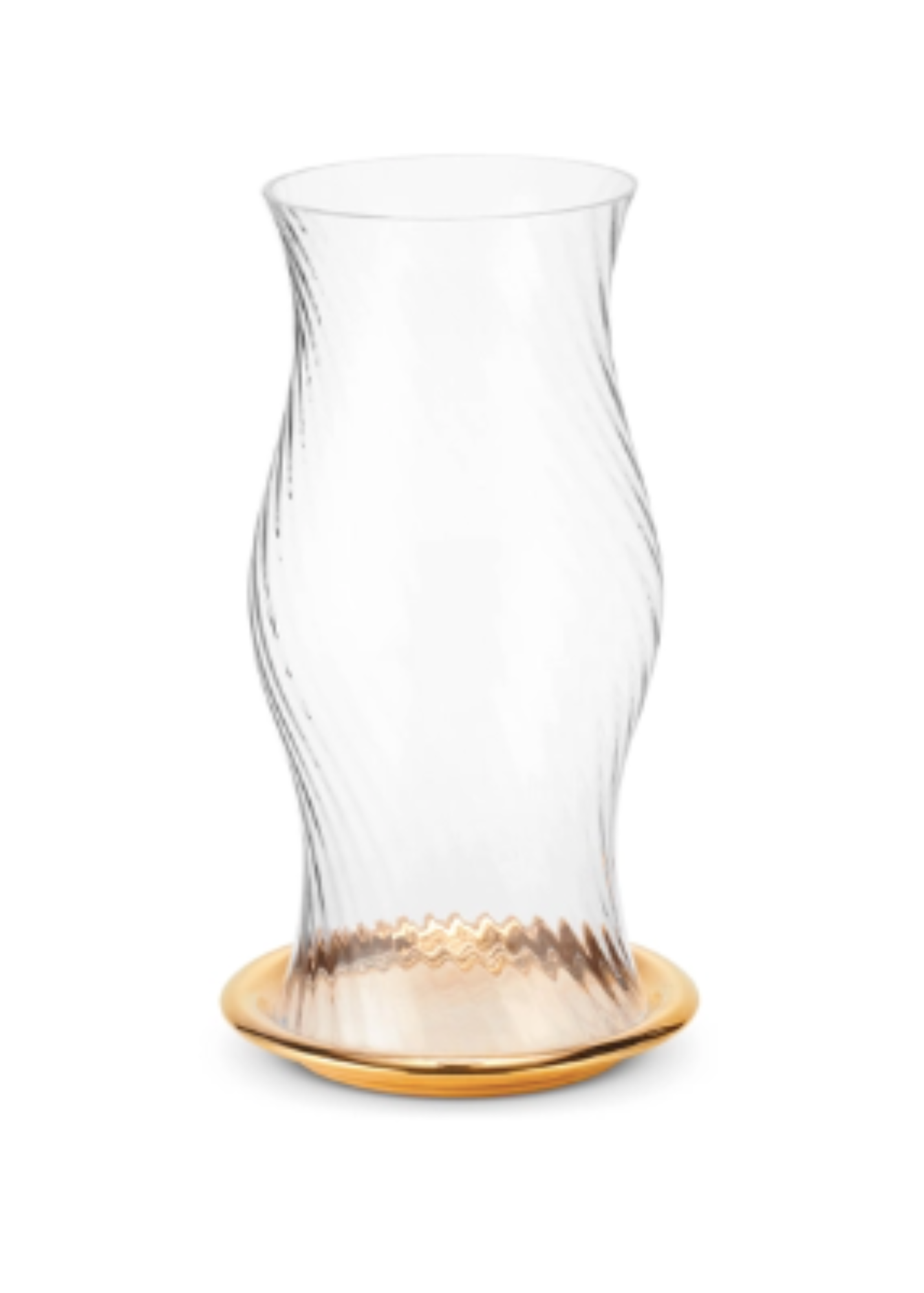 Inspired by vintage glassware, this small glass hurricane has a fluted form enhanced with a curving pattern. Due to the artisanal, mouth-blown process, the pattern on each piece is unique. Perfectly proportioned, it sits on a gold ceramic base, which has a sandy shamot texture, giving it an artisanal feel.