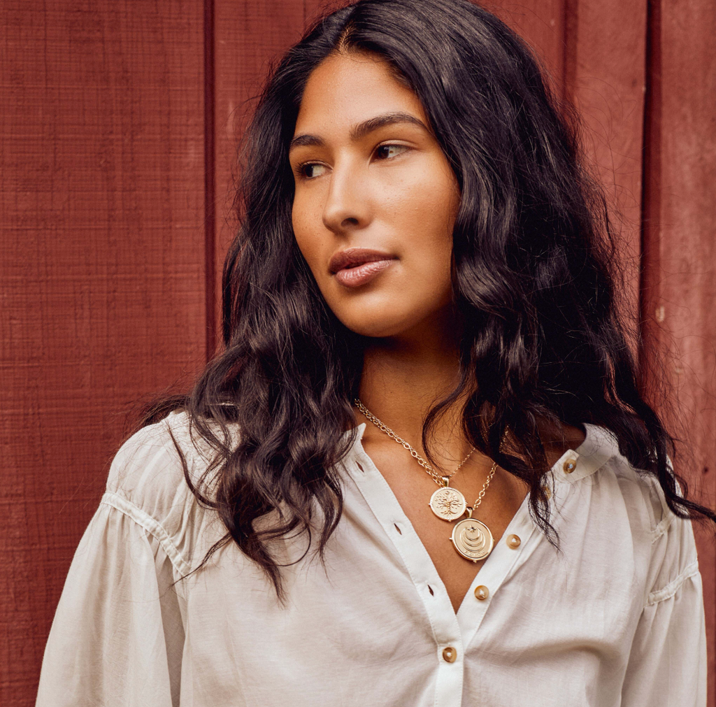 • Coin pendant made of sterling silver dipped in 14k gold, measuring 1" in diameter.