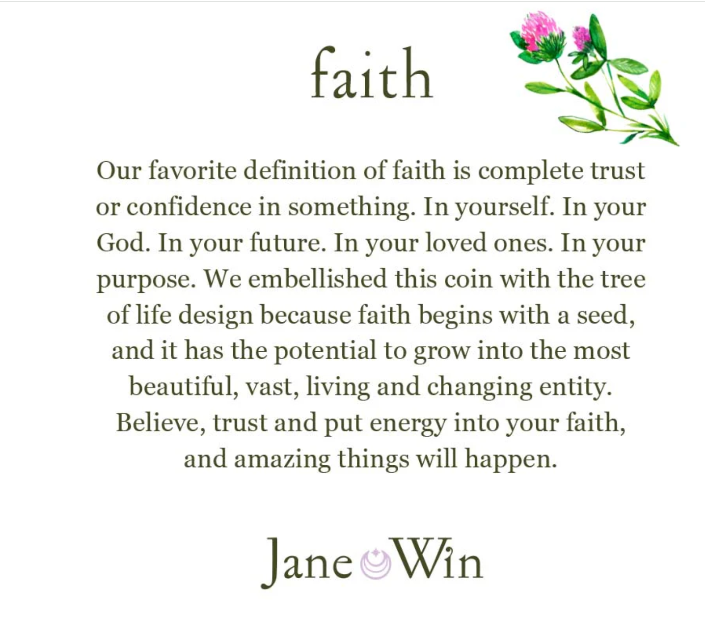 Our favorite definition of faith is complete trust or confidence in something. In yourself. In your God. In your future. In your loved ones. In your purpose. We embellished this coin with the tree of life design because faith begins with a seed, and it has the potential to grow into the most beautiful, vast, living and changing entity. Believe, trust and put energy into your faith, and amazing things will happen.