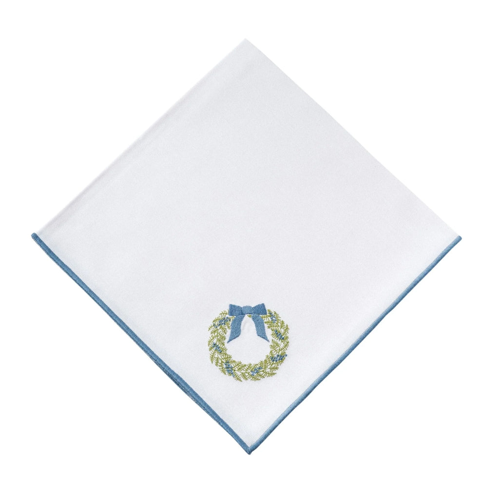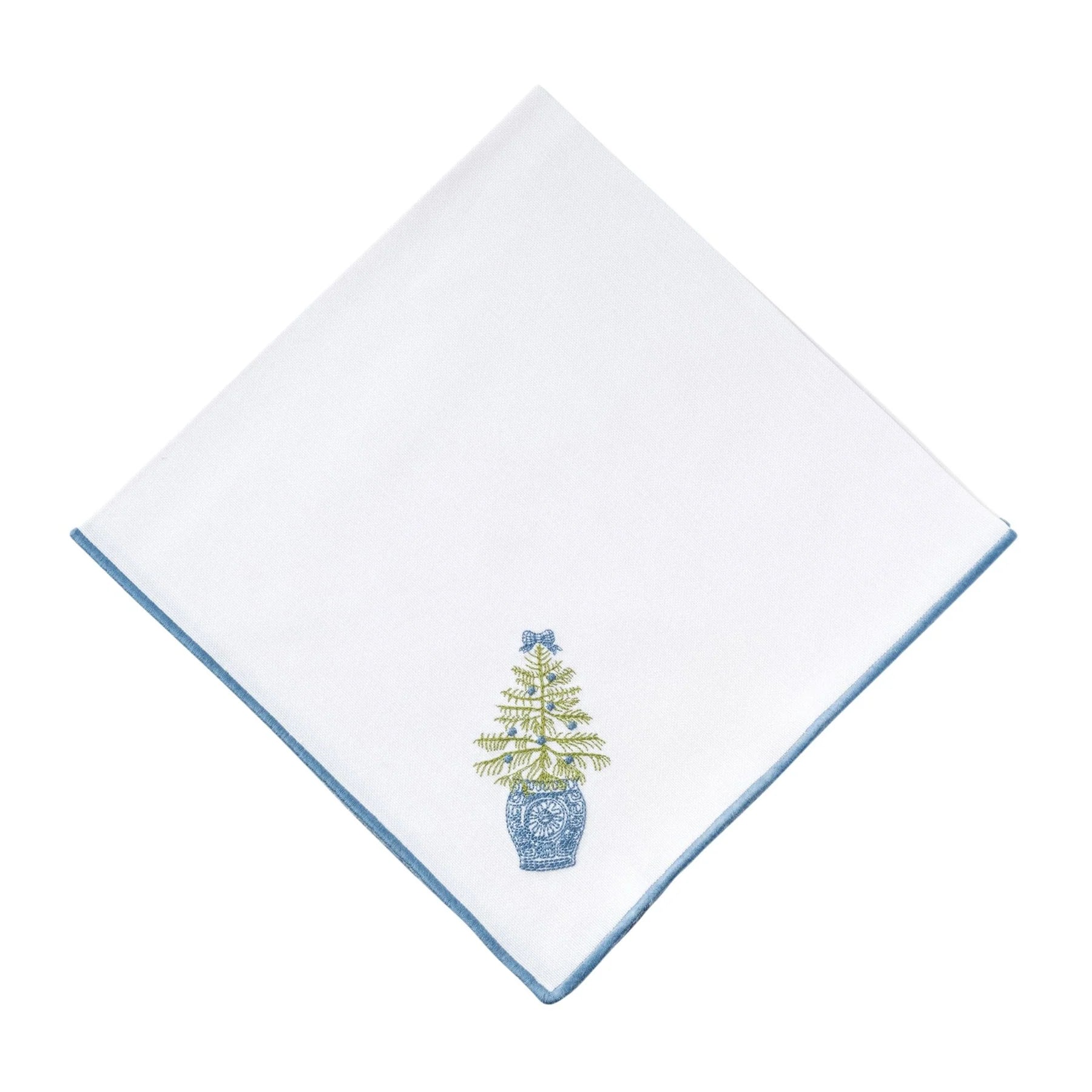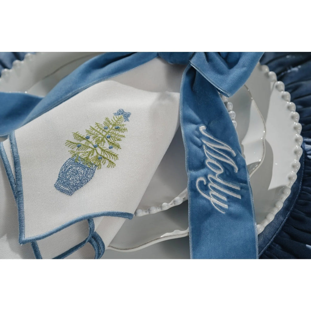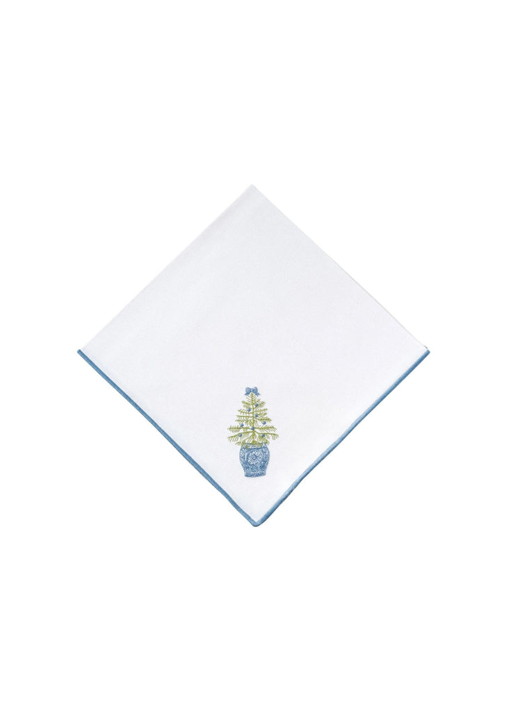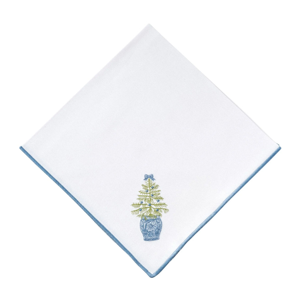Featuring our dashing Chinoiserie Christmas Tree & Wreath embroidery designs, this set of 4 blue-trimmed cotton blend napkins is certain to bring joy to your holiday festivities. Perfect for adding a touch of elegance to your table, these festive napkins are a must-have for holiday gatherings.