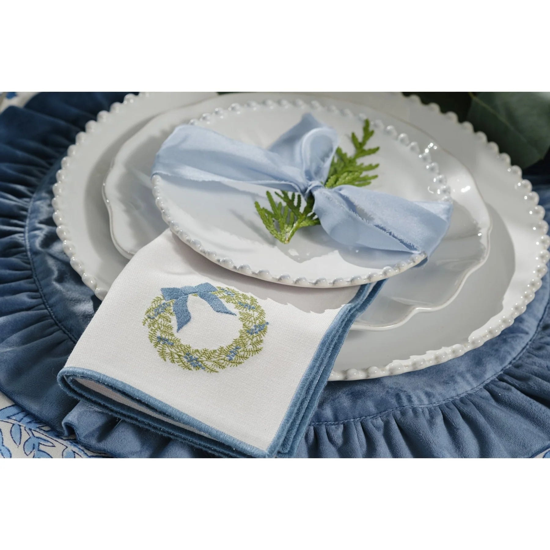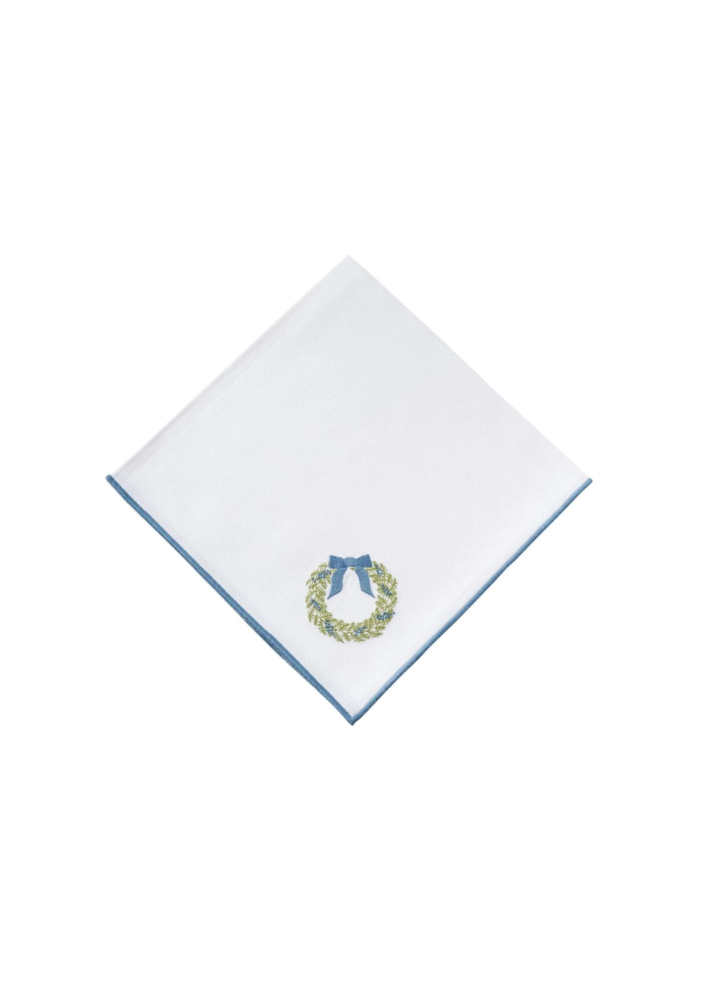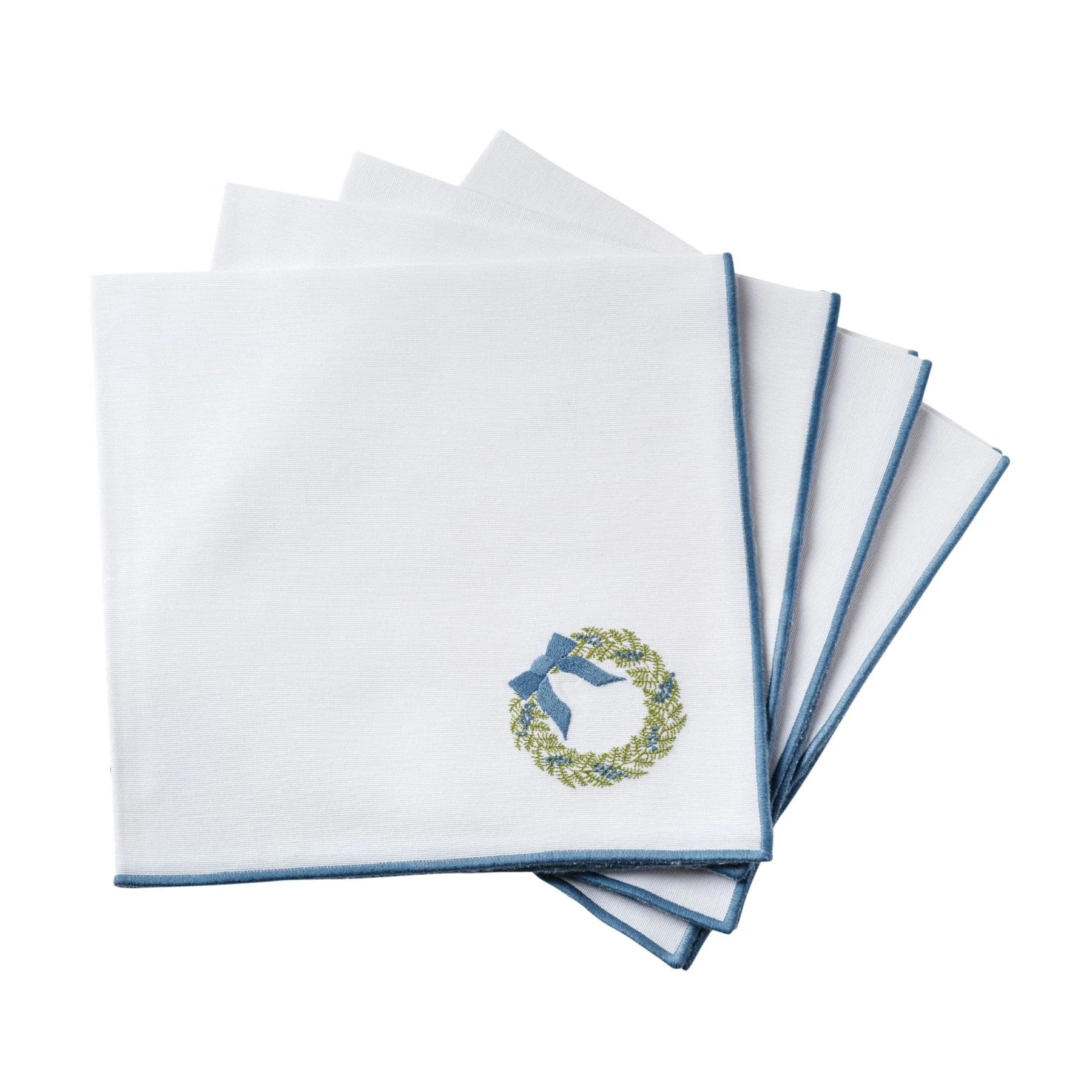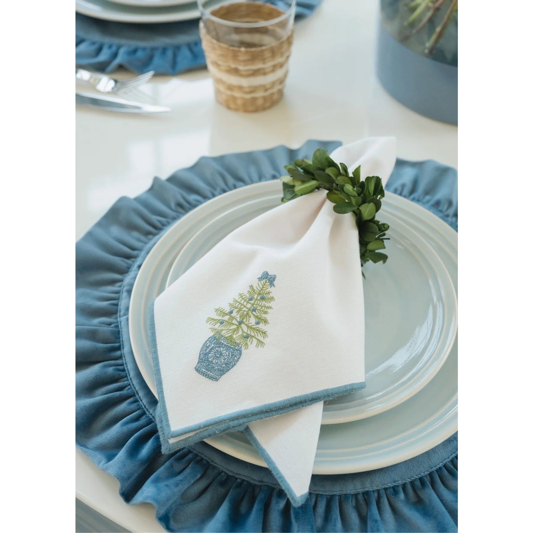 Featuring our dashing Chinoiserie Christmas Tree & Wreath embroidery designs, this set of 4 blue-trimmed cotton blend napkins is certain to bring joy to your holiday festivities. Perfect for adding a touch of elegance to your table, these festive napkins are a must-have for holiday gatherings.