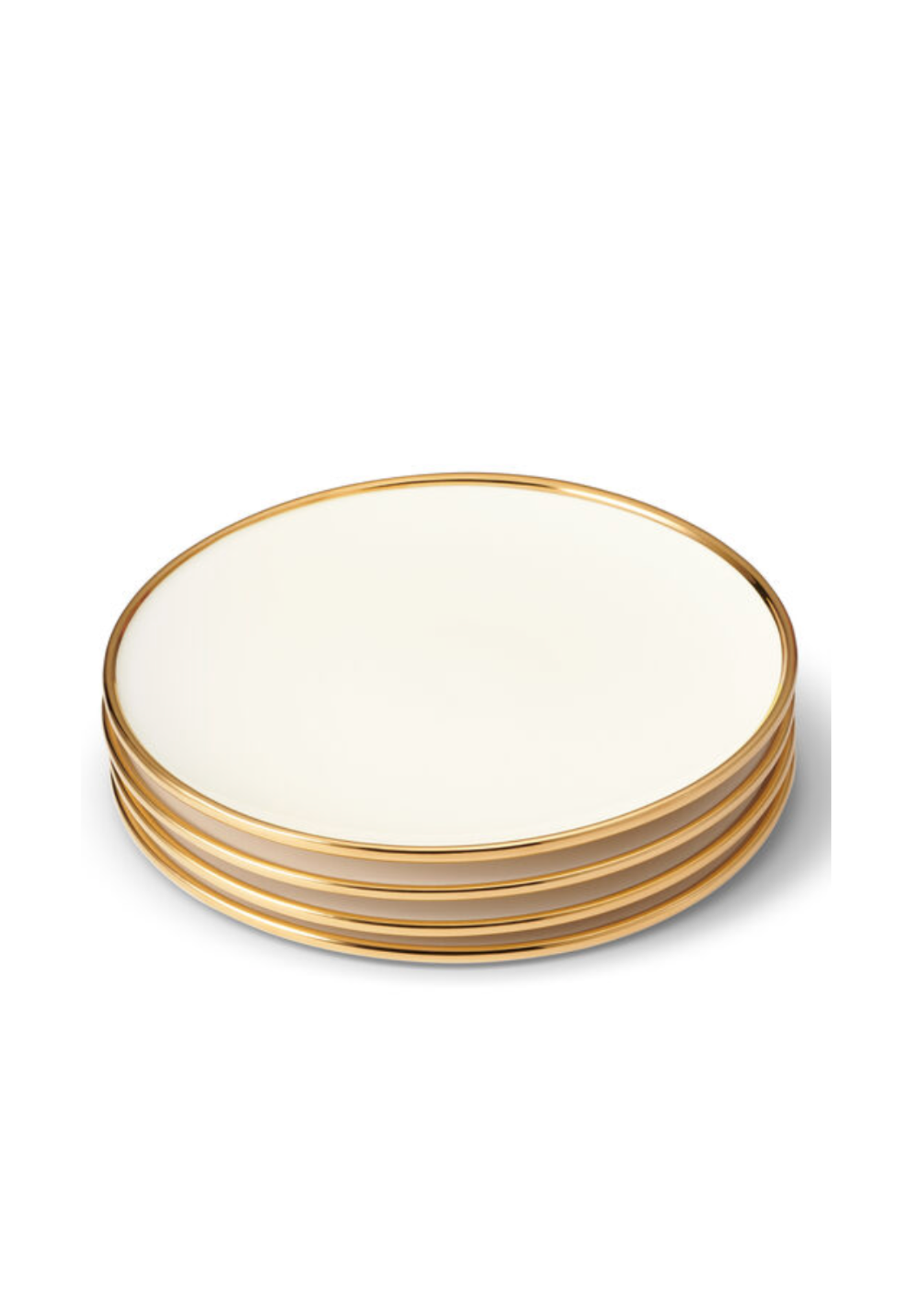 This set of four Elia plates is part of a collection of simply elegant dinnerware. A wide gold rim beautifully enhances the minimalist design. The plates have been crafted with a very slight curve that is subtly stylish and perfect for entertaining.