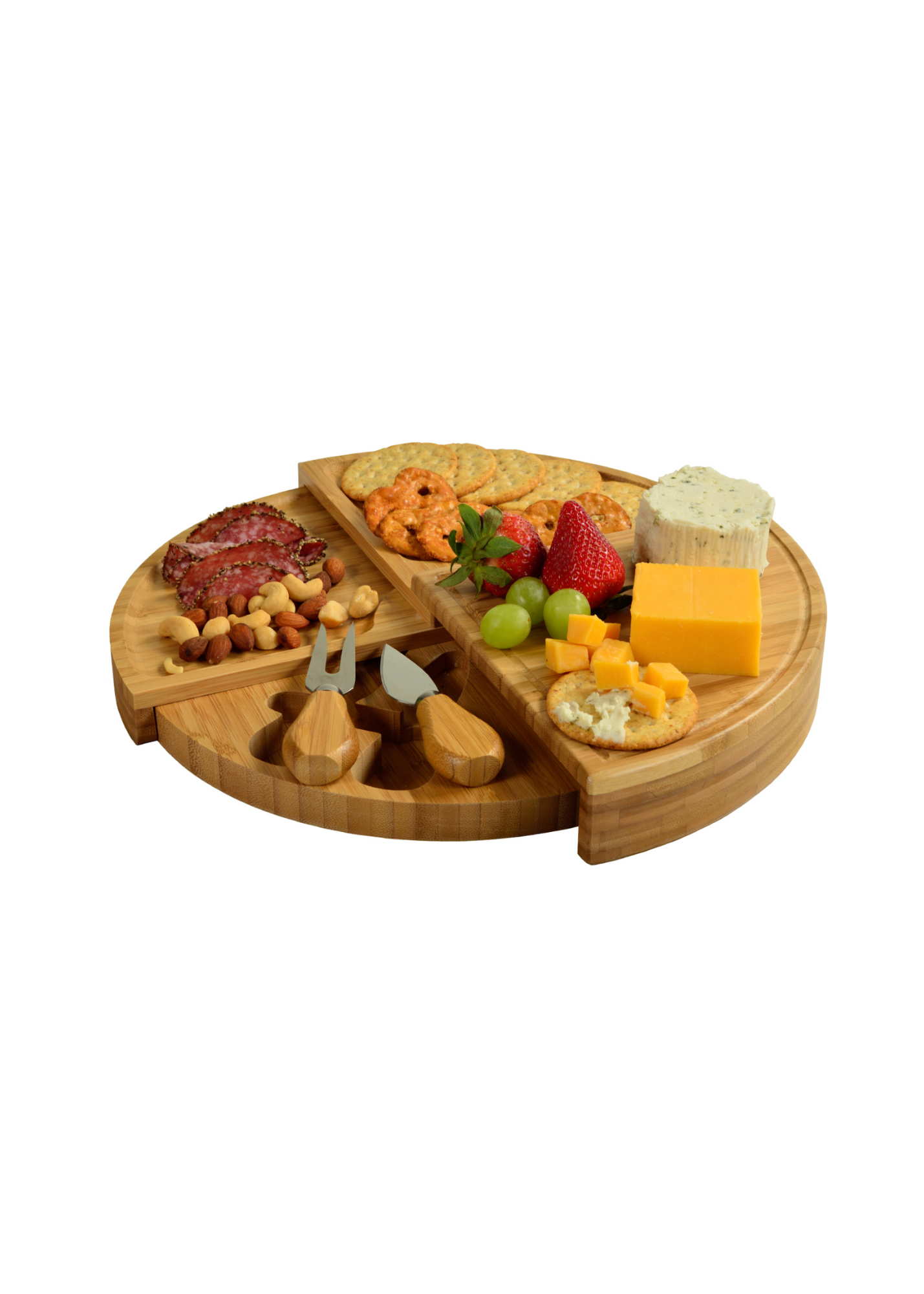The Florance Cheese Set is a Bamboo Board that amazingly transforms from a wedge to a circular, multi level cheese board with two stainless steel tools. This ingenious high quality board will impress guests when entertaining, and is a unique special upscale gift.