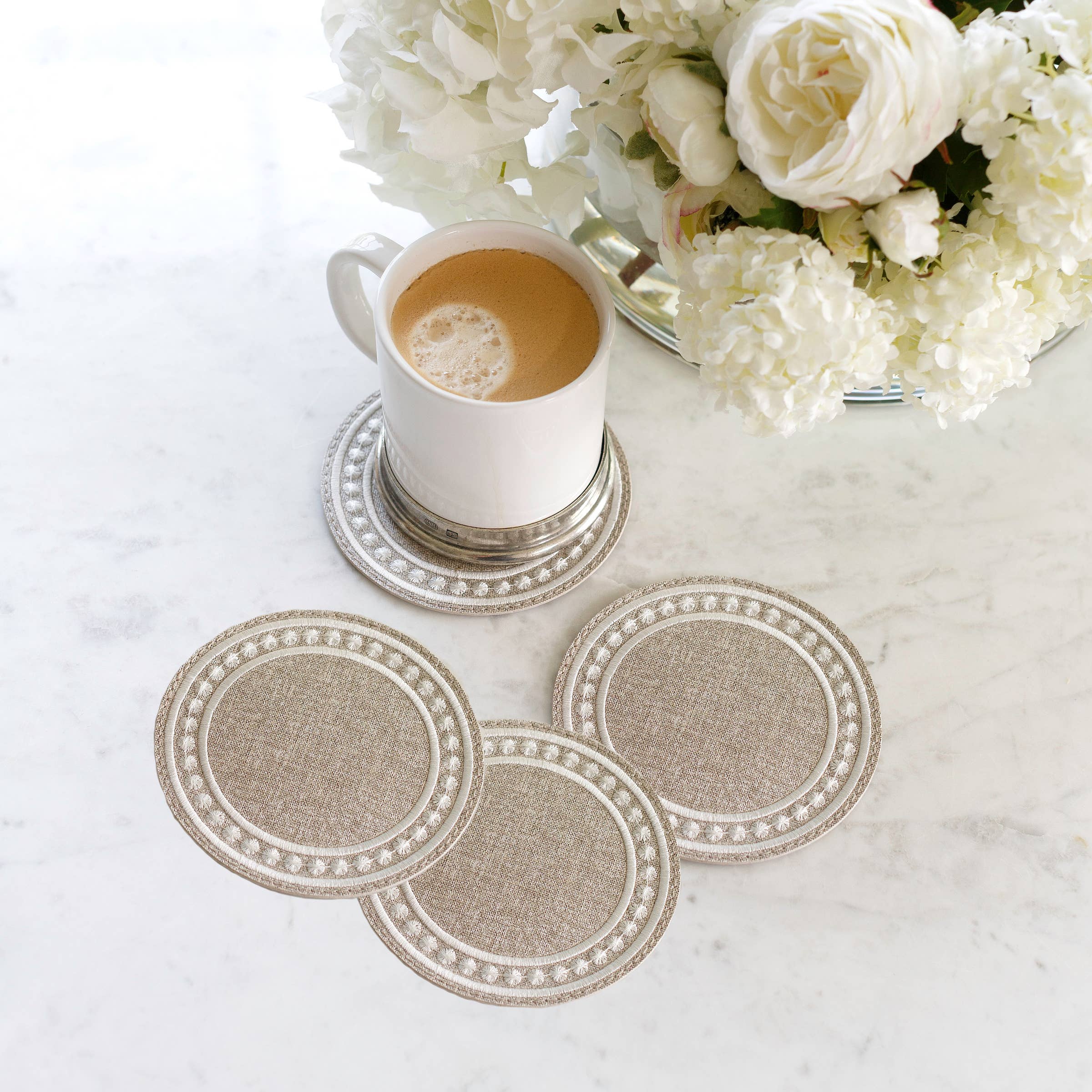 Enhance your tabletop aesthetics with our Set of 4 Palermo Perla Coasters. Each coaster boasts an elegant dotted pattern delicately encircling the edges, adding a touch of refined charm to your décor. With a convenient 6" diameter and easy-to-wipe clean feature, these coasters effortlessly combine practicality and sophistication, ensuring a seamless and stylish protection for your surfaces.