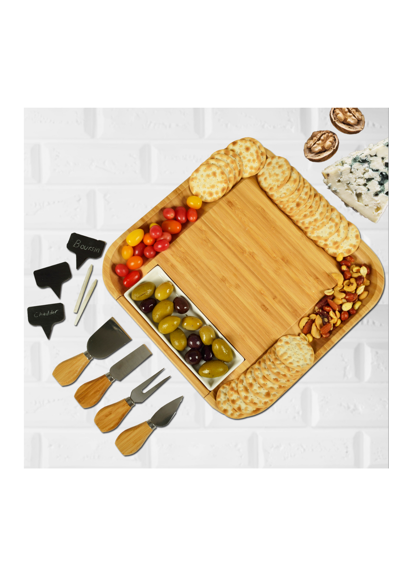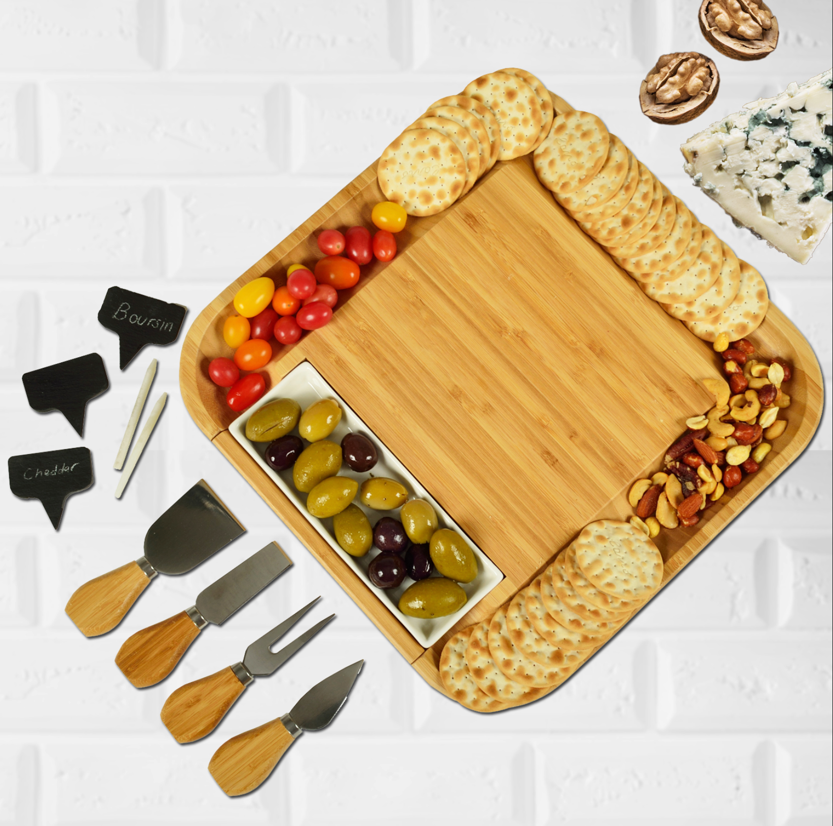 Impressive cutting board set complete with three natural slate cheese markers, two piece of soapstone chalk, four stainless steel cheese tools, and one ceramic dish.