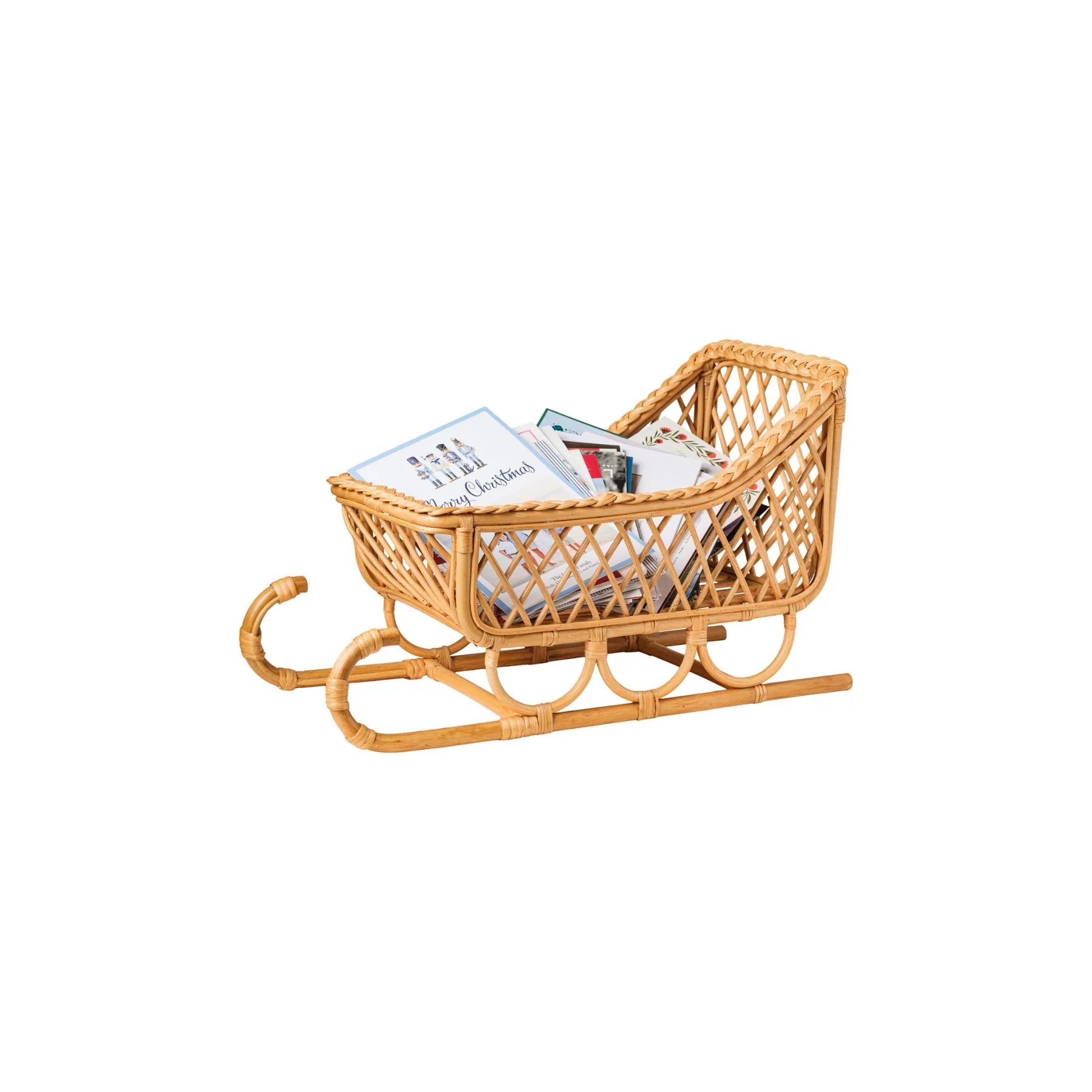 Handwoven from natural rattan, this playful sleigh is available in two sizes for endless styling opens. Display wrapped gifts by the fireplace in our extra large sleigh. Collect your holiday cards or layer evergreen clippings and ornaments as a statement centerpiece in our medium size.