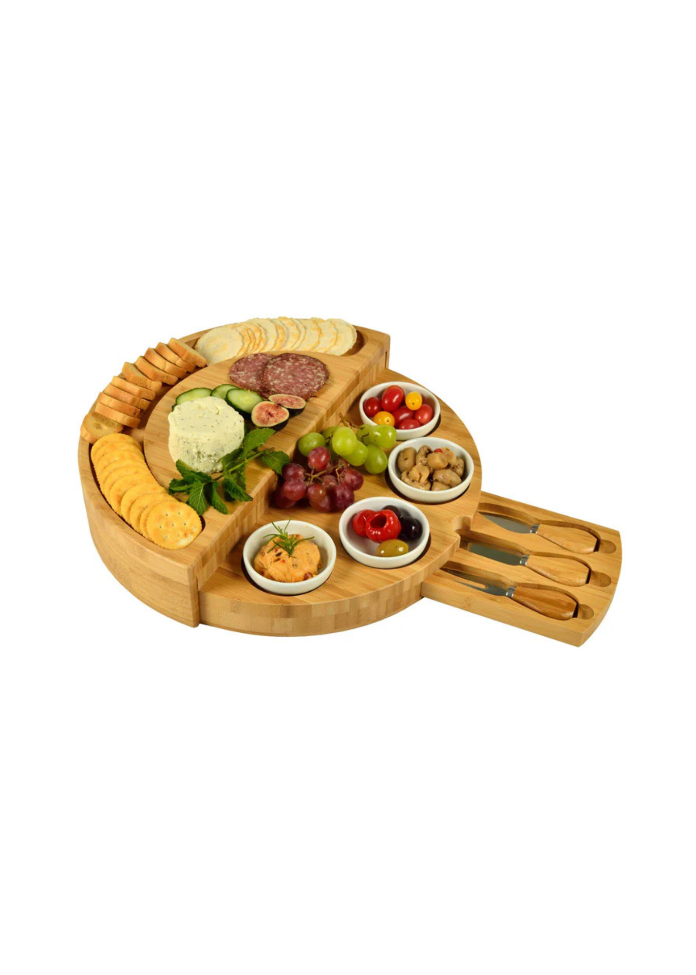 This amazing bamboo board transforms from a half circle to a full circle to create a multi level cheese/charcuterie board with three stainless steel tools and four ceramic bowls. Perfect for storing in smaller places. It is sure to impress your guests.