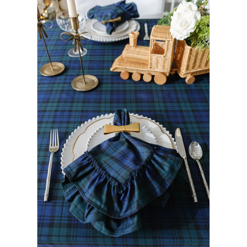 Our Tartan Ruffle Napkin Set brings timeless holiday charm to the table, featuring a classic navy and green blackwatch tartan print and finished with a ruffle detail.