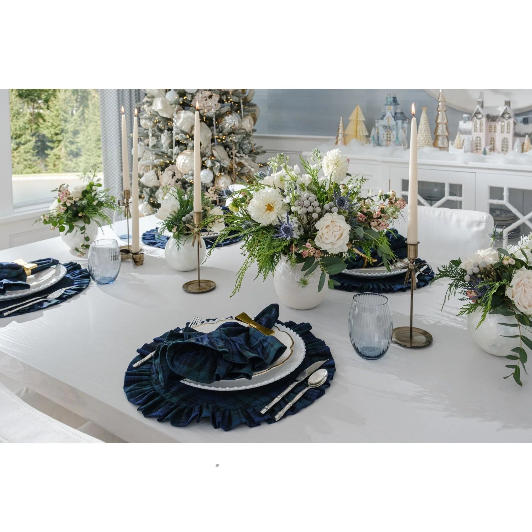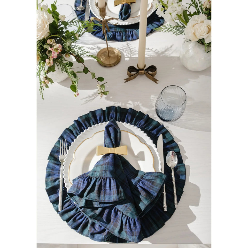 A festive foundation with timeless appeal, our exclusive Tartan Ruffle Placemats feature a traditional navy and green blackwatch tartan print with a playful ruffled edge, bringing warmth, texture, and a touch of holiday charm to your table.