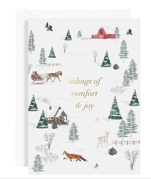Send a little nostalgia and whimsy this holiday season with this scenic toile. Featuring beautiful wintry scene, card reads, "Tidings of comfort and joy." Gold foil lettering. Blank inside. Paired with white envelope. Designed by Paper Source. 4.5" x 6.25"