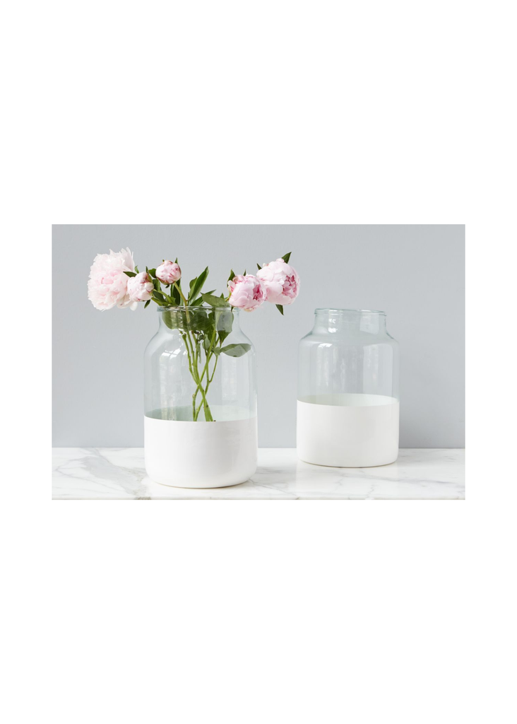 The collection of Colorblock Mason Jars is made from recycled glass, mouth blown into vintage inspired casts to retain their characteristic appeal. We have taken an original 5-liter mason jar and added a bold splash of high-gloss white paint to the bottom. Not only does the color add a contemporary element, the small glass jar is ideal for displaying flowers and hiding the bottom of the stems. For a statement making combination, pair with our White Colorblock Mason Jars in Medium and Large.