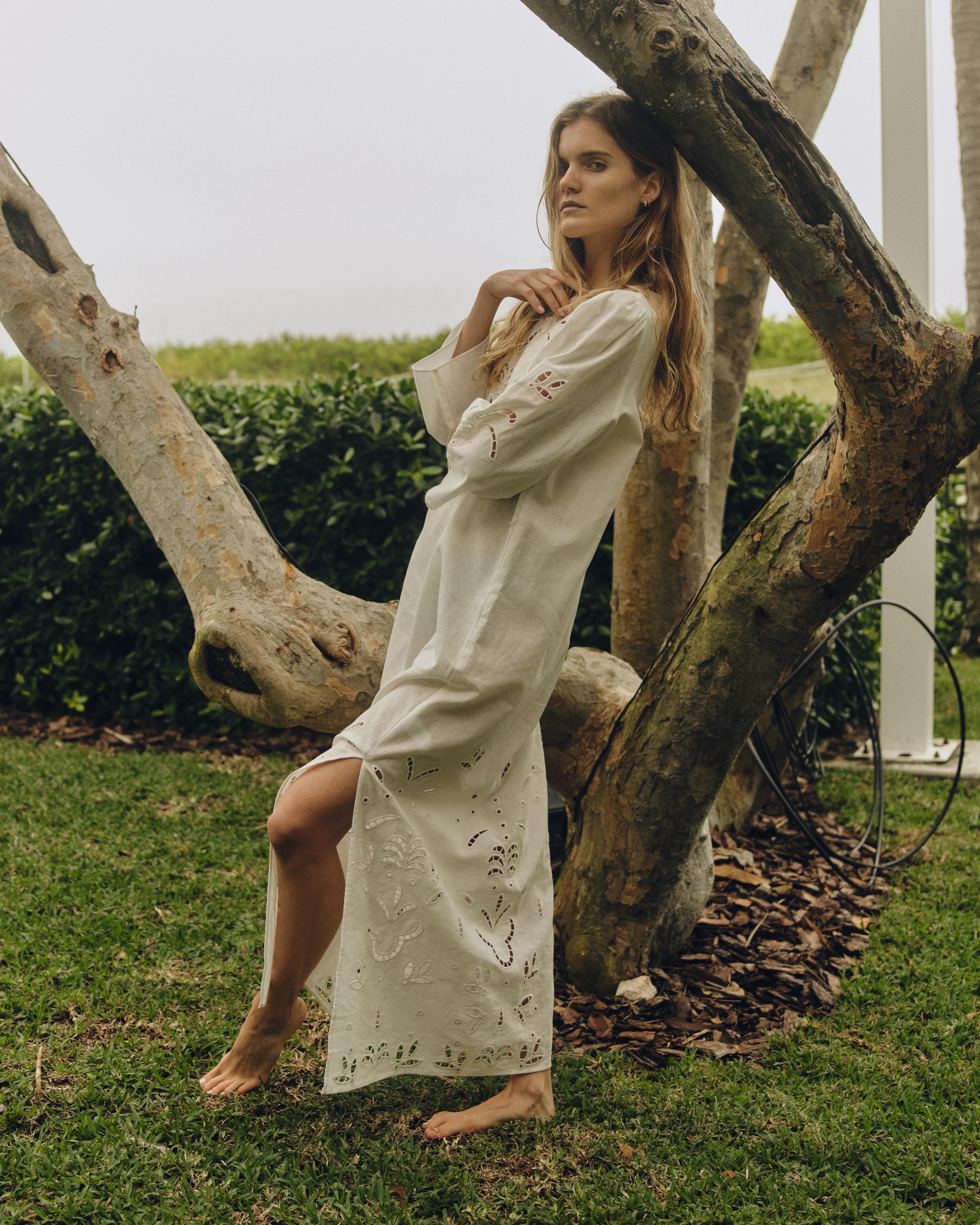 The Athena Dress evokes a sense of quiet refinement. With its flowing silhouette and embroidery that traces each edge with care, it’s a piece made for meaningful memories!