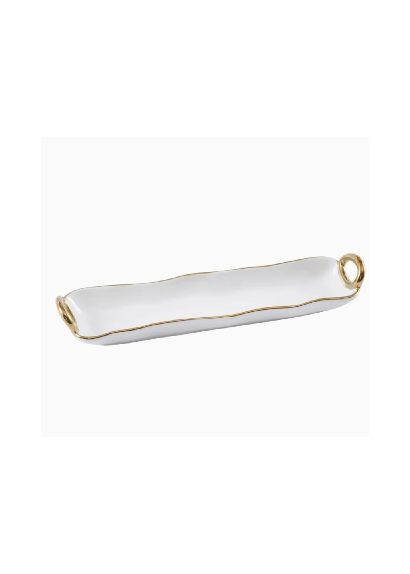 An incredibly versatile all-purpose serving platter makes an easy transition from oven to table. Great for appetizers and desserts! Stunning white porcelain with smooth and fluent handles in gold titanium. Food safe, dishwasher safe, oven safe to 500°. Easy Care.