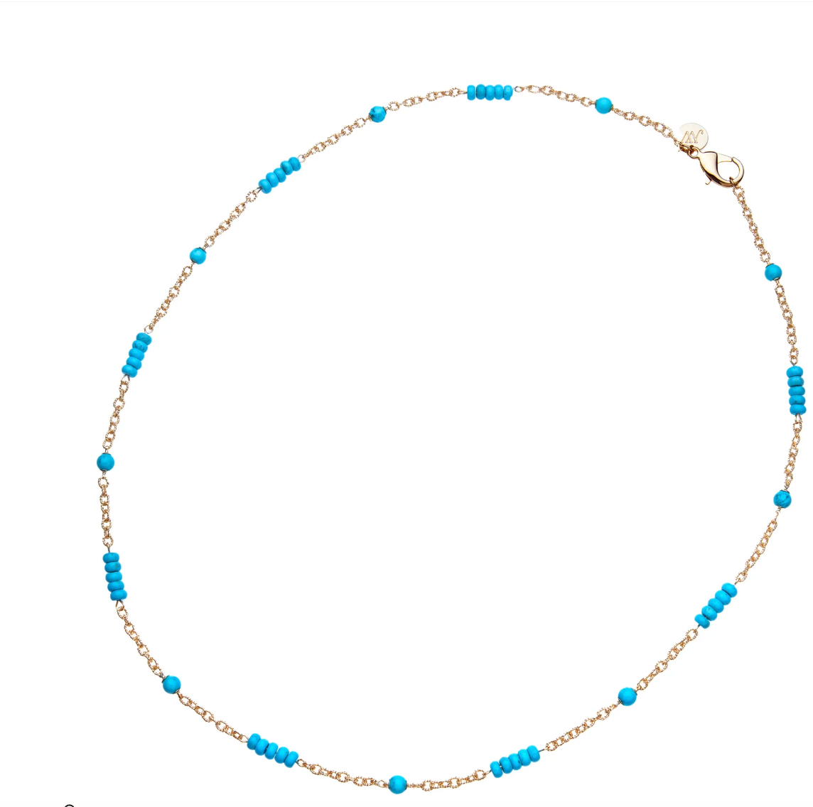 - 14k Gold-Plated Brass textured cable chain embellished with lapis beads.