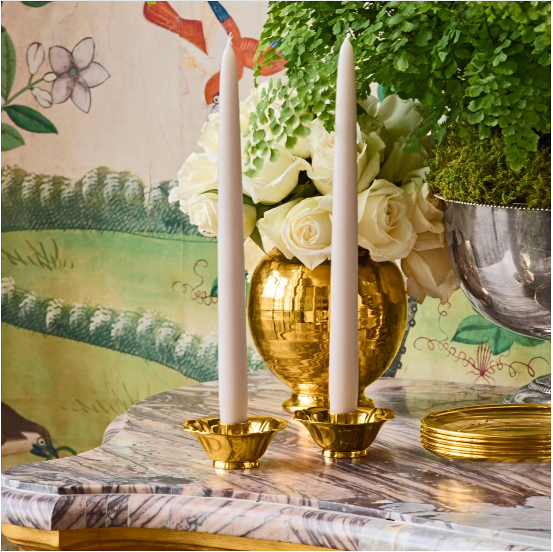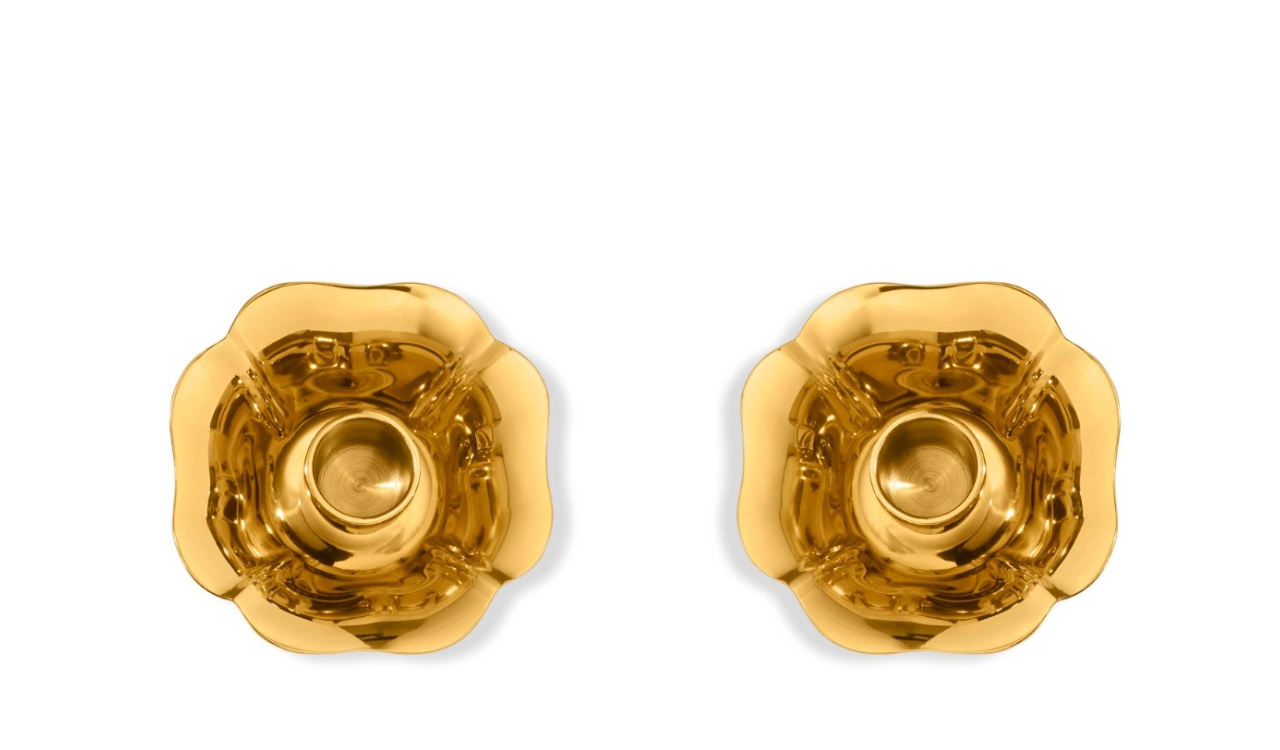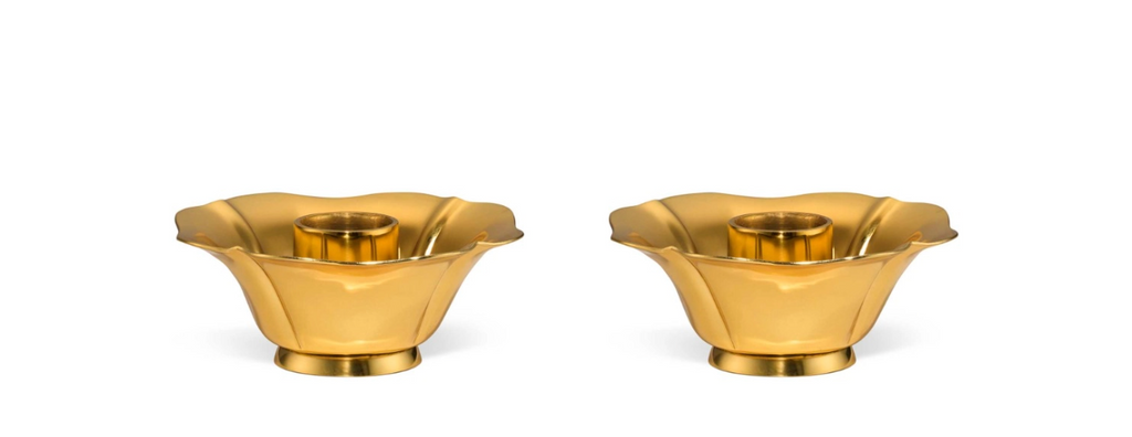 Inspired by a vintage bowl shape and Art Deco Design, this set of two brass candleholders is crafted in a stylized flower shape. An effortless way to add elegance and character to a dining table or fireplace mantel.