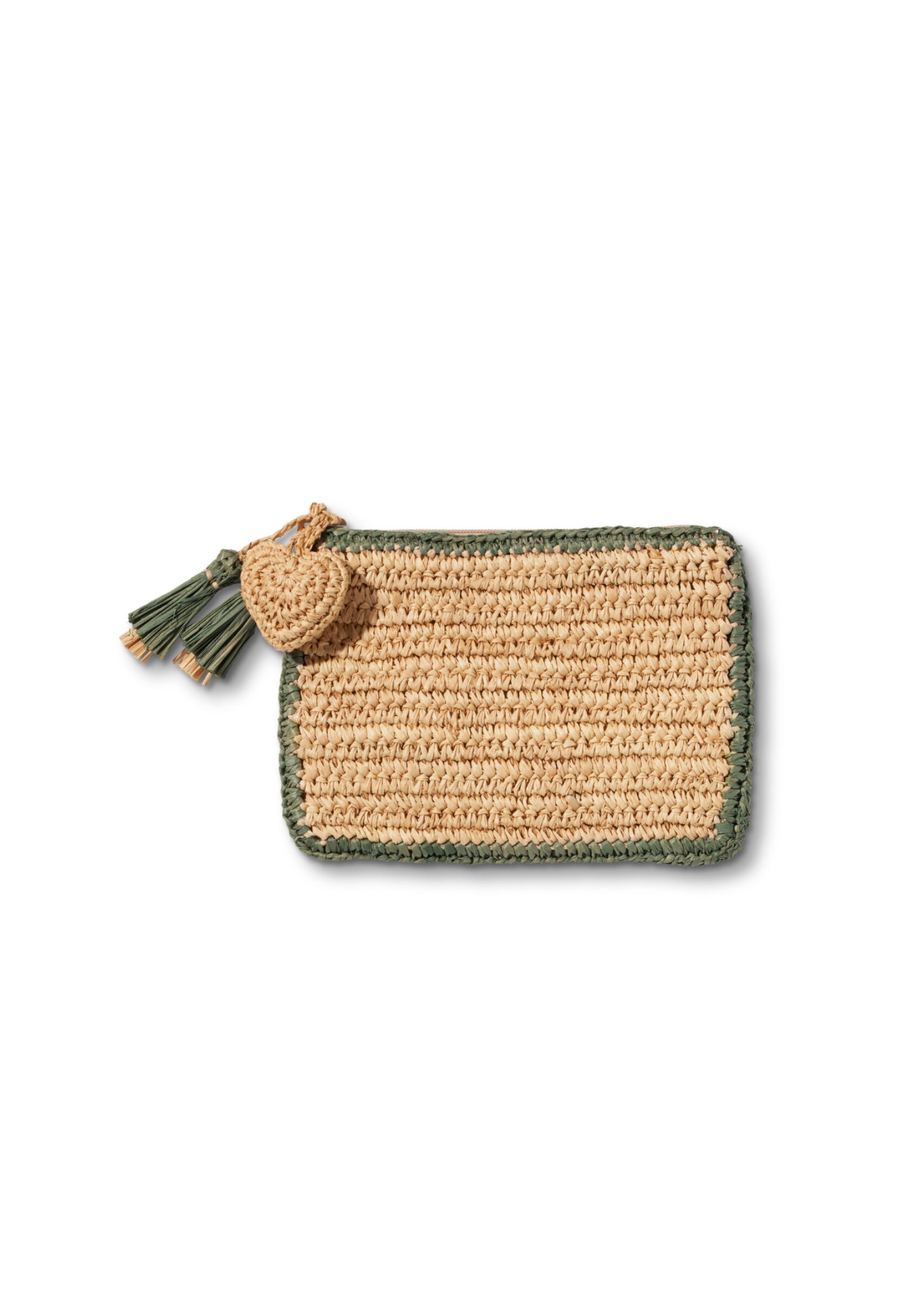 A casual accessory with a natural touch, this woven raffia pouch has attractive border detailing and is enhanced with a raffia tassel and heart. It is the perfect size to hold small personal items such as keys, phone, and lip gloss while on vacation or at the weekend.