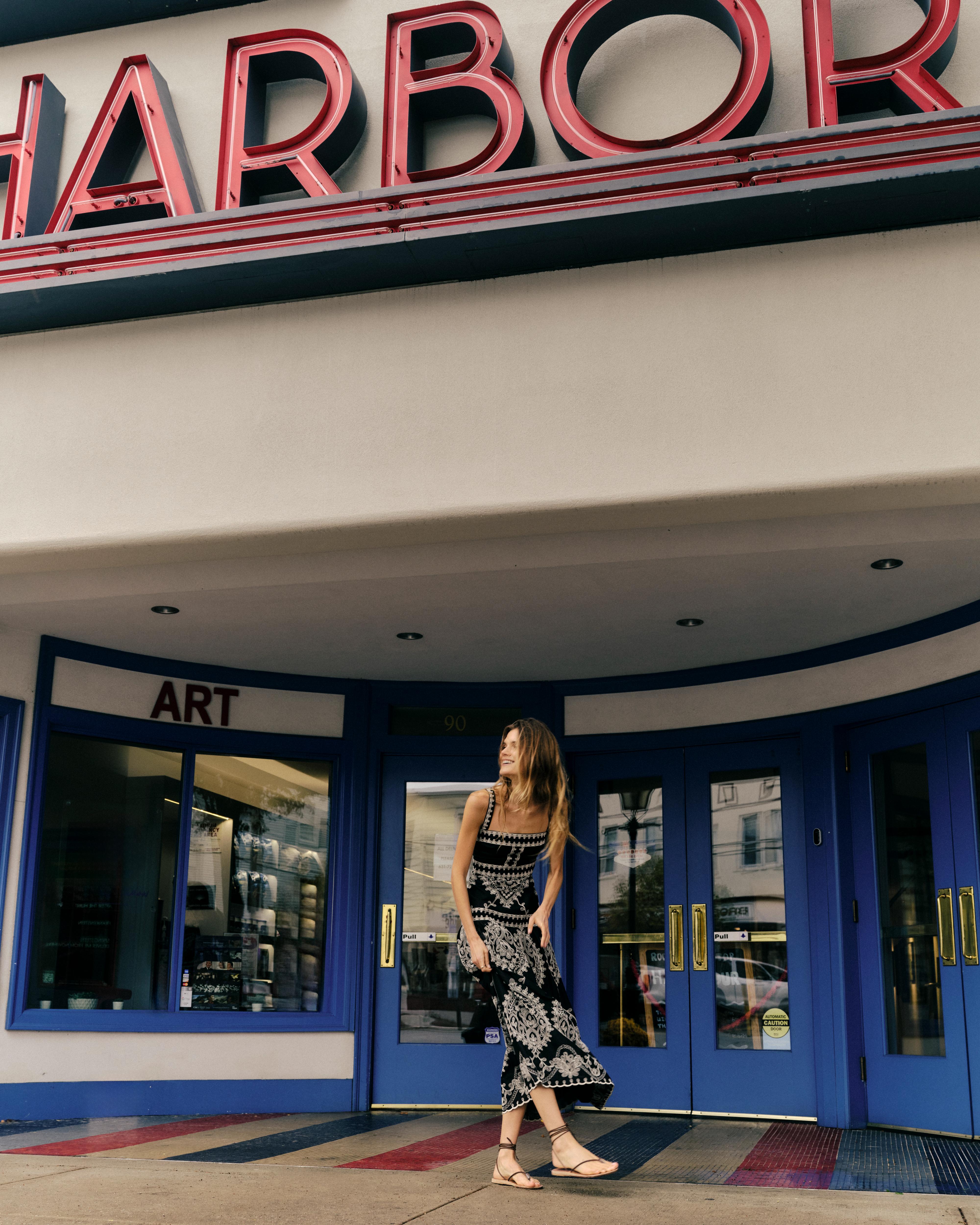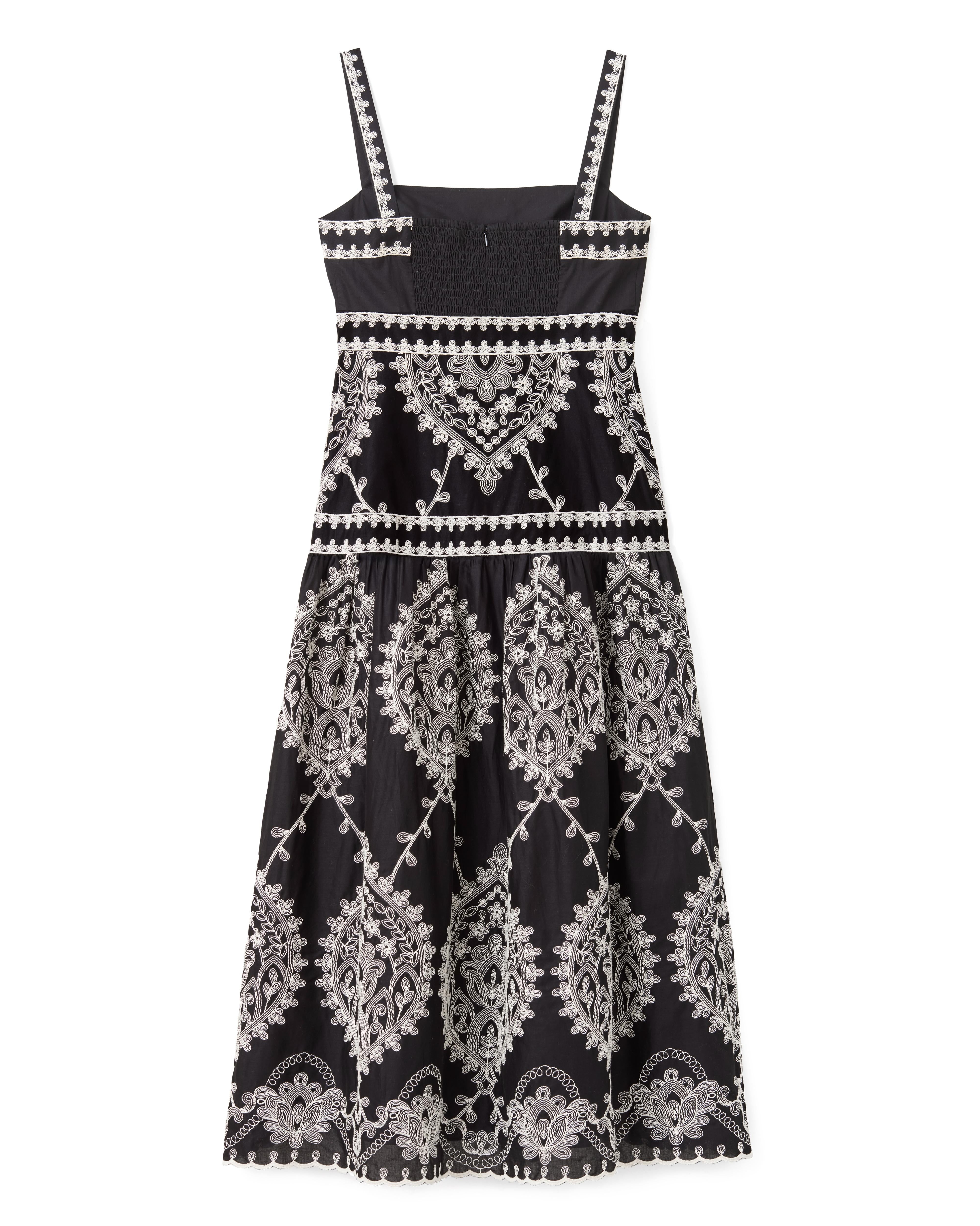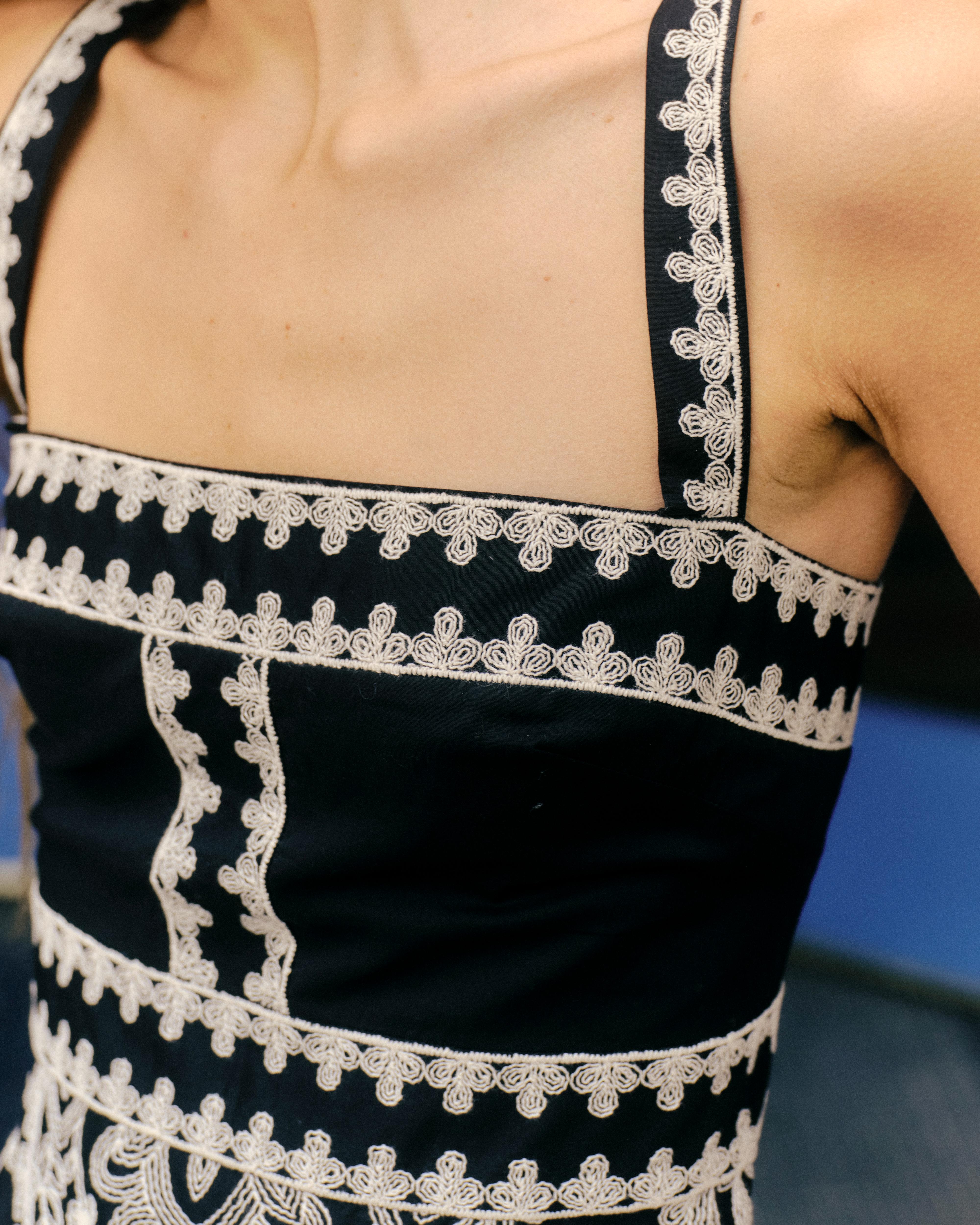 Stepping into early spring takes shape through the Adair dress—embroidered blooms catching light against deeper tones, somewhere between quiet coastal evenings and sunlit garden gatherings.