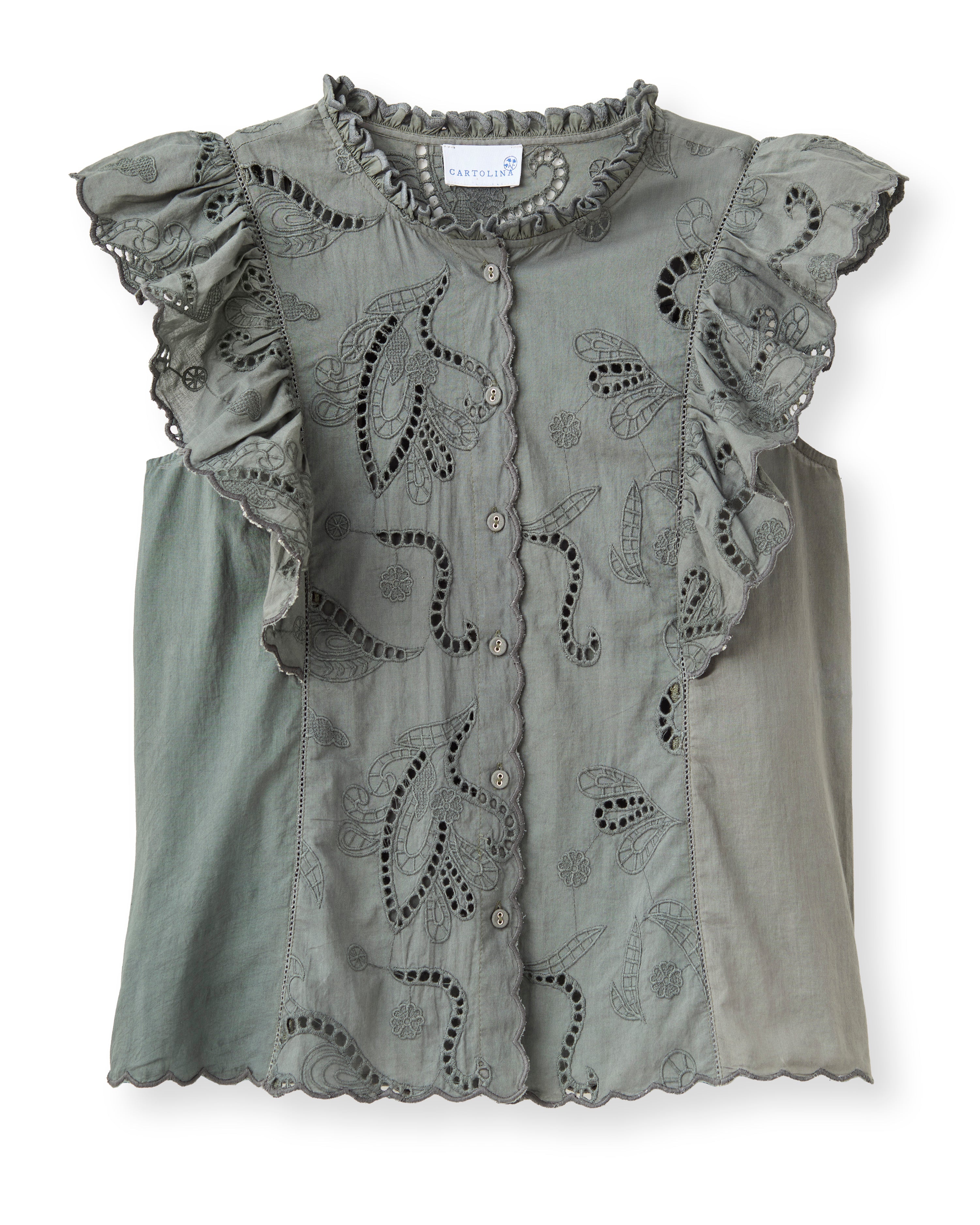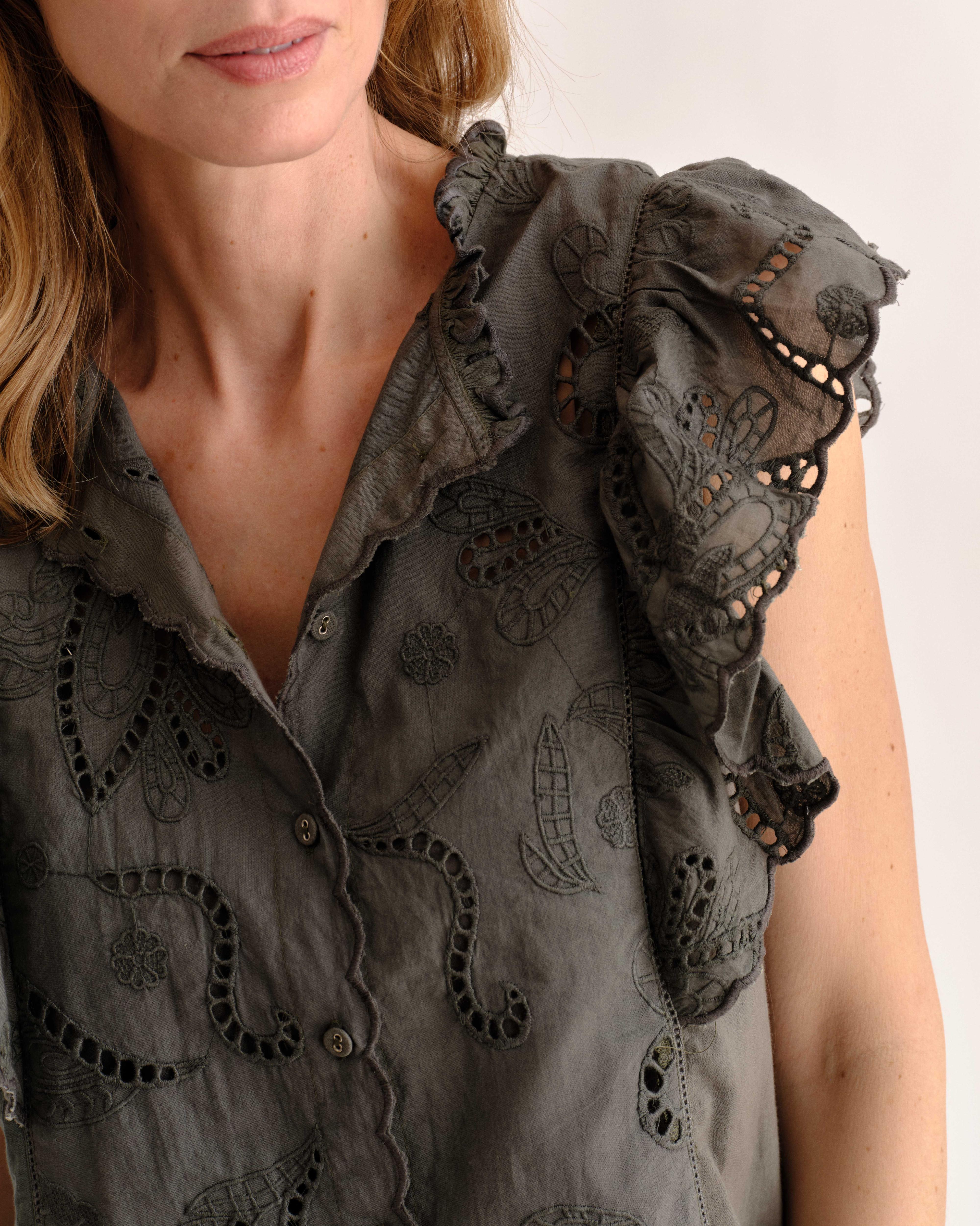 - Intricate paneled front embroidery and eyelet detailing