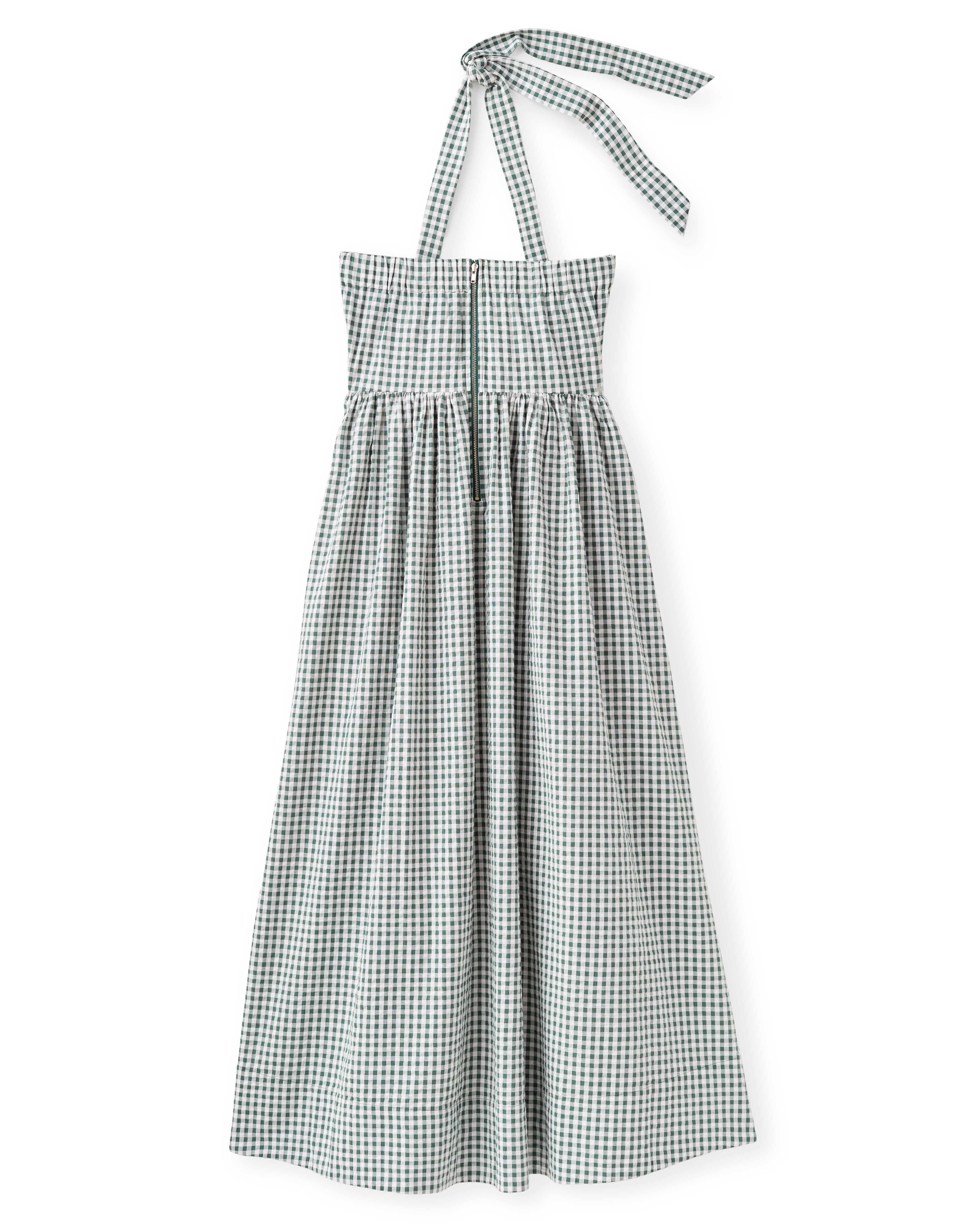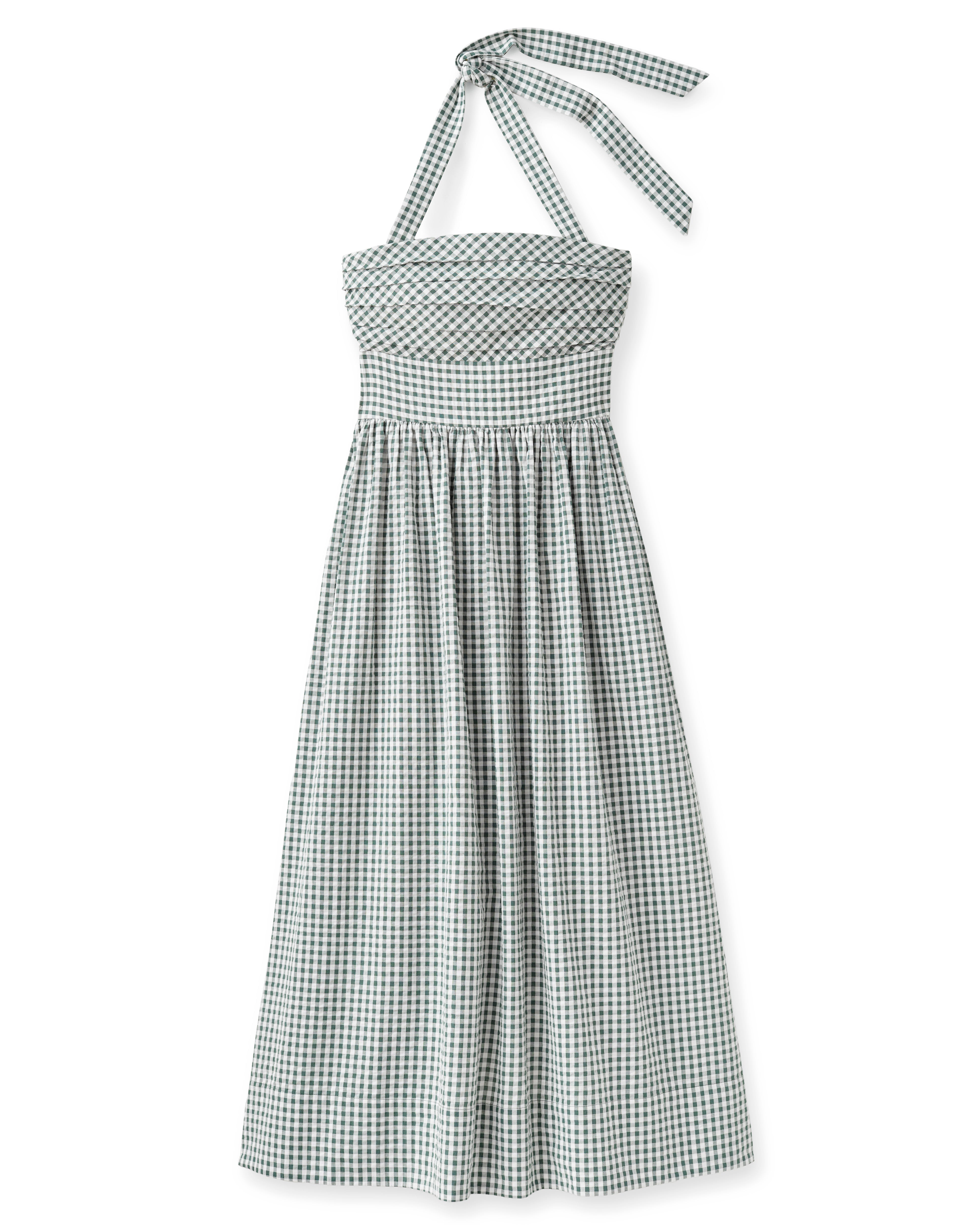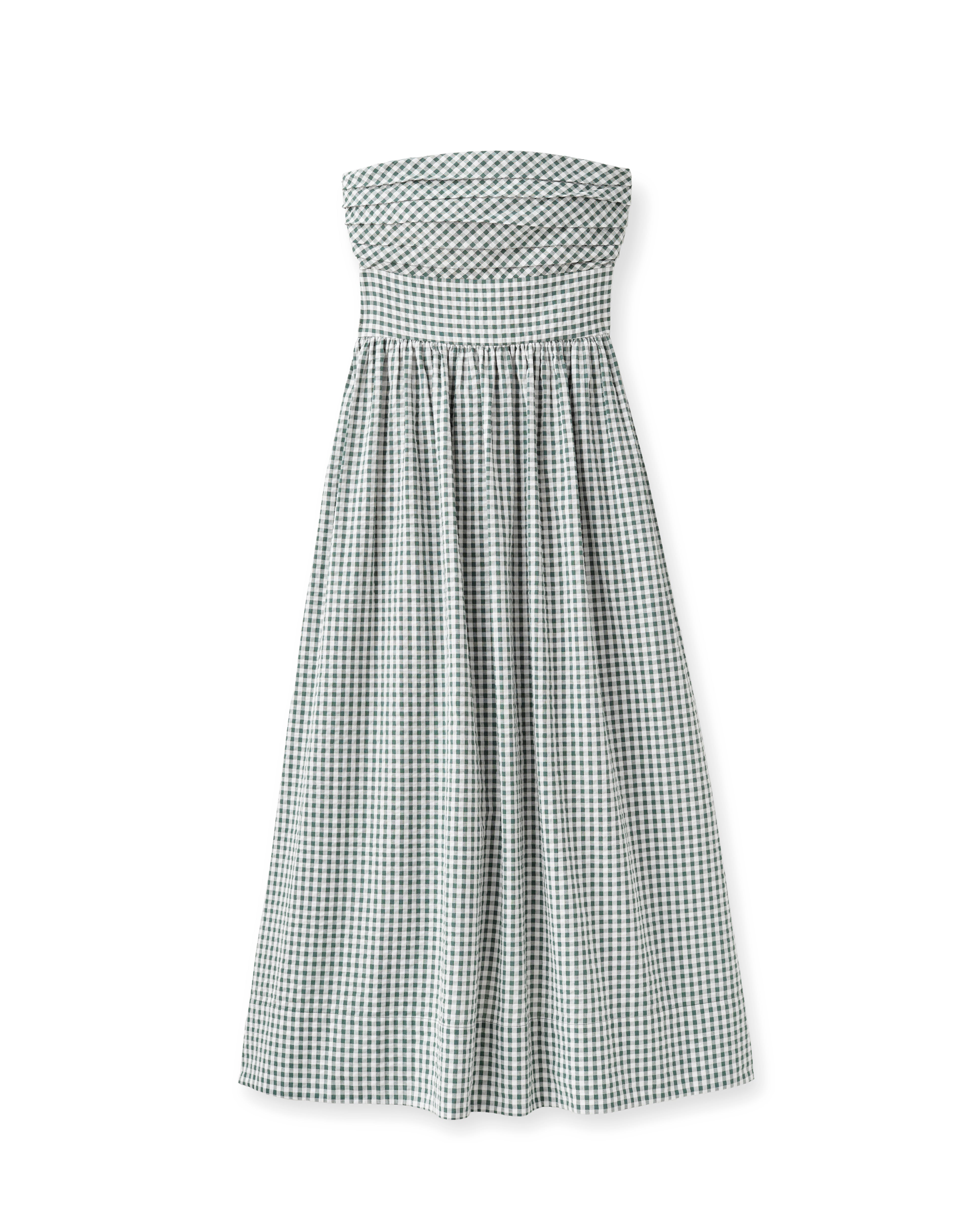 Elevated and sun-ready, the Chalmers Dress reflects the shifting light of the coast through its classic gingham texture. With a detachable strap and artful pleating, it is a versatile piece that moves gracefully from a strapless daytime look to a refined evening silhouette.
