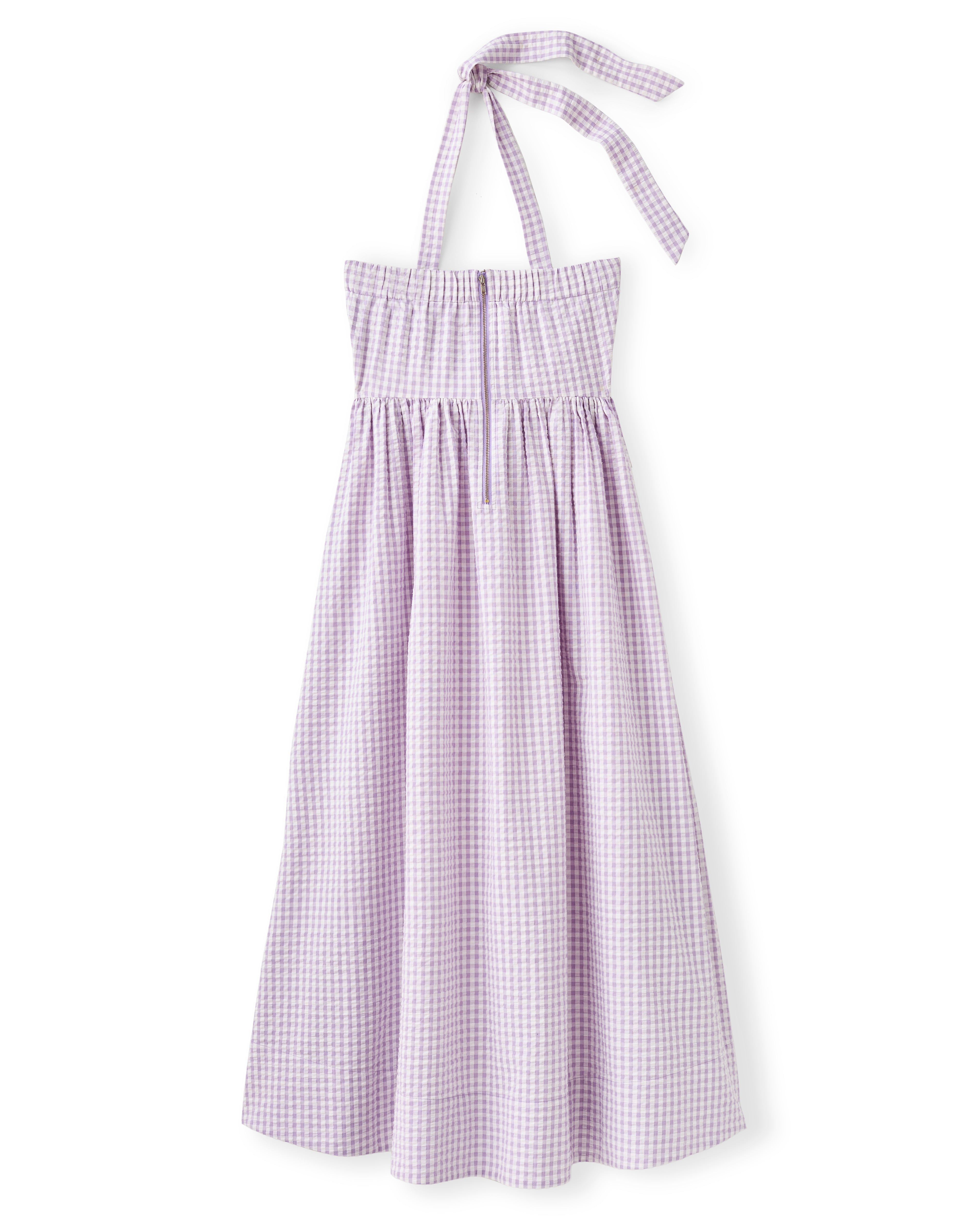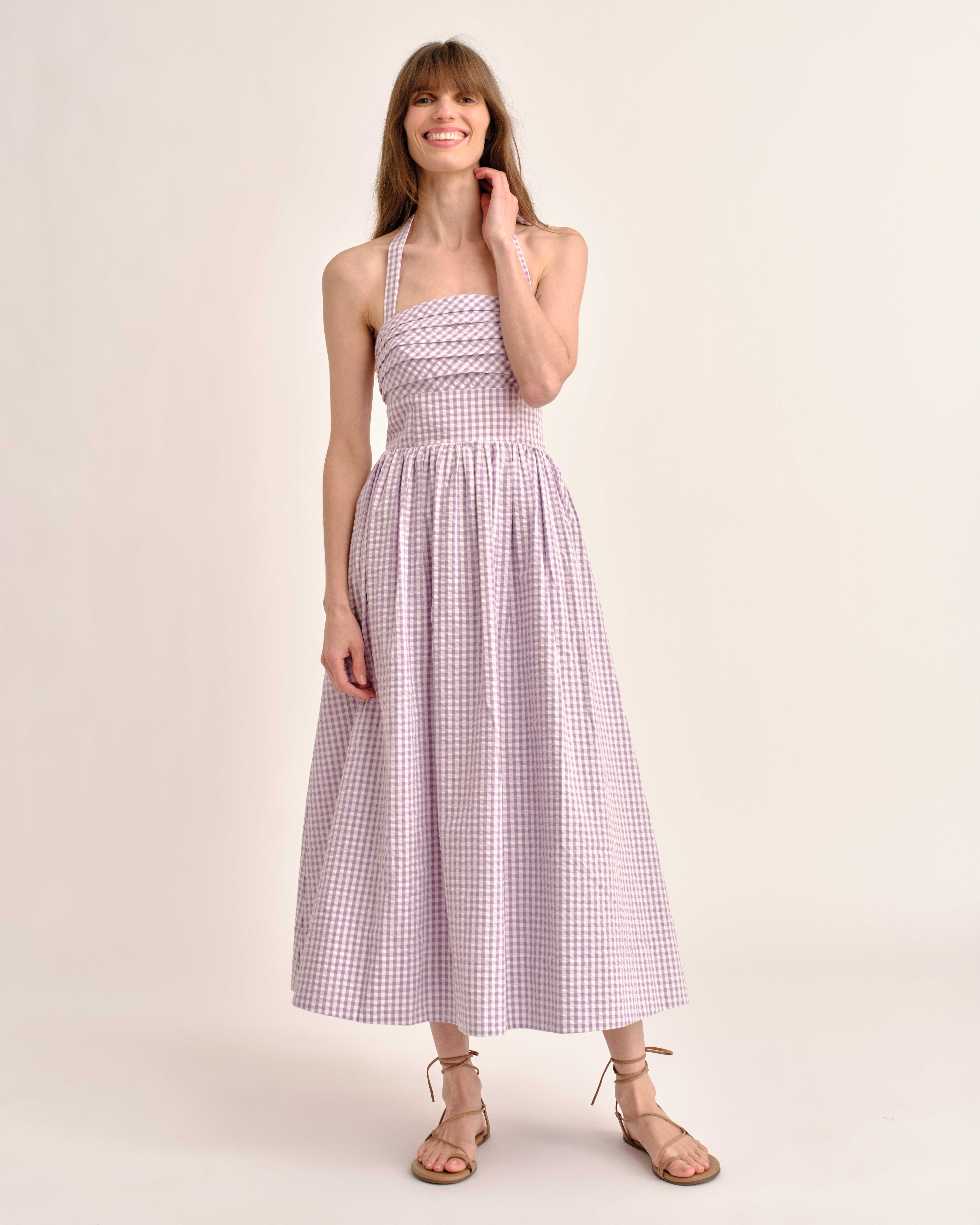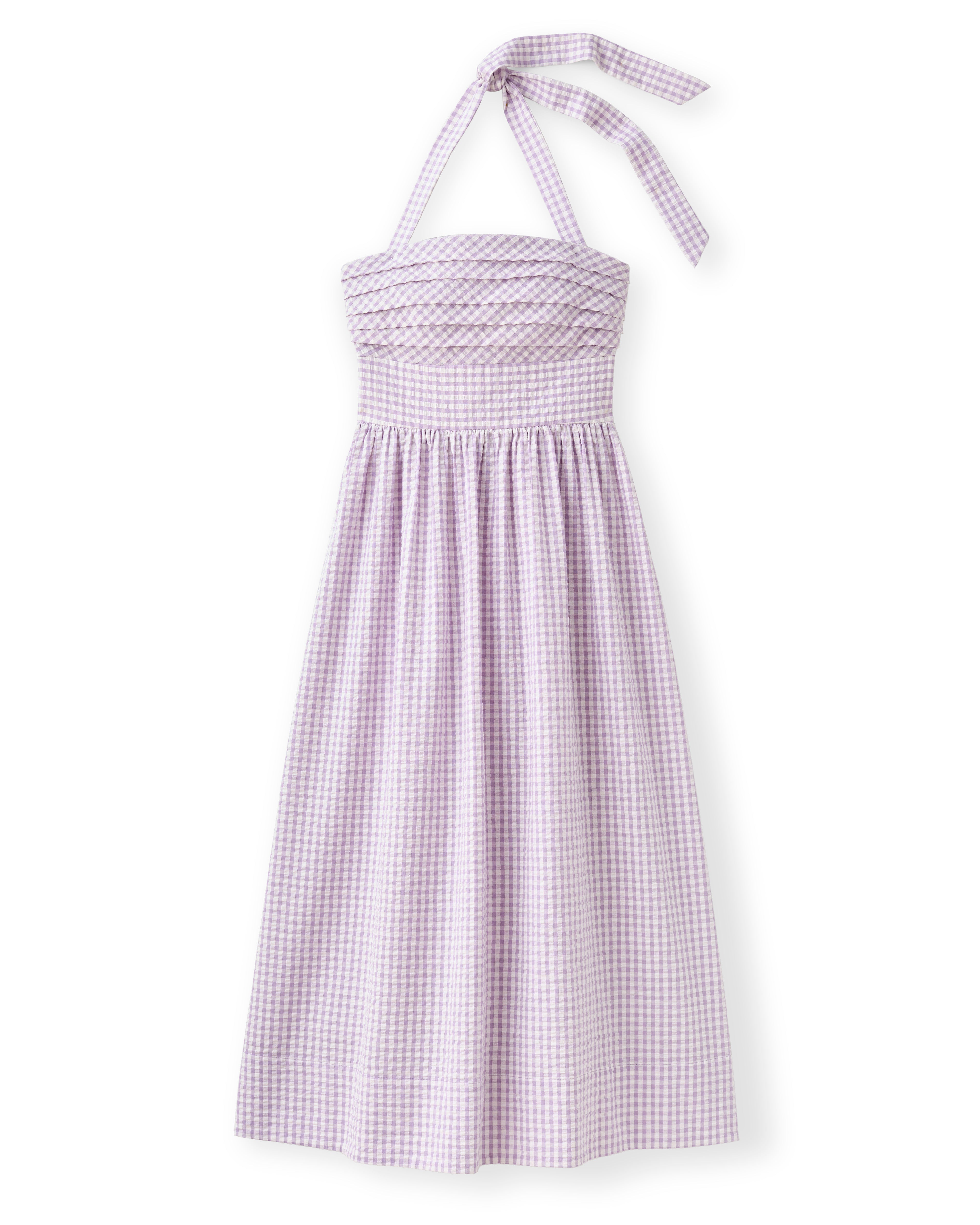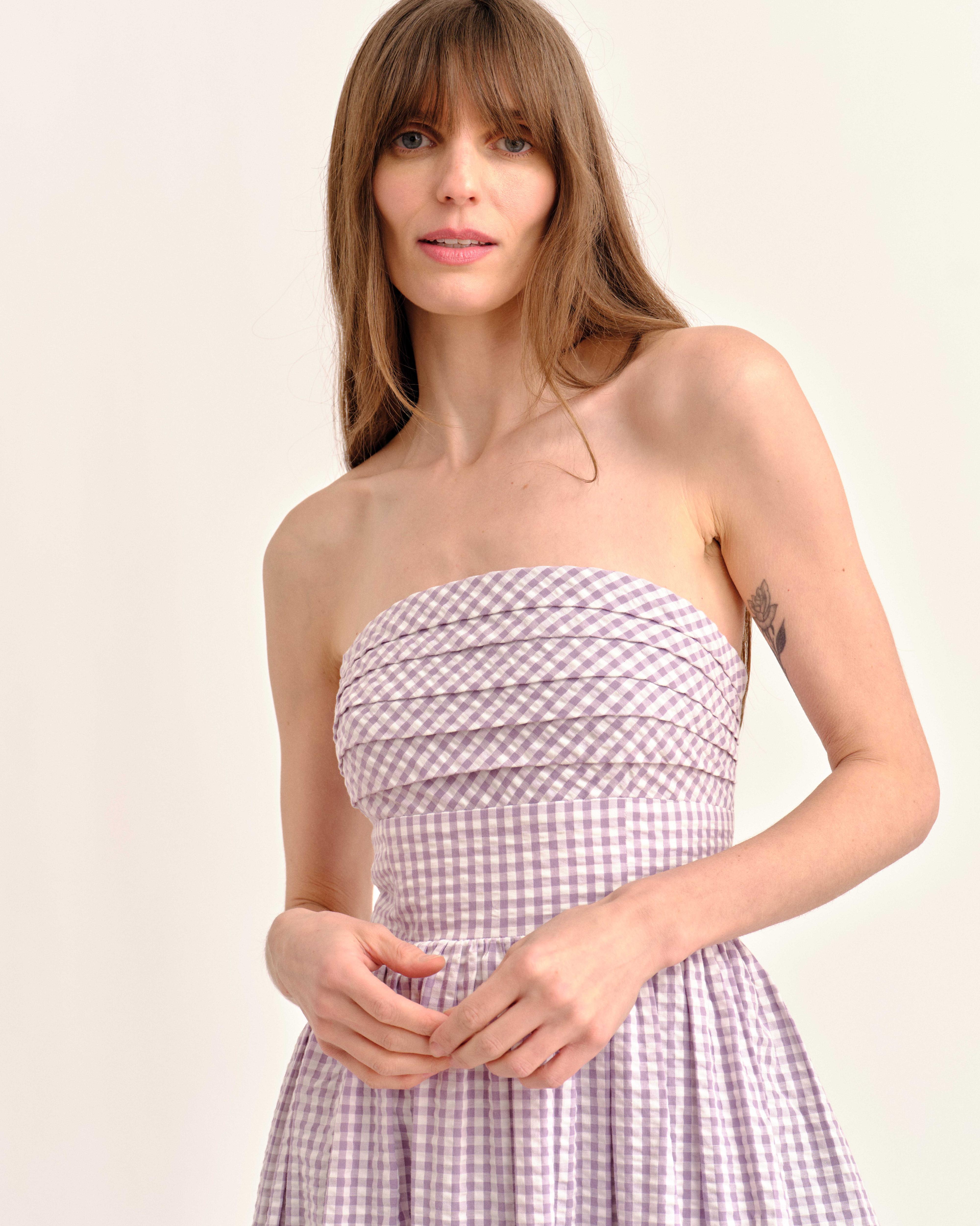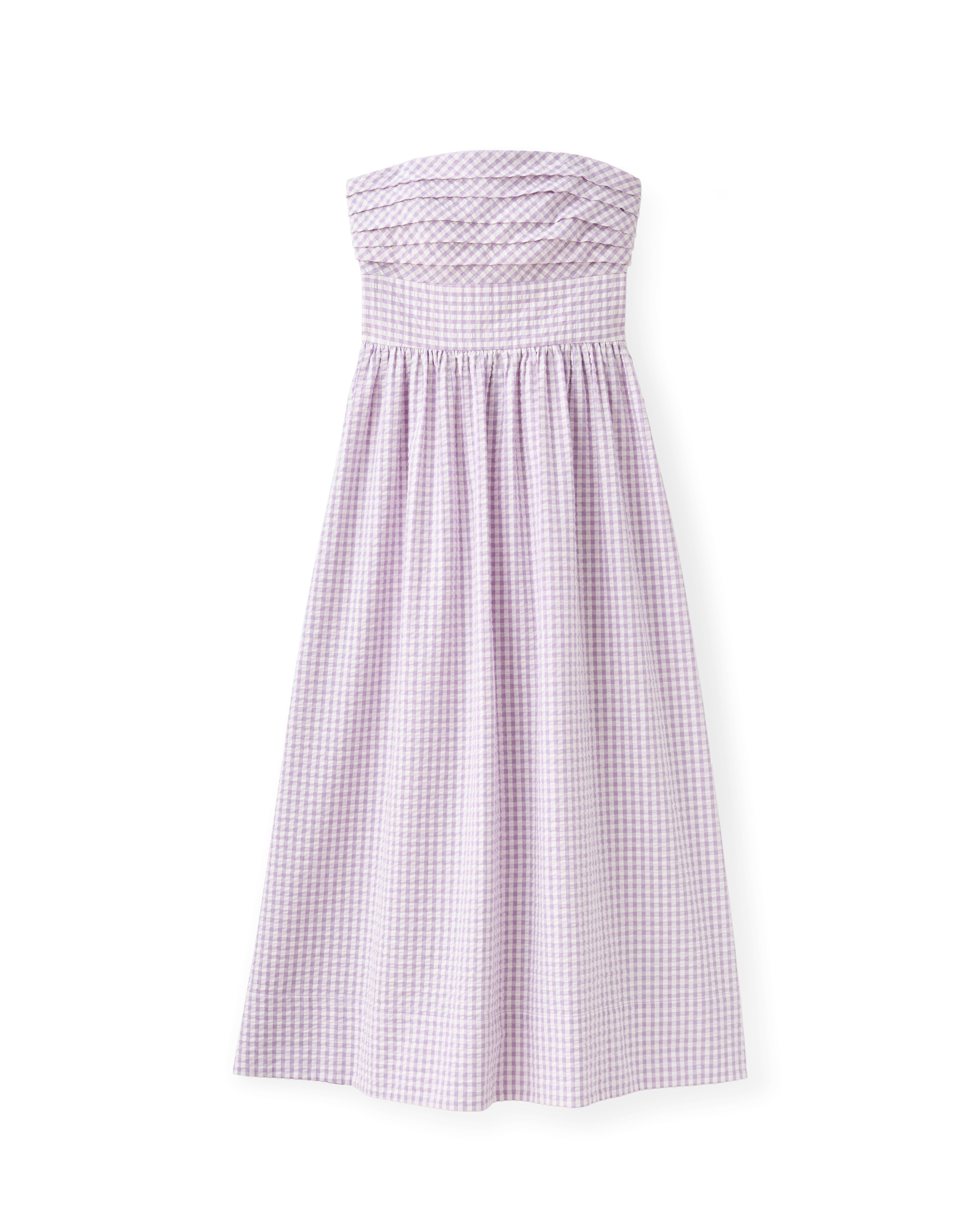 Elevated and sun-ready, the Chalmers Dress reflects the shifting light of the coast through its classic gingham texture. With a detachable strap and artful pleating, it is a versatile piece that moves gracefully from a strapless daytime look to a refined evening silhouette.