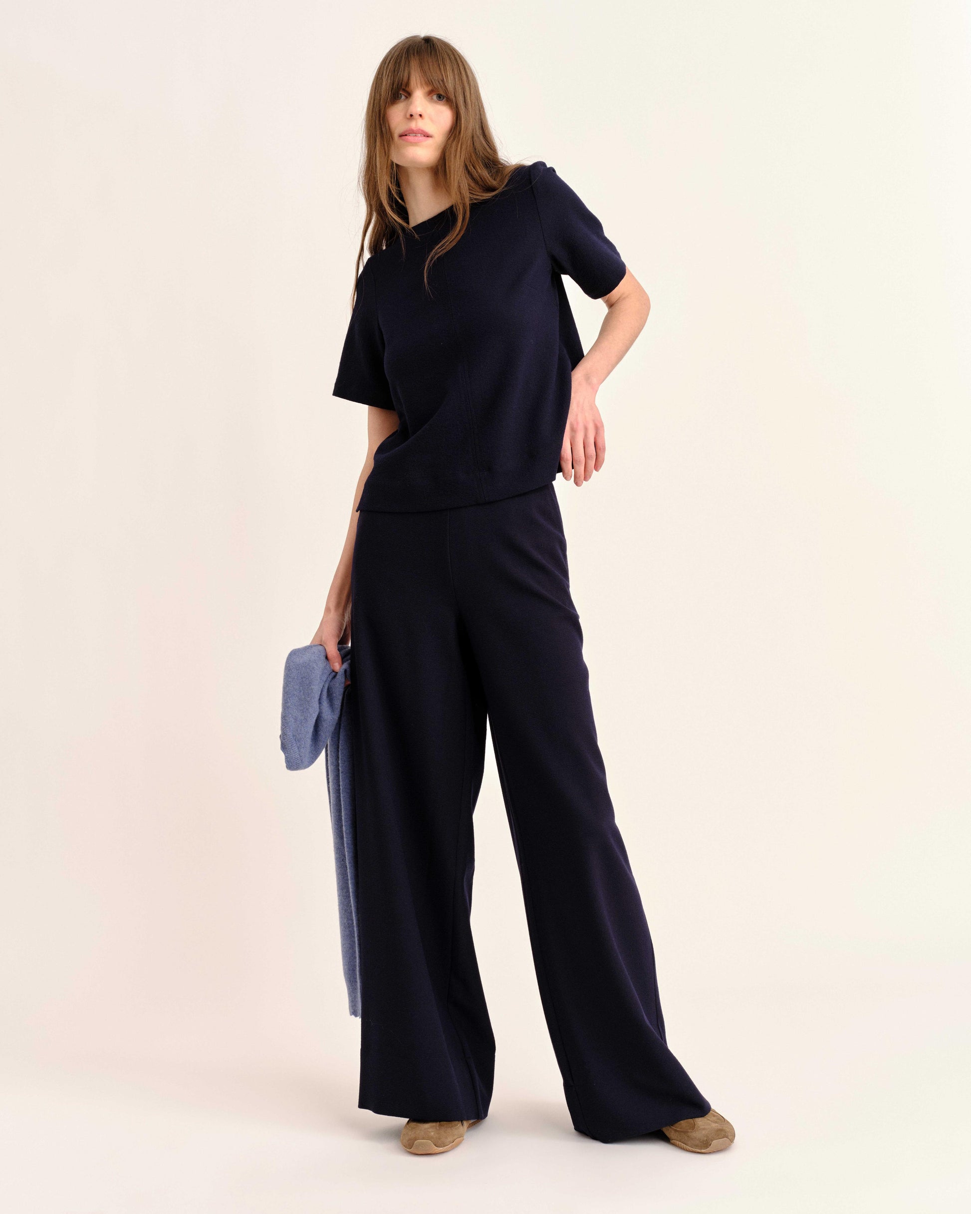 A modern classic that bridges the seasons, the Chloe Top elevates the essential T-shirt silhouette with heavy tonal embroidery. It is a piece meant for quiet coastal evenings, where rich texture speaks louder than color.