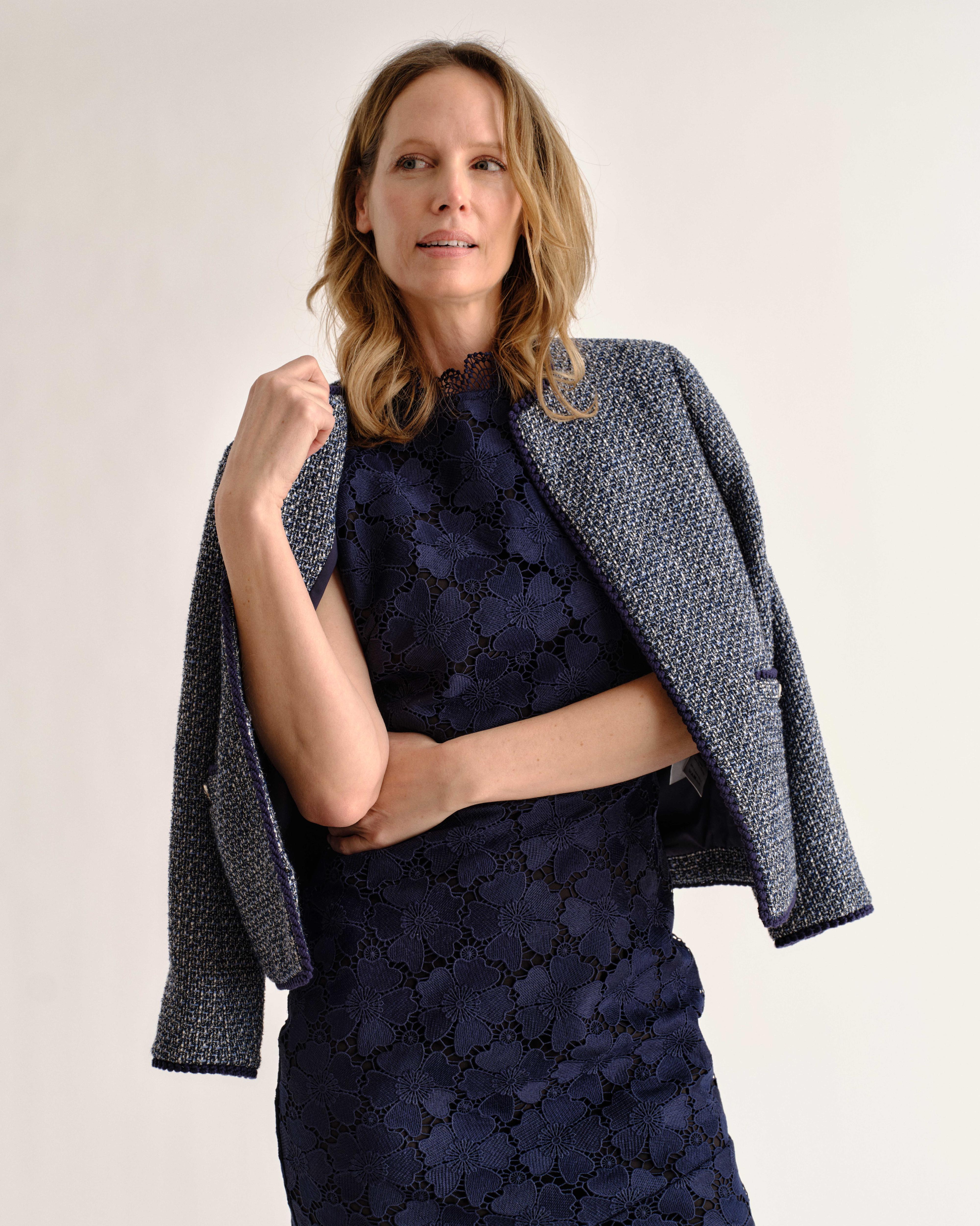 • Partial contrast lining and center-back zipper provide structure and depth