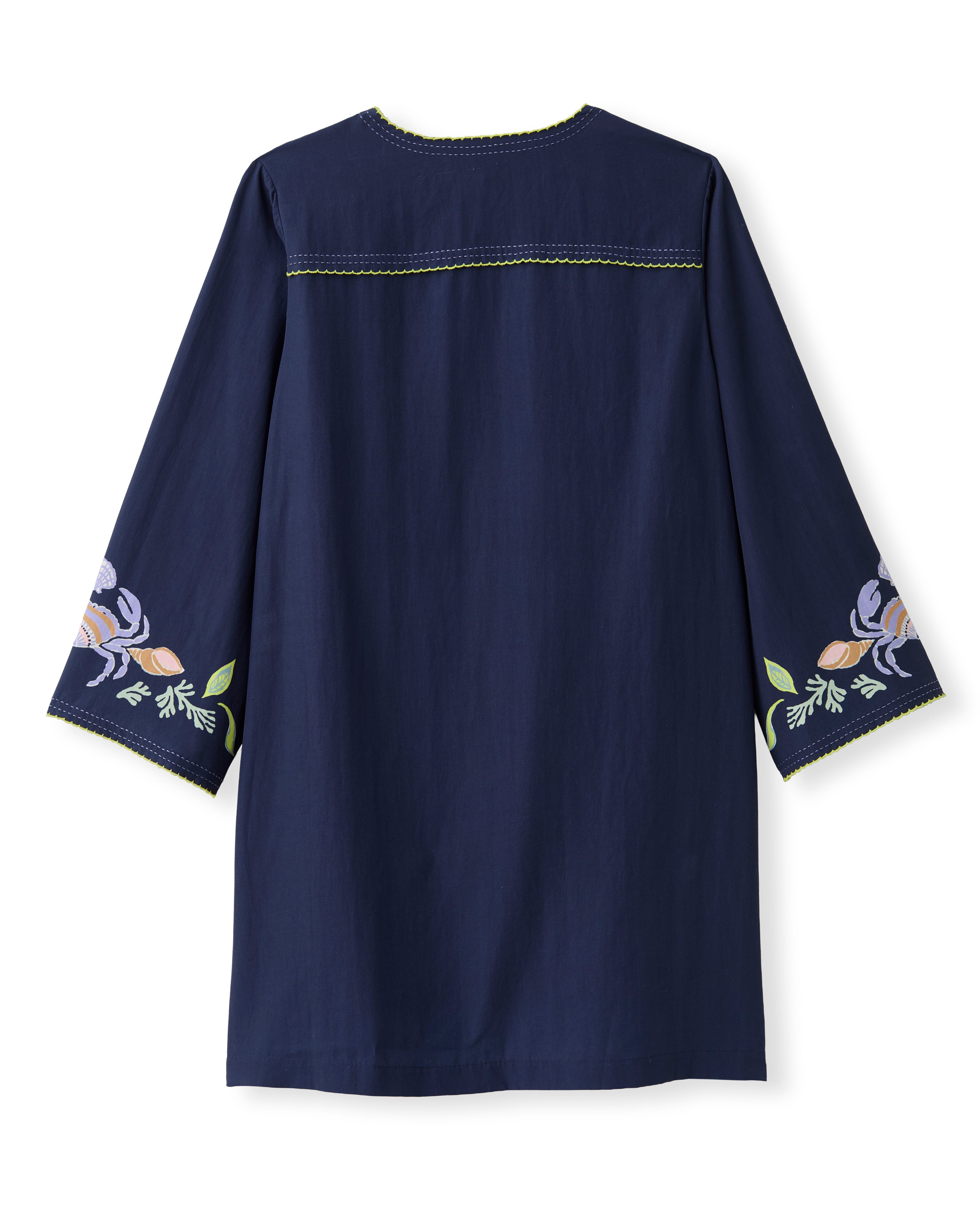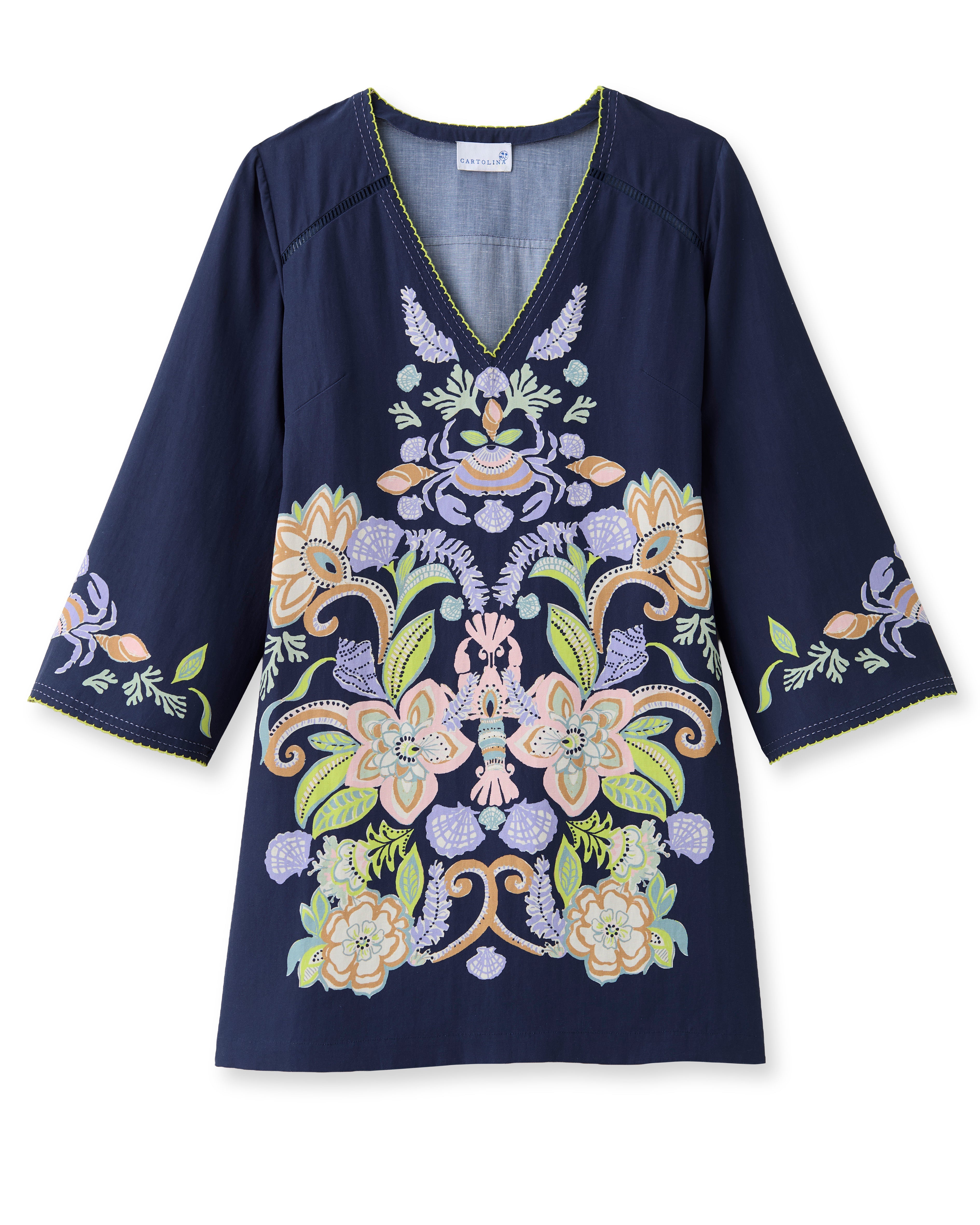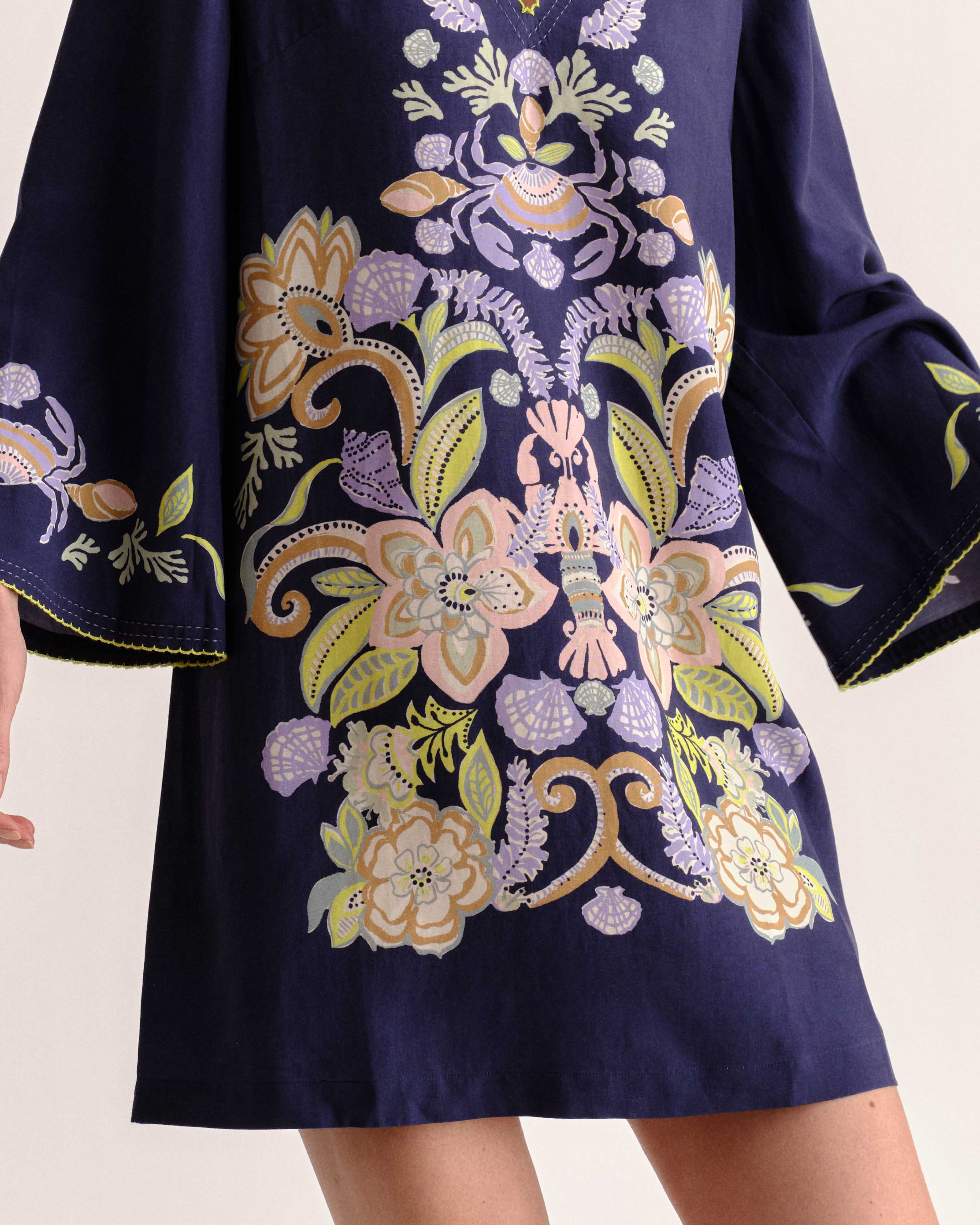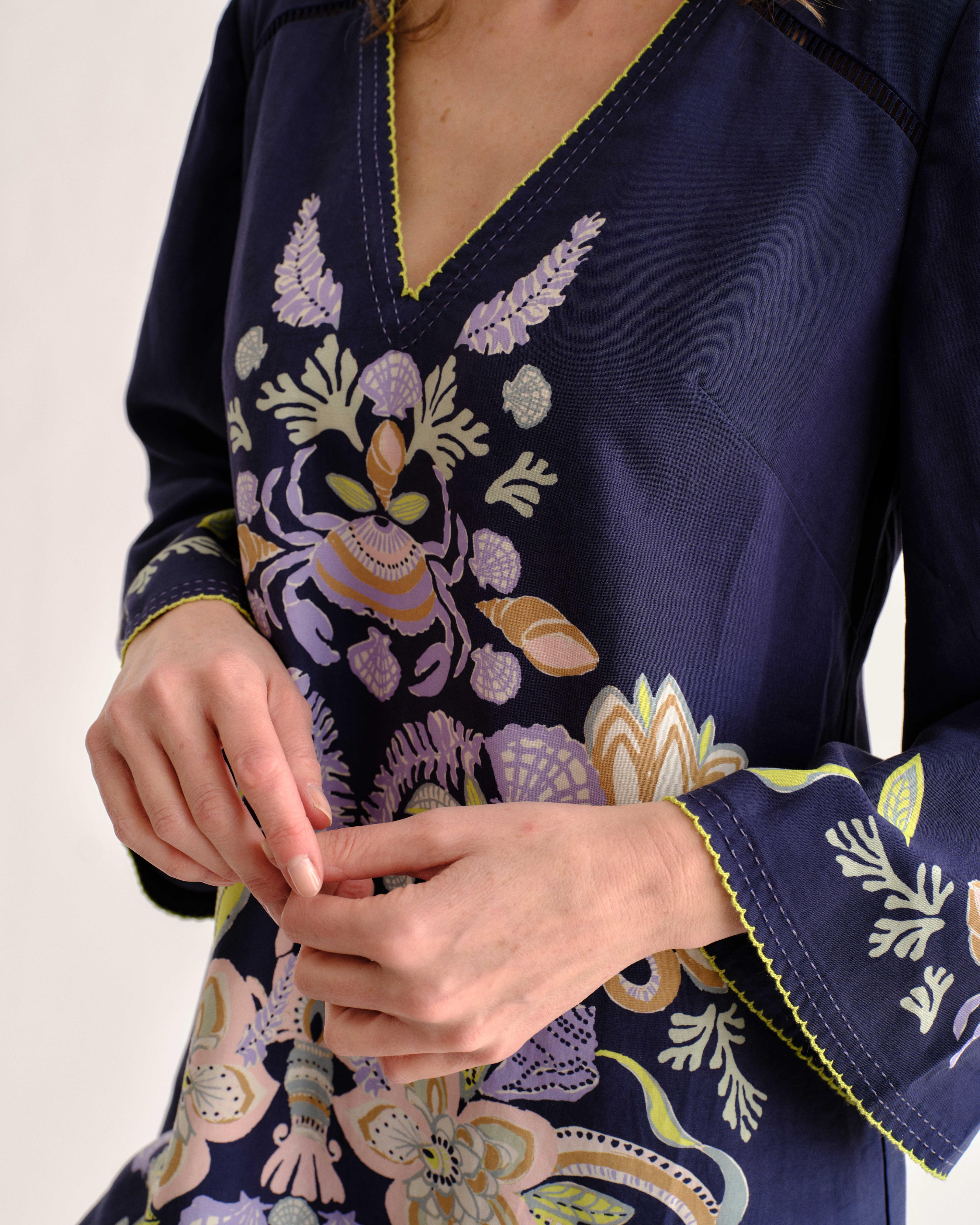 The Folly Mini Dress unfolds with a romantic, tunic-style charm, where custom-placed artwork and delicate contrast stitching create a look that feels both nostalgic and chic. It is the perfect companion for the first light of a coastal spring morning.