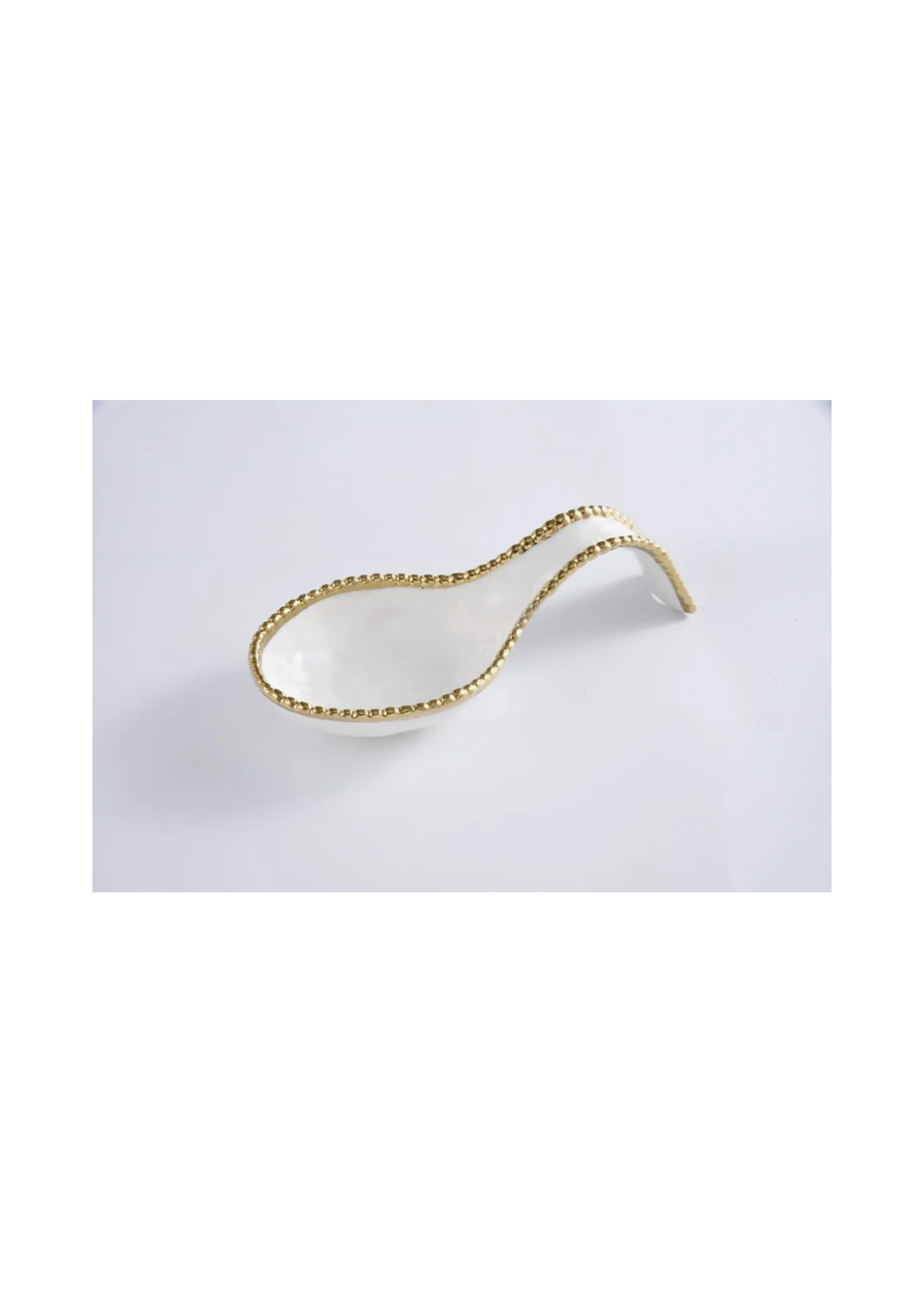 Stunning and practical, this is the ultimate dinner accessory. After serving your guests, rest your serving utensils on the spoon rest with no fuss or mess. Striking and effortlessly classy, this is a must have item for any dinner party. Also great for buffets and for the cook who likes to keep a tidy kitchen. Gleaming white porcelain with lustrous gold beads in titanium. Food safe, dishwasher safe, oven safe to 550°. Tarnish and stain-free. Easy Care.