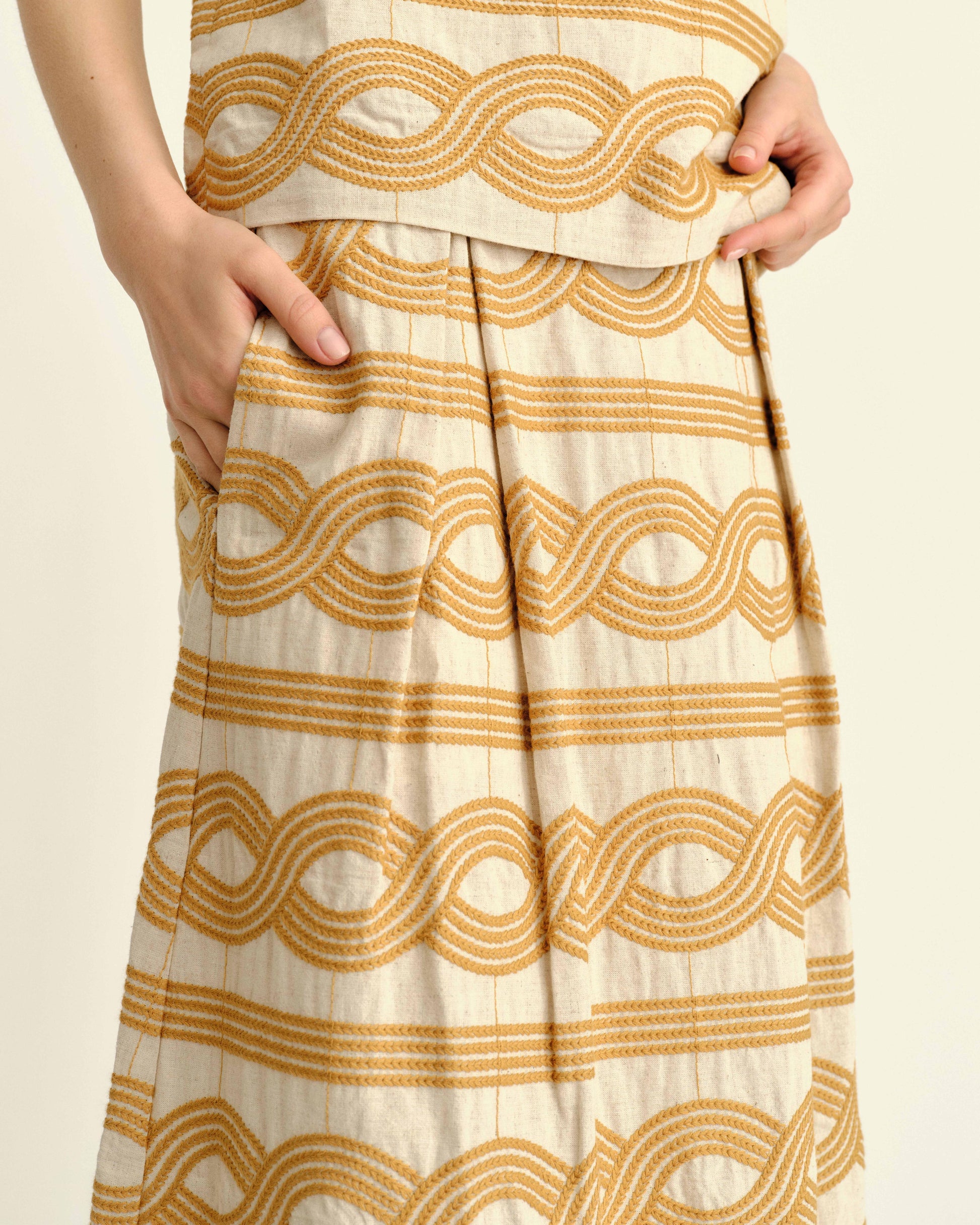Elegant midi-length sweep crafted from a beautifully embroidered specialty linen blend