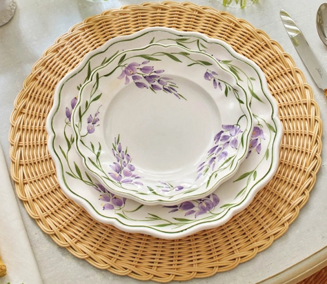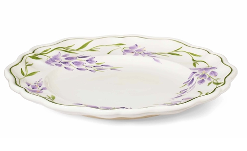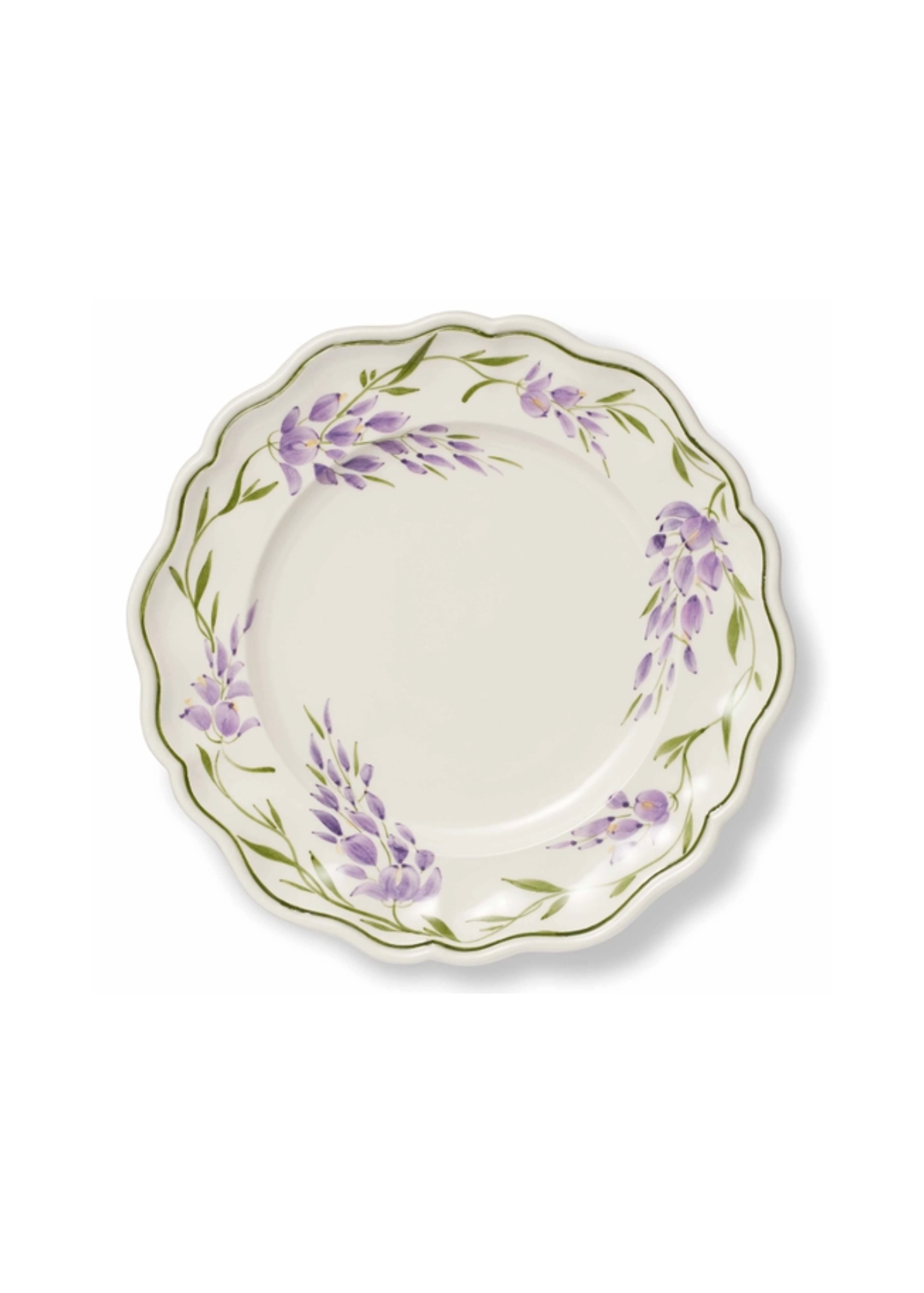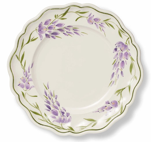 Crafted in Italy, this attractive dinner plate was inspired by the vibrant wisteria flower. The hand painted floral design has an artisanal quality and includes a matching trim around the scalloped edge. A charming addition to a table setting when entertaining.